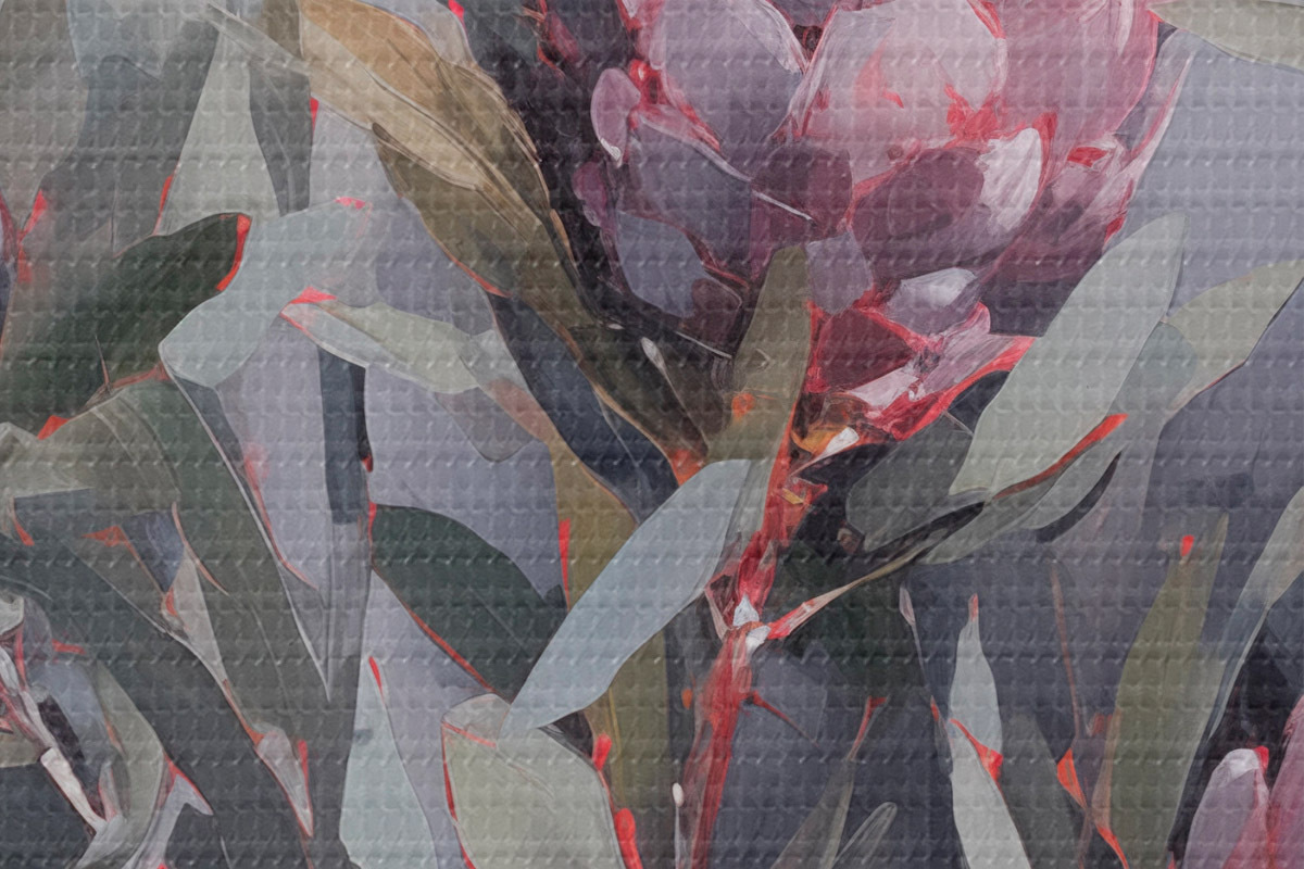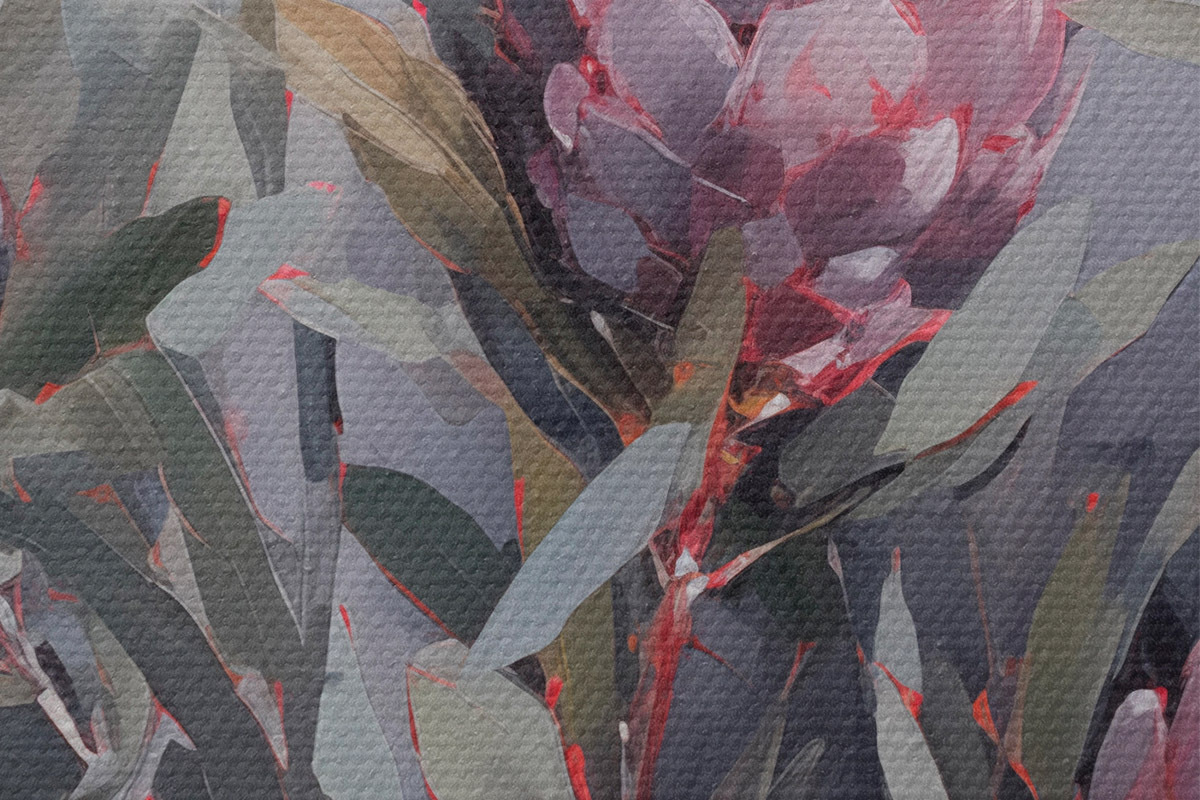 Nuotrauka Rožinės protea gėlės su žaliais lapais, minkšti potėpiai, tamsios spalvos, elegantiška kompozicija Nr r44400
