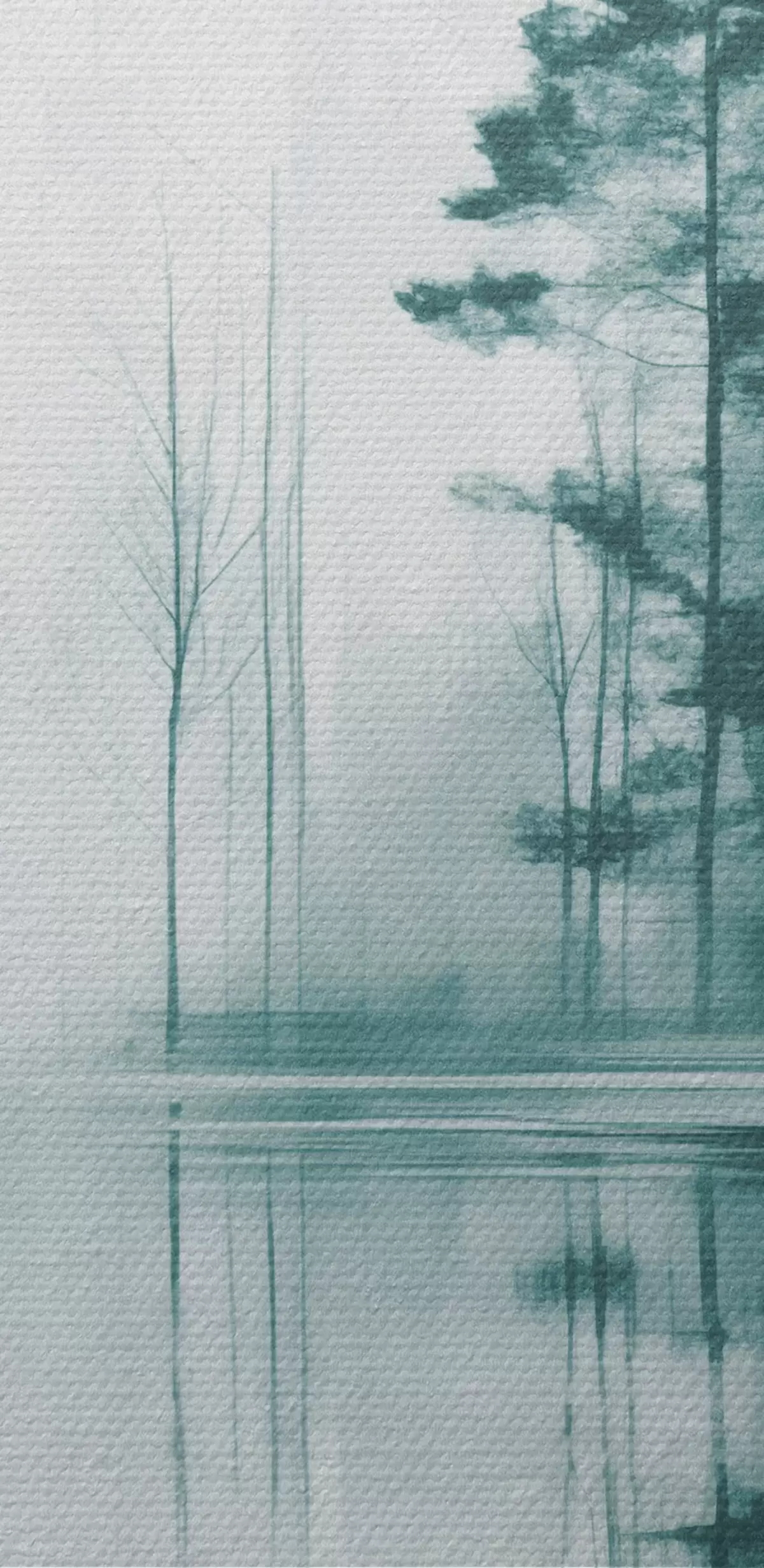 Nuotrauka Abstraktus miškas su aukštais medžiais, atsispindinčiais vandenyje, prislopinta spalvų paletė Nr r44403