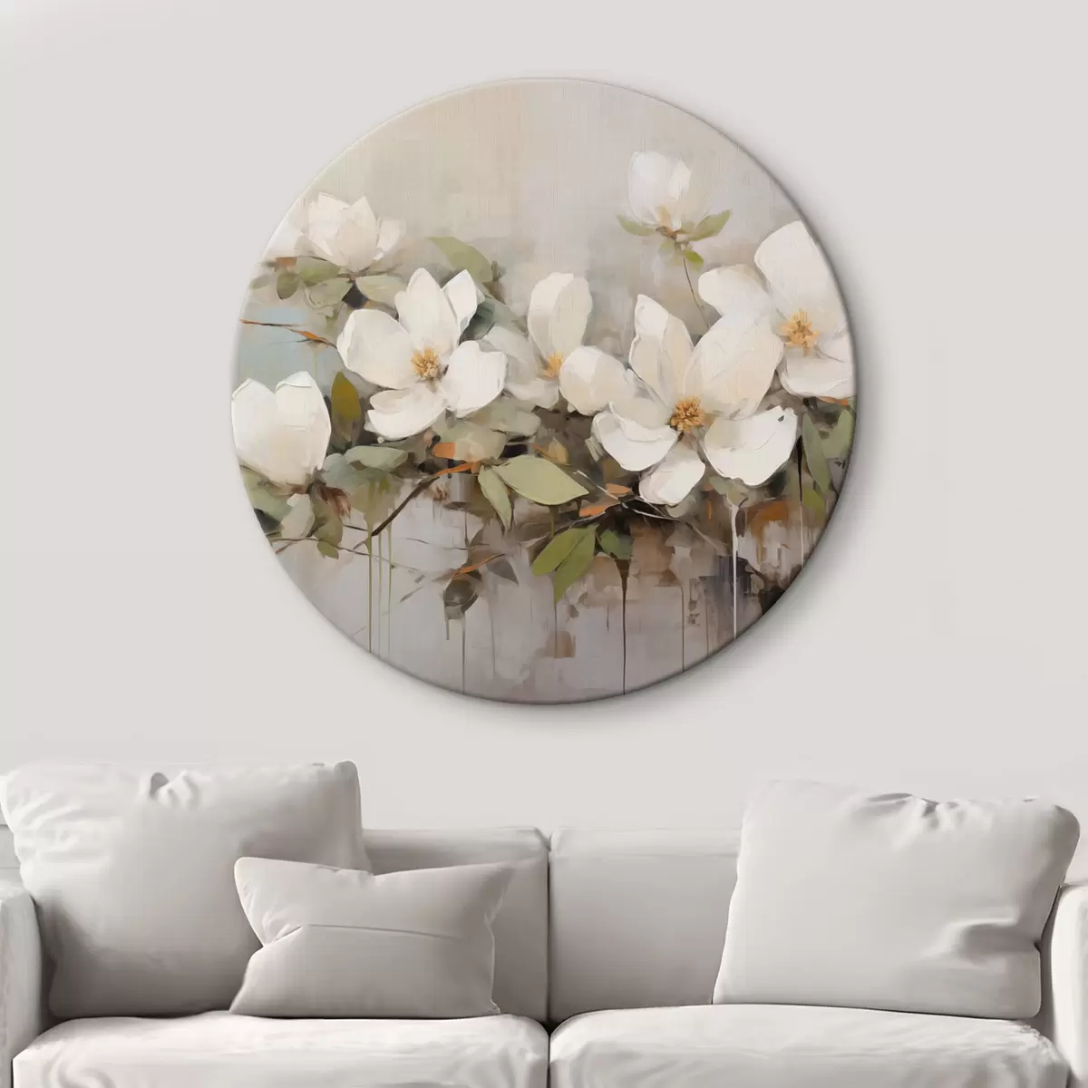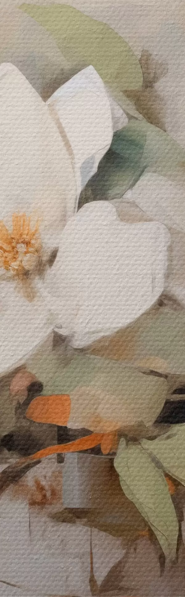 Nuotrauka Baltos magnolijos žiedai su žaliais lapais ant šakos, švelnūs potėpiai, prislopintos spalvos Nr r44404