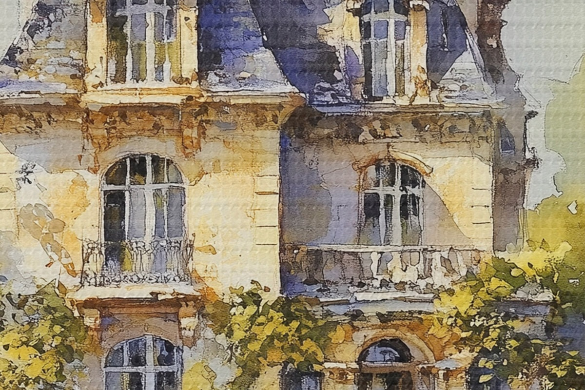 Nuotrauka Prancūzijos kaimo namelis, akvarelės stilius, levandų laukai Nr r44501