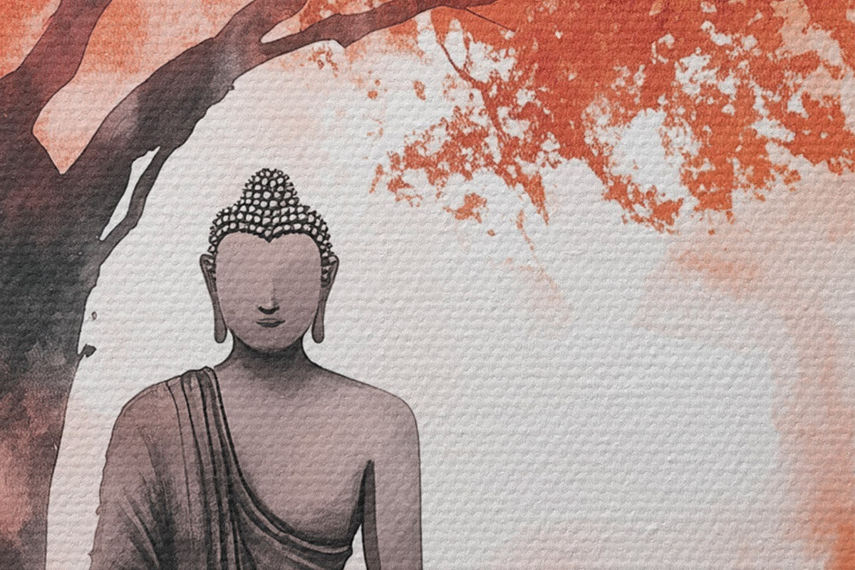 Nuotrauka Buda sėdi po medžiu, meditacija, dvasinis, oranžinės spalvos Nr r44512