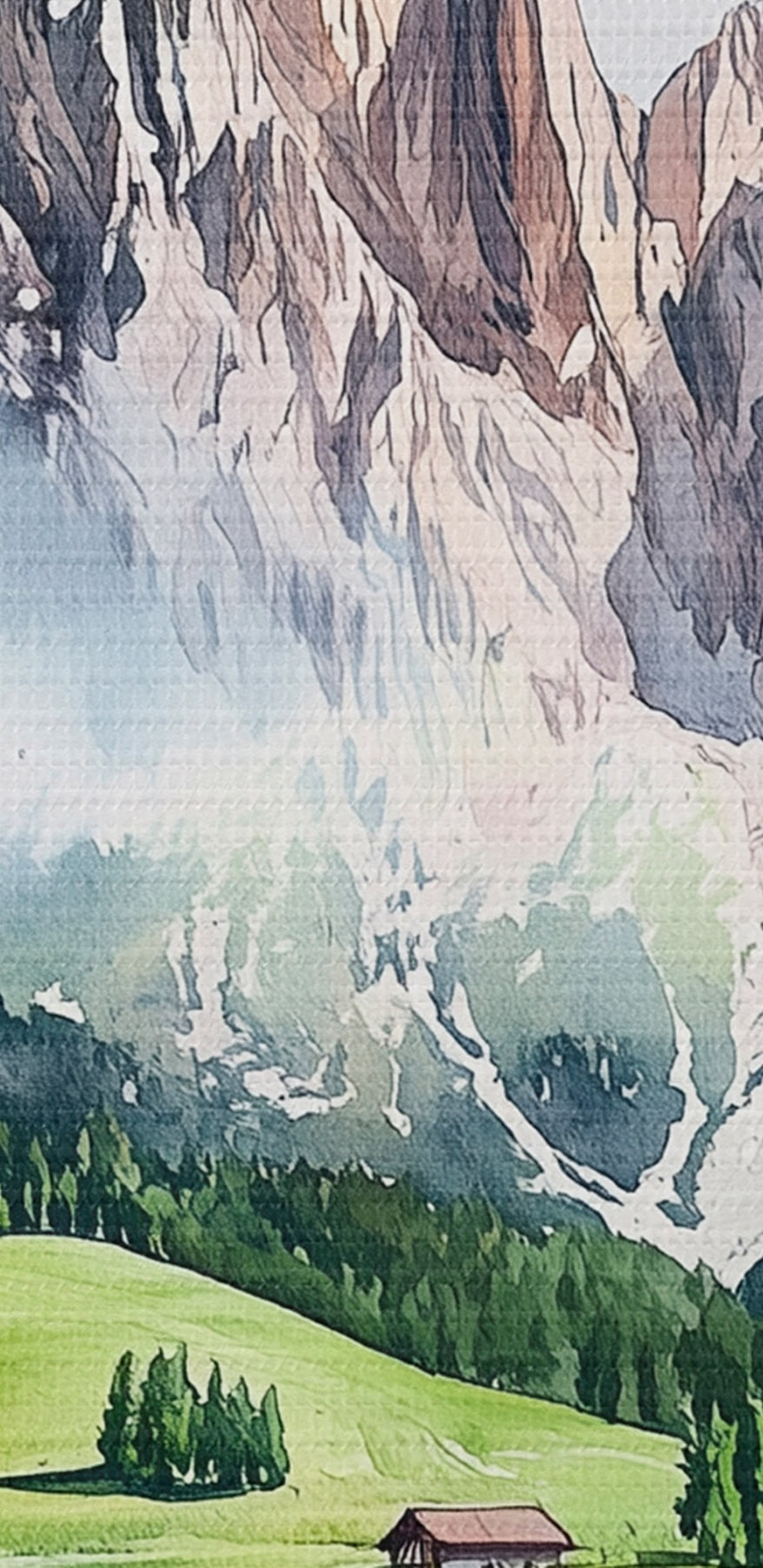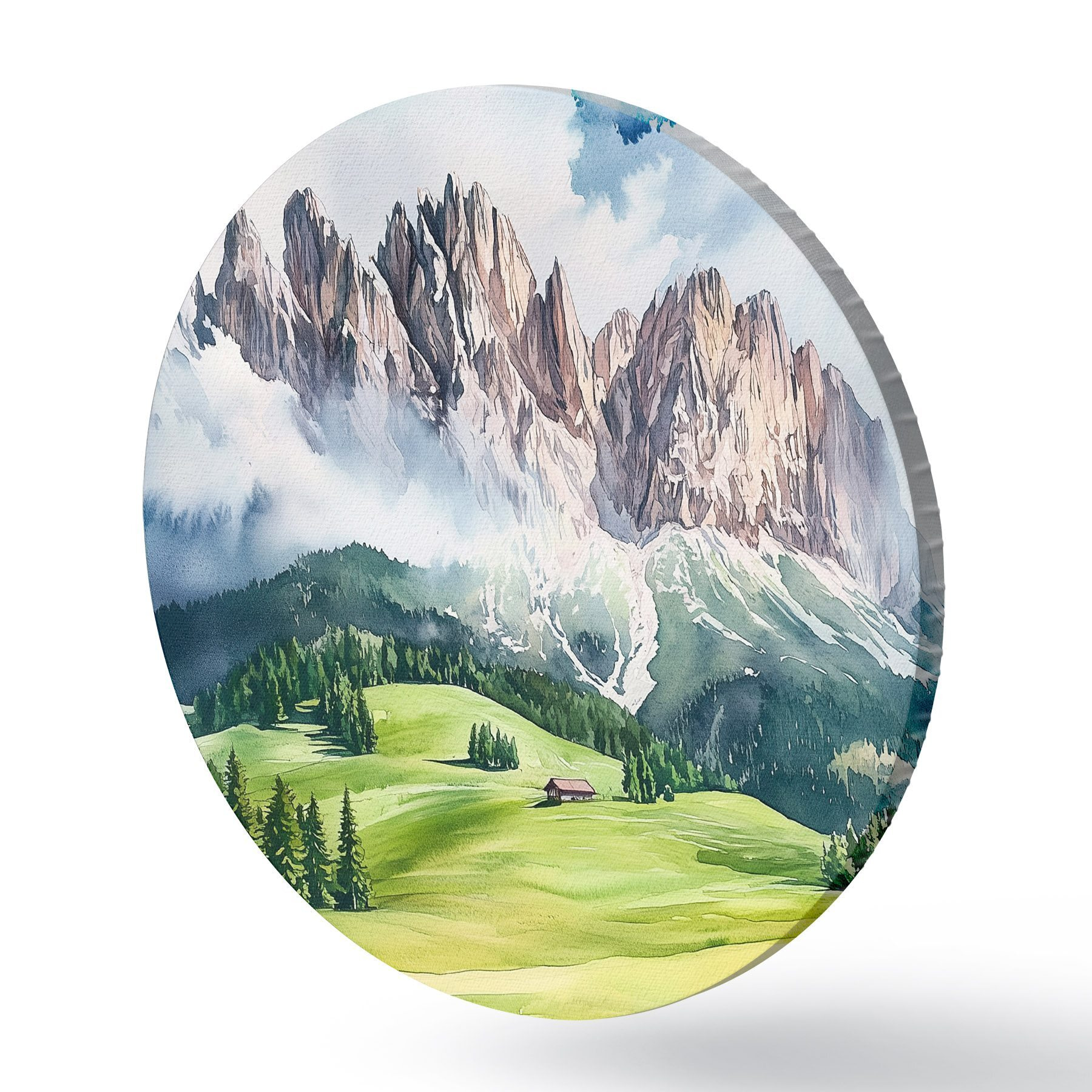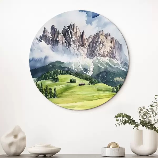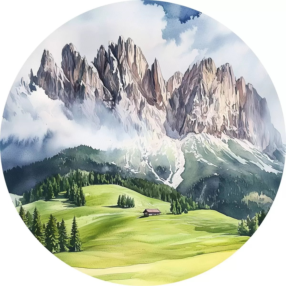 Apvalūs paveikslai Dolomitai, Alpių kalnai, Italija, kraštovaizdis, akvarelės stilius r44601