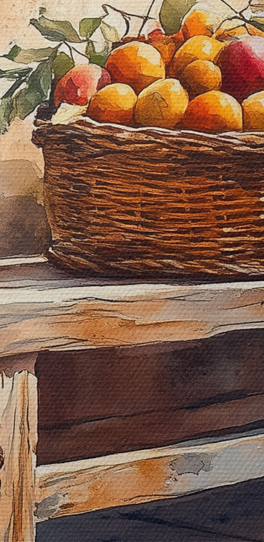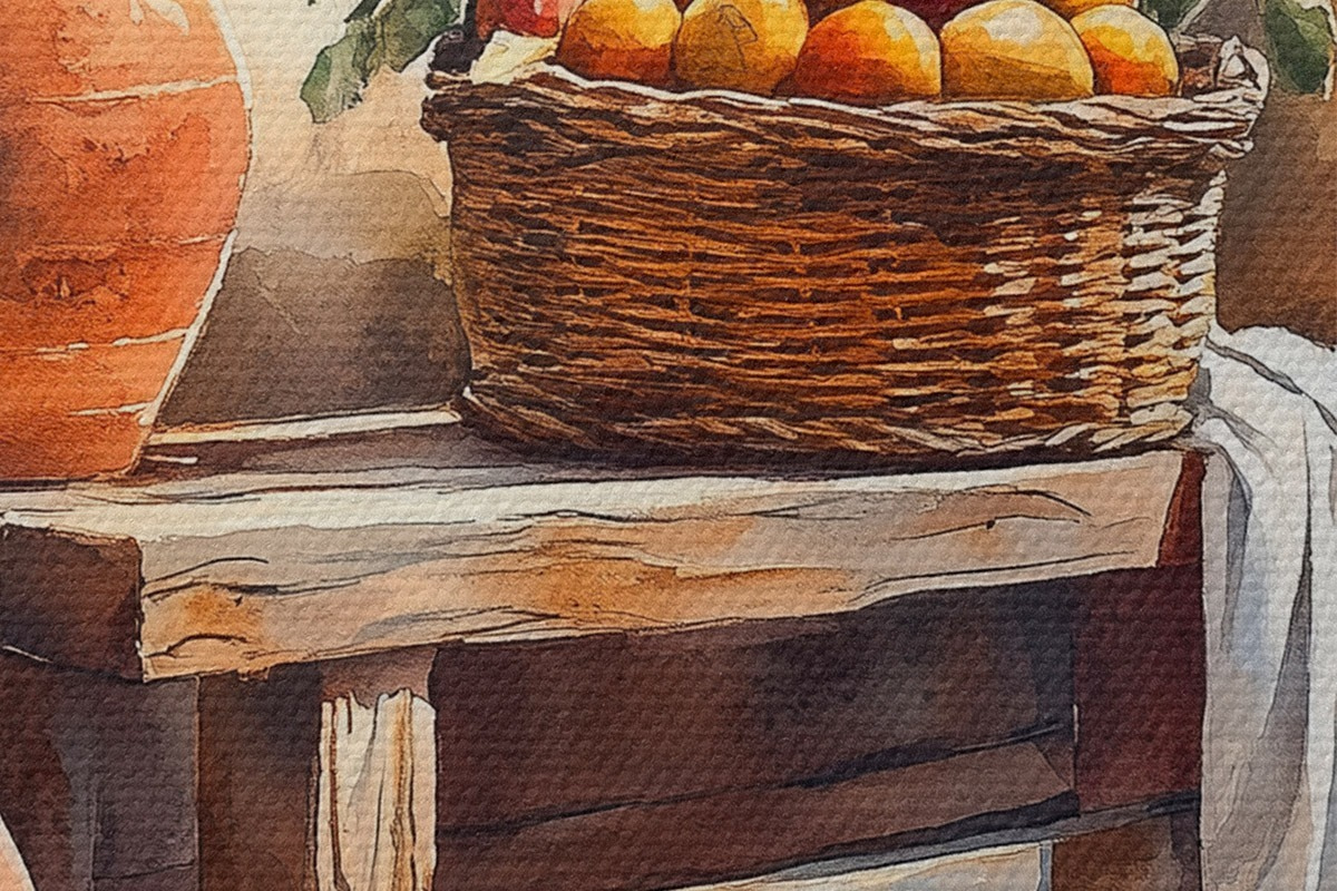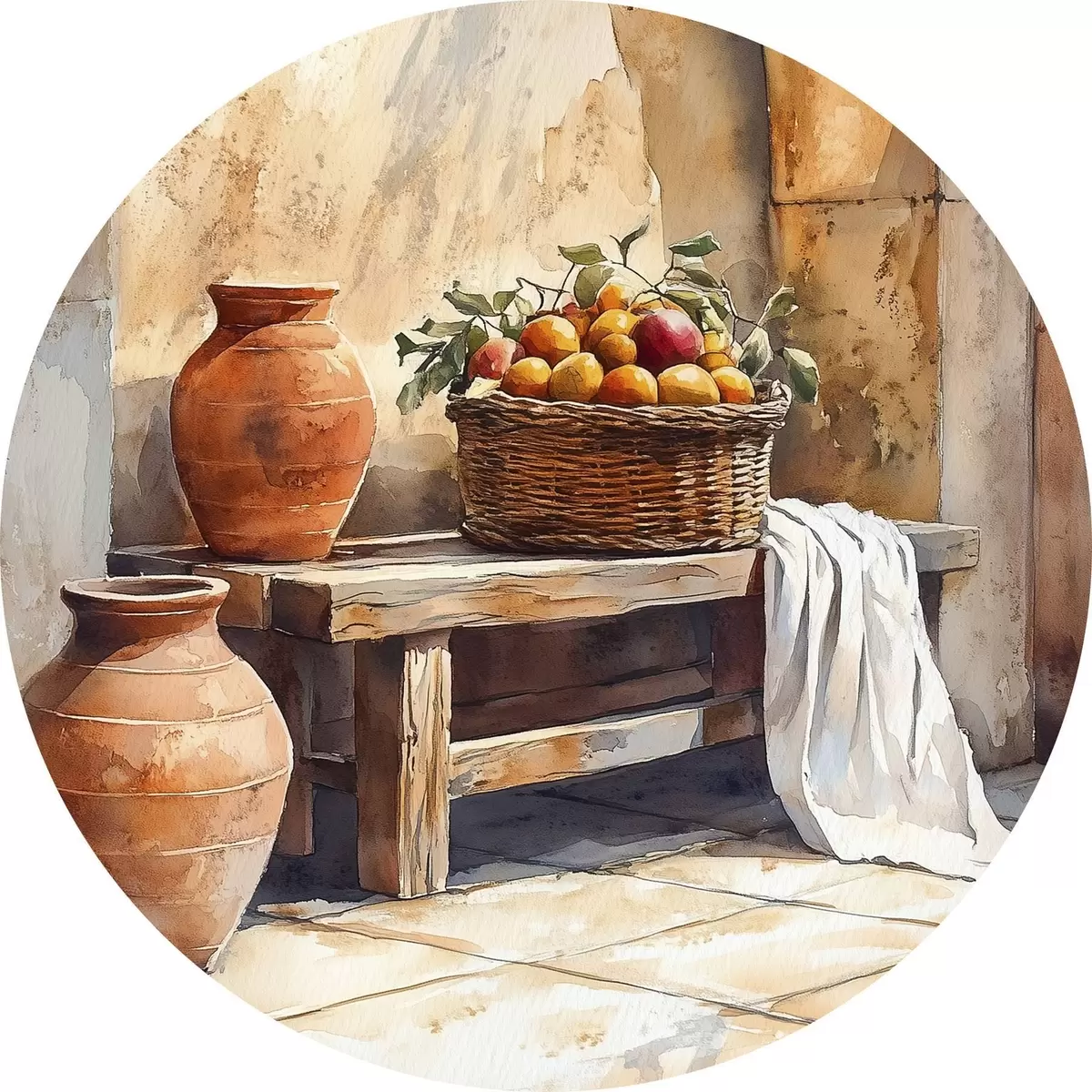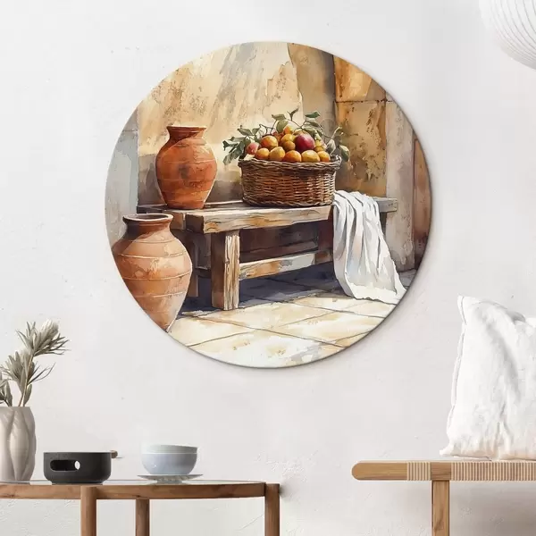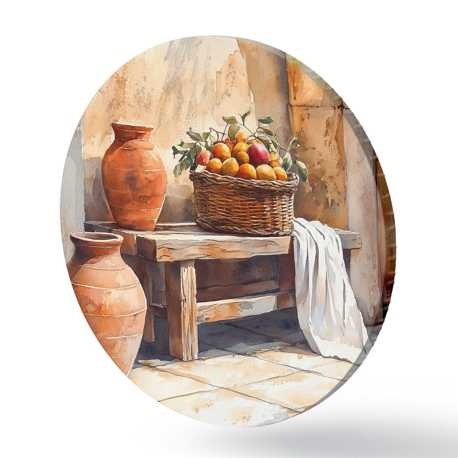 Nuotrauka Estetiškos vazos ir pintas krepšys su apelsinais, Toskana, kaimiškas stilius Nr r44605
