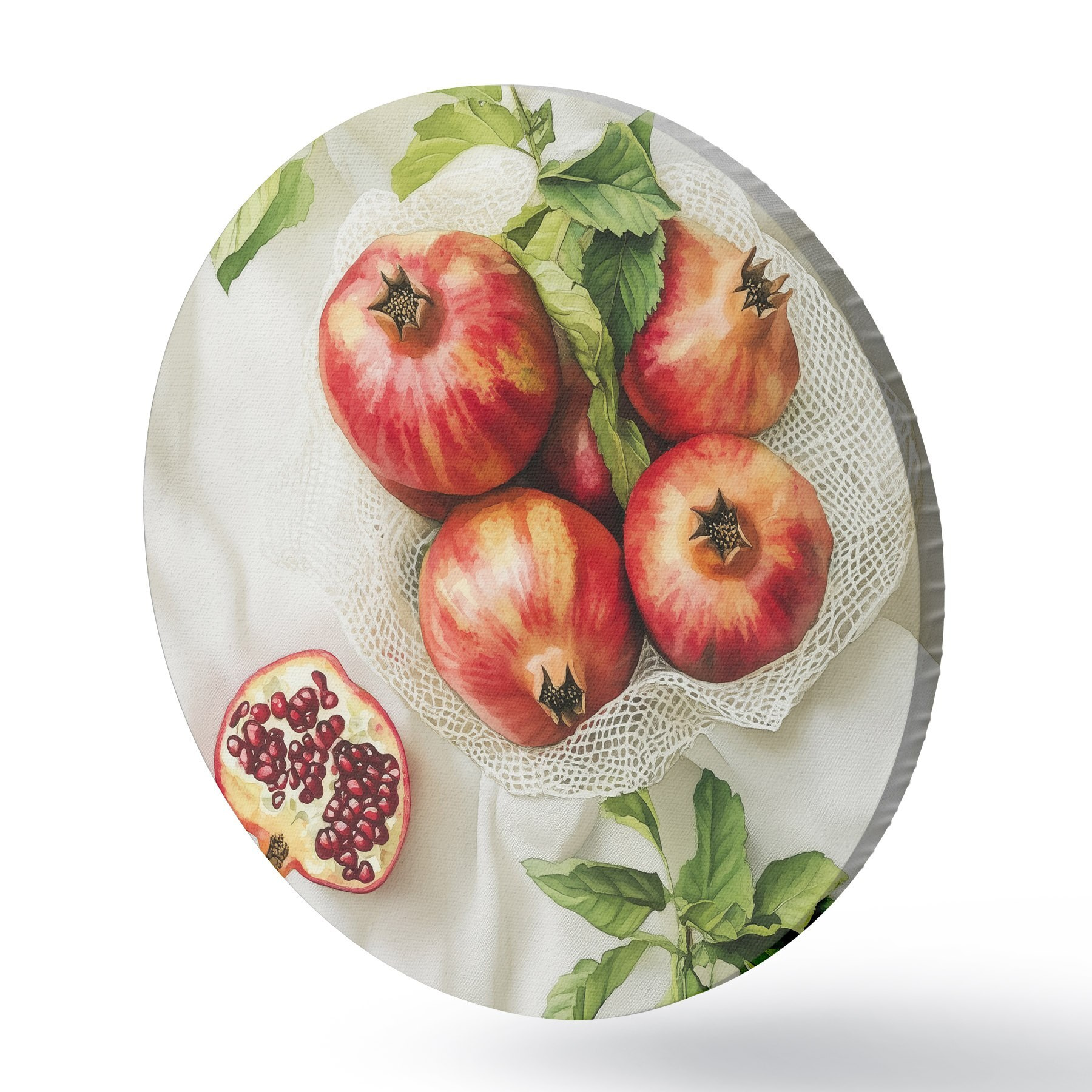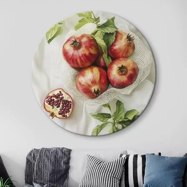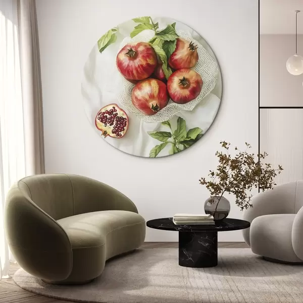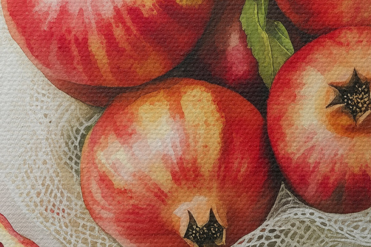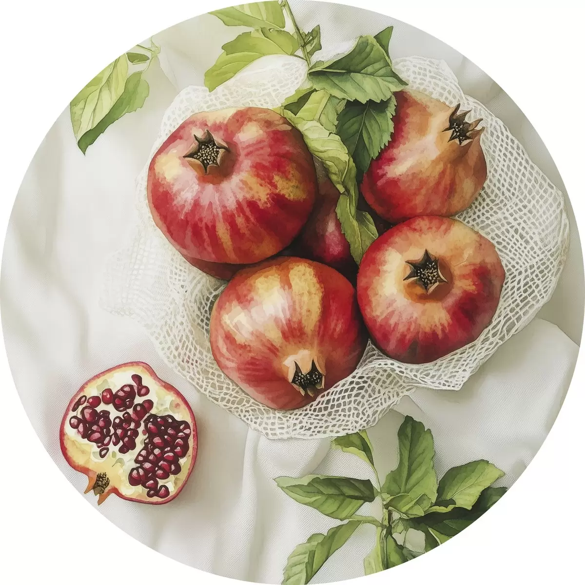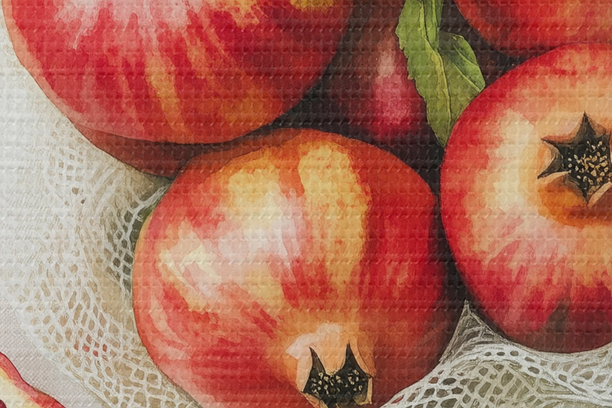 Nuotrauka Granatai su mėtų lapeliais ant lininės staltiesės, kaimiškas stilius Nr r44611
