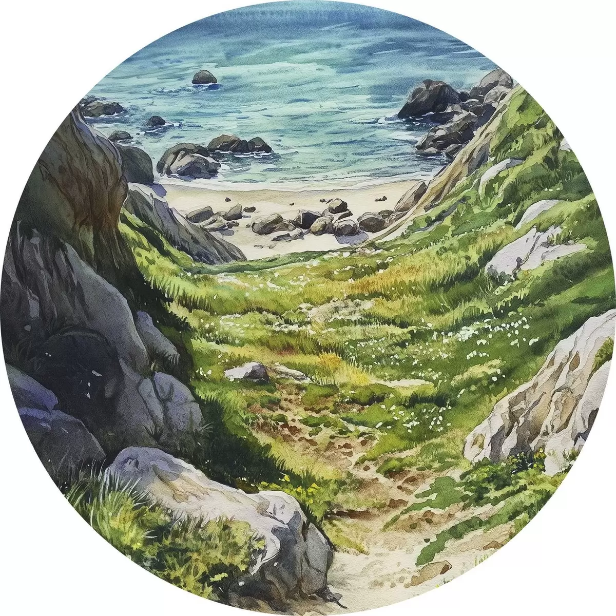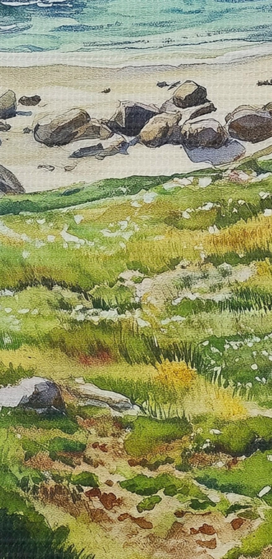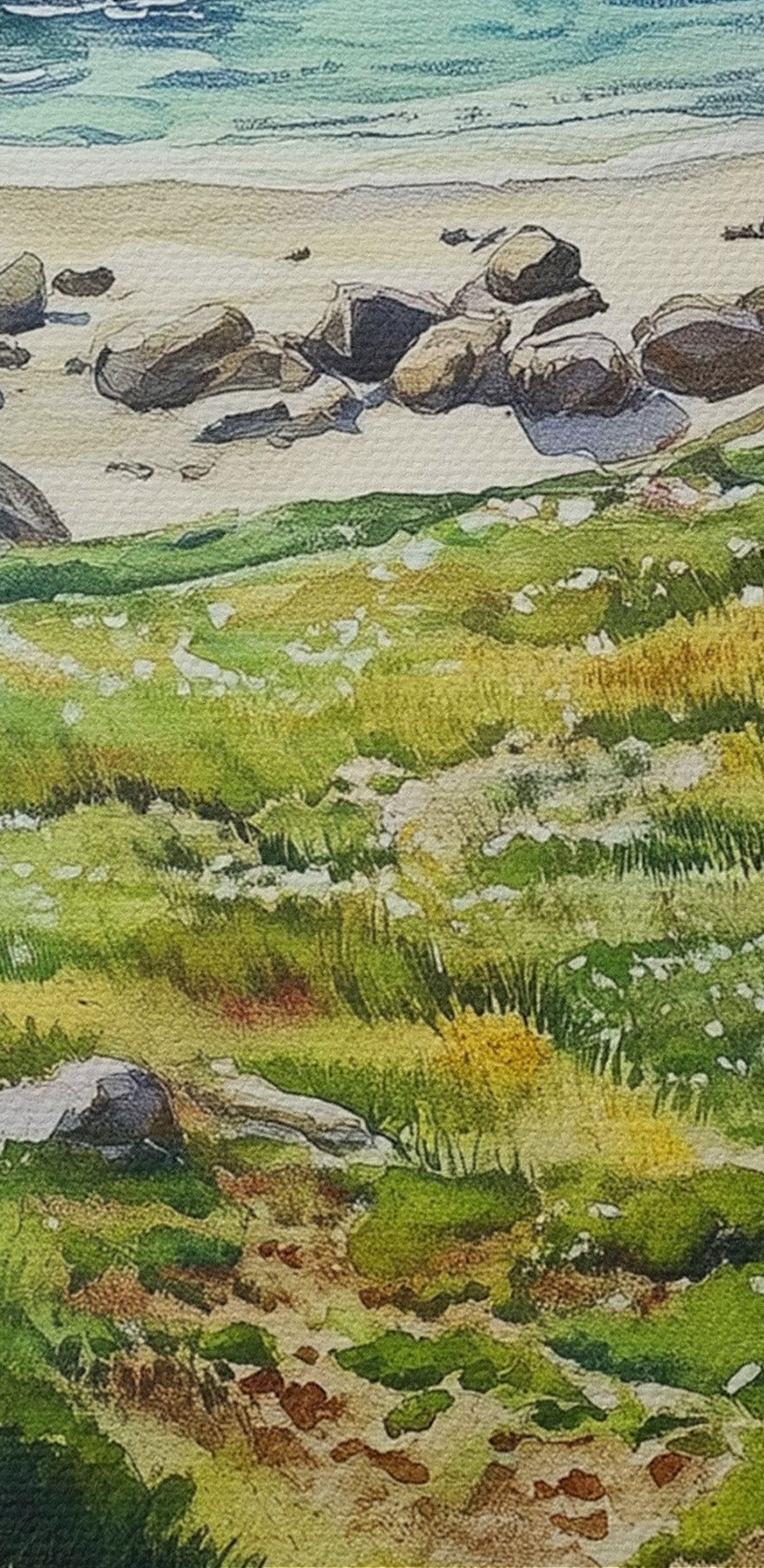 Nuotrauka Jūros pakrantė su akmenimis ir žalia žole, akvarelės stilius, vasara Nr r44616