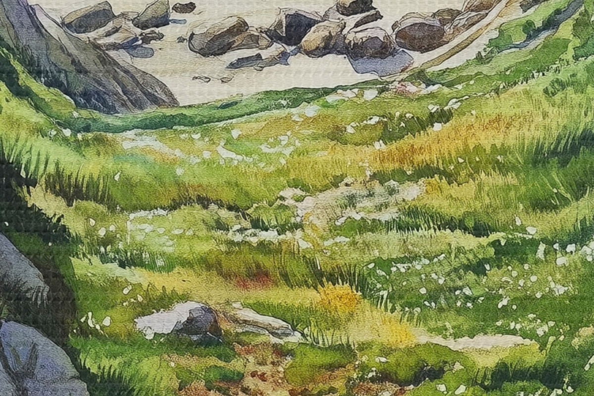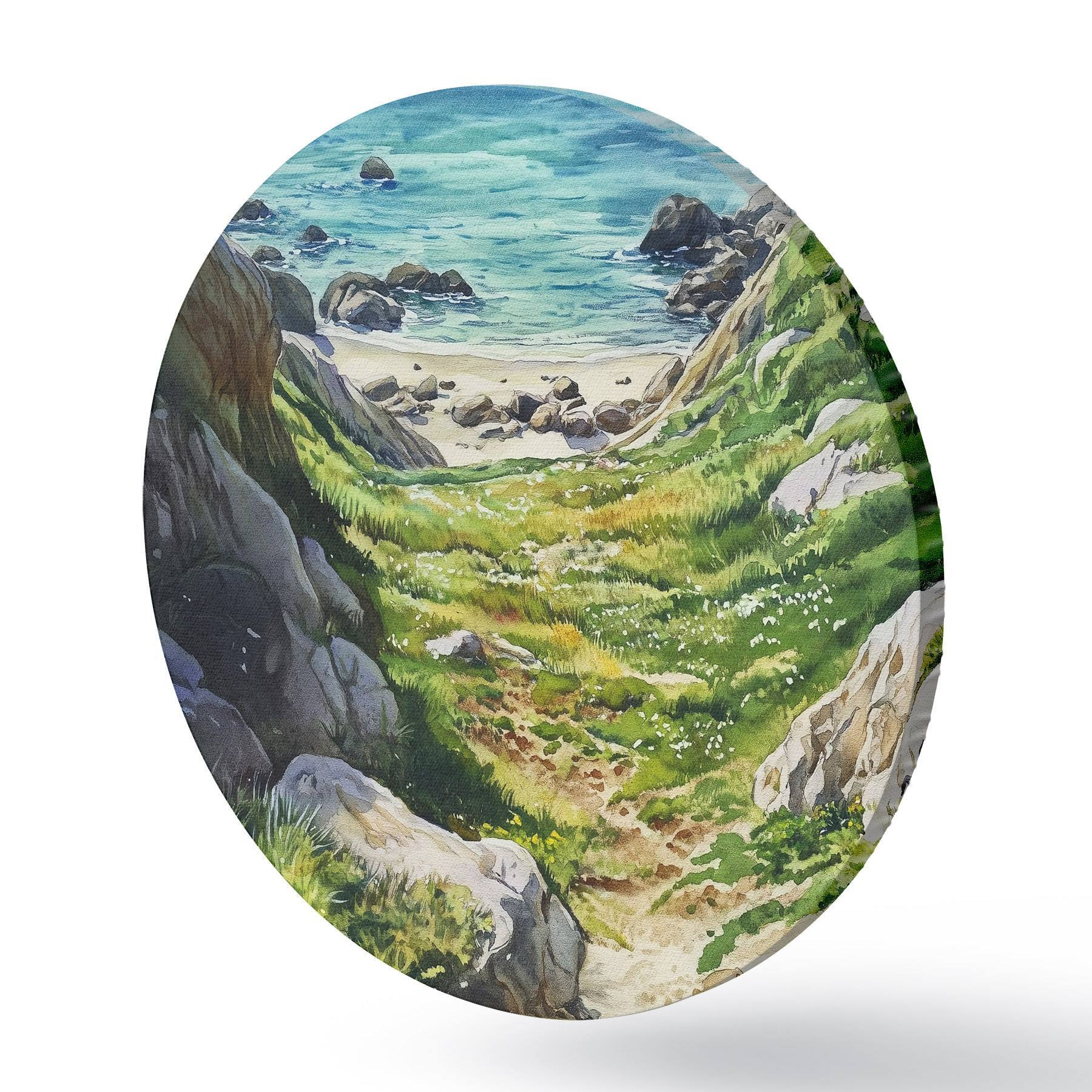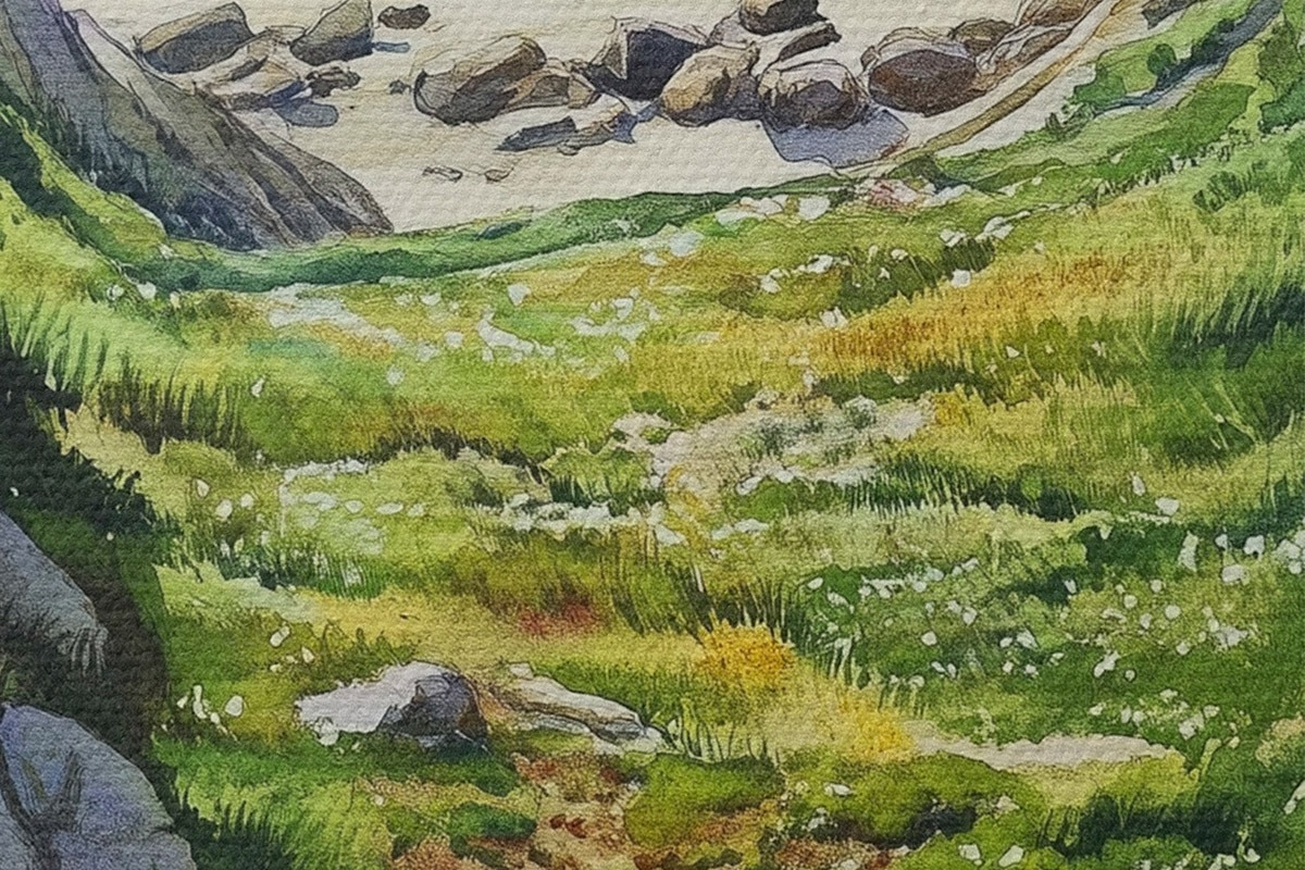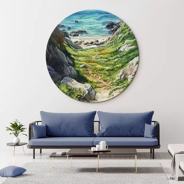 Nuotrauka Jūros pakrantė su akmenimis ir žalia žole, akvarelės stilius, vasara Nr r44616