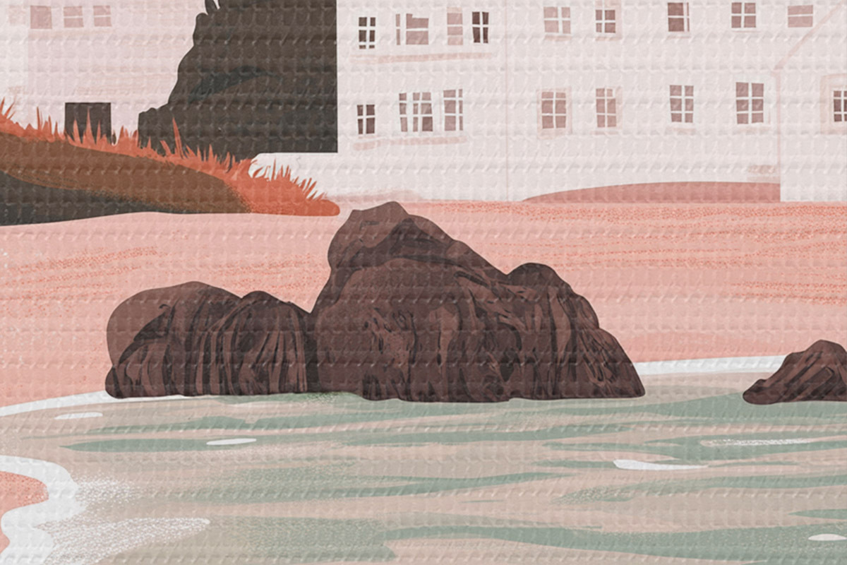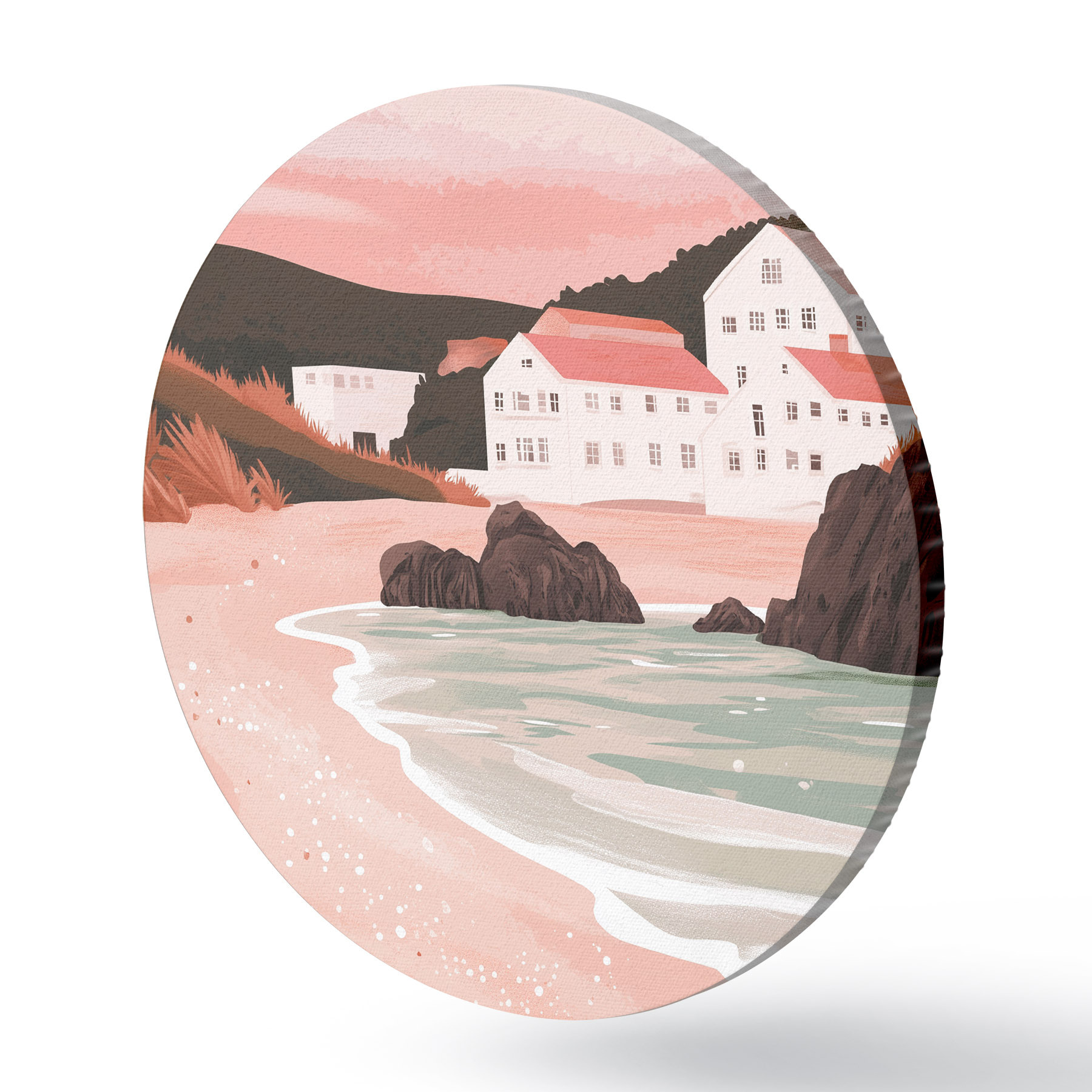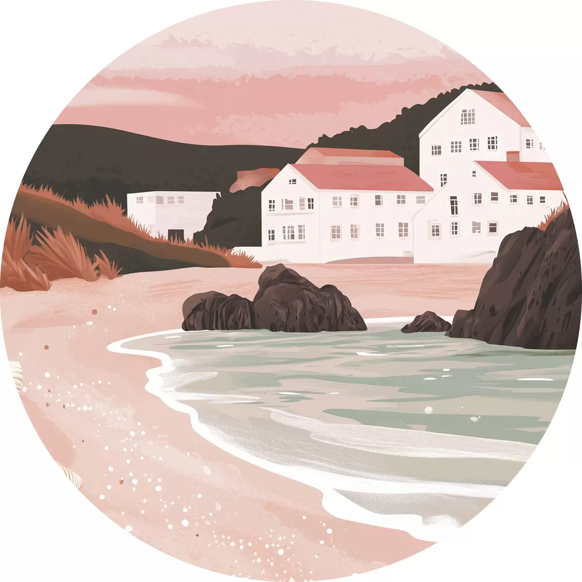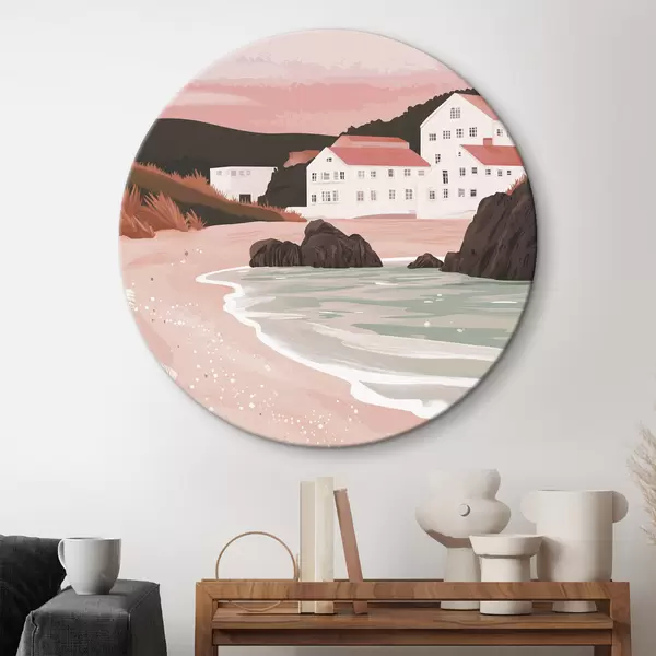 Nuotrauka Jaukus rausvas paplūdimys su baltais nameliais ir jūros kriauklėmis Nr r44713