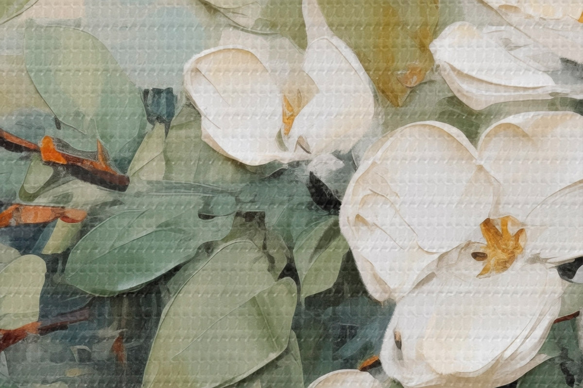 Nuotrauka Magnolijos gėlės su žaliais lapais ant šakos, impasto tekstūros stilius, švelni spalvų paletė Nr r44853