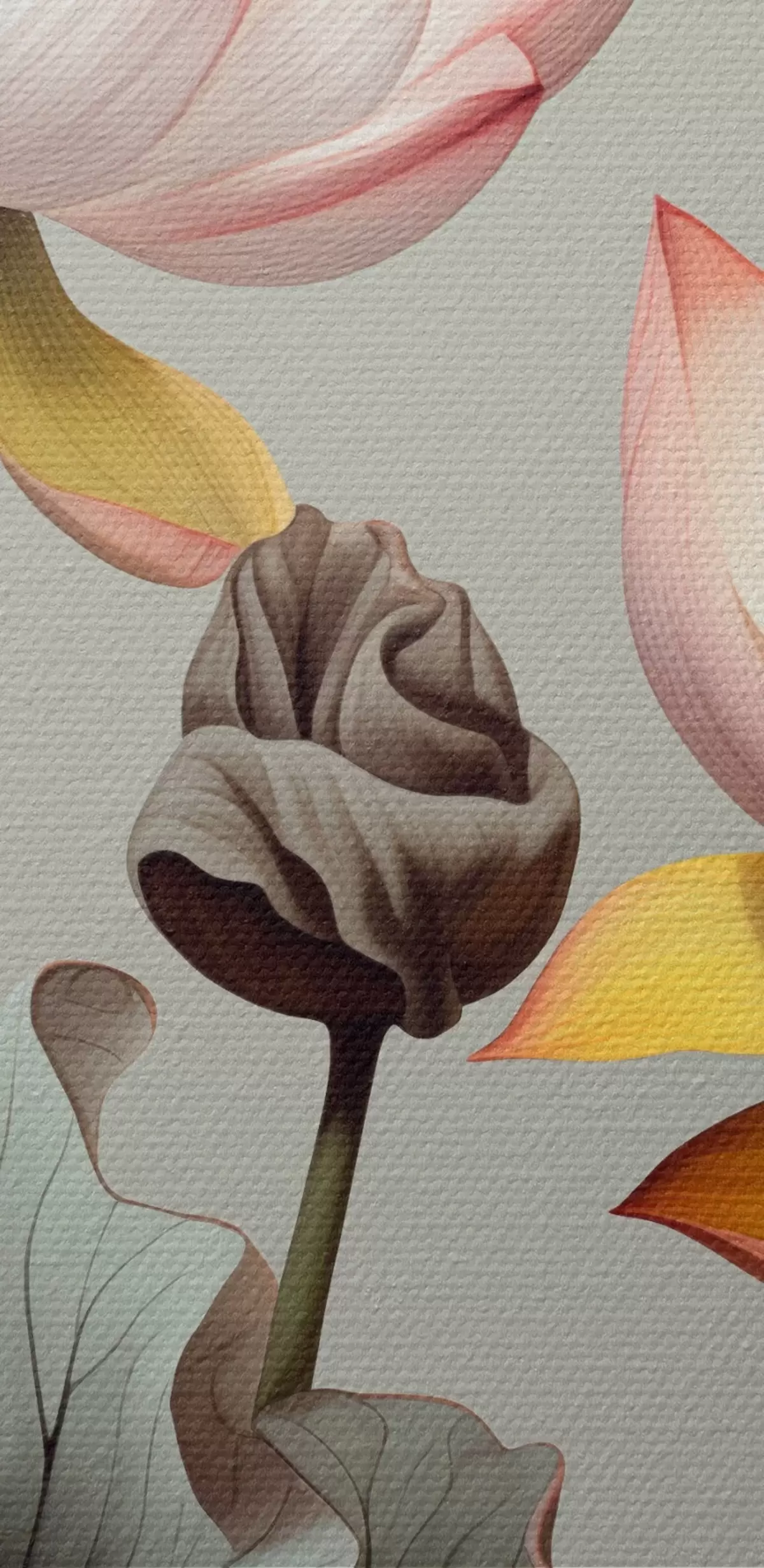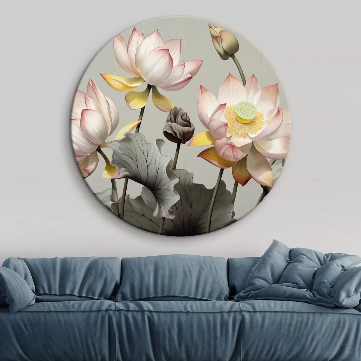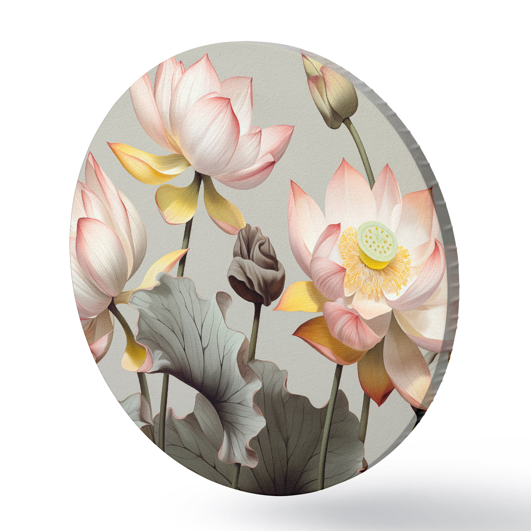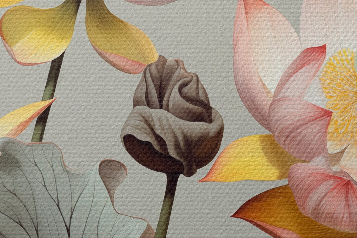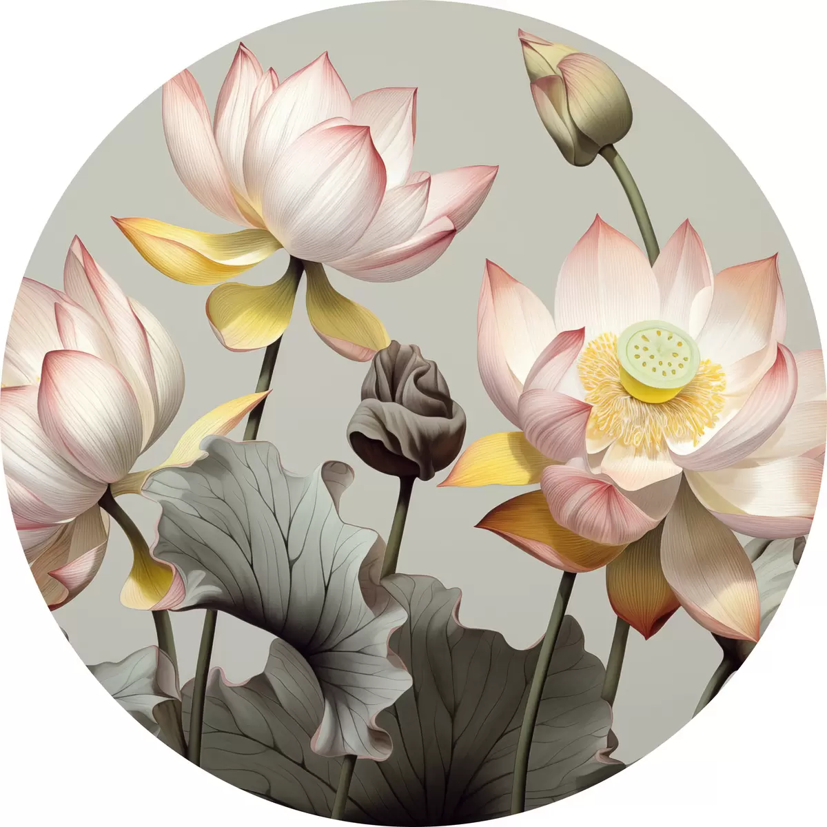 Nuotrauka Lotoso gėlės su pasteliniais žiedlapiais ir žaliais lapais, prislopintų spalvų paletė, vienspalviame fone Nr r44862