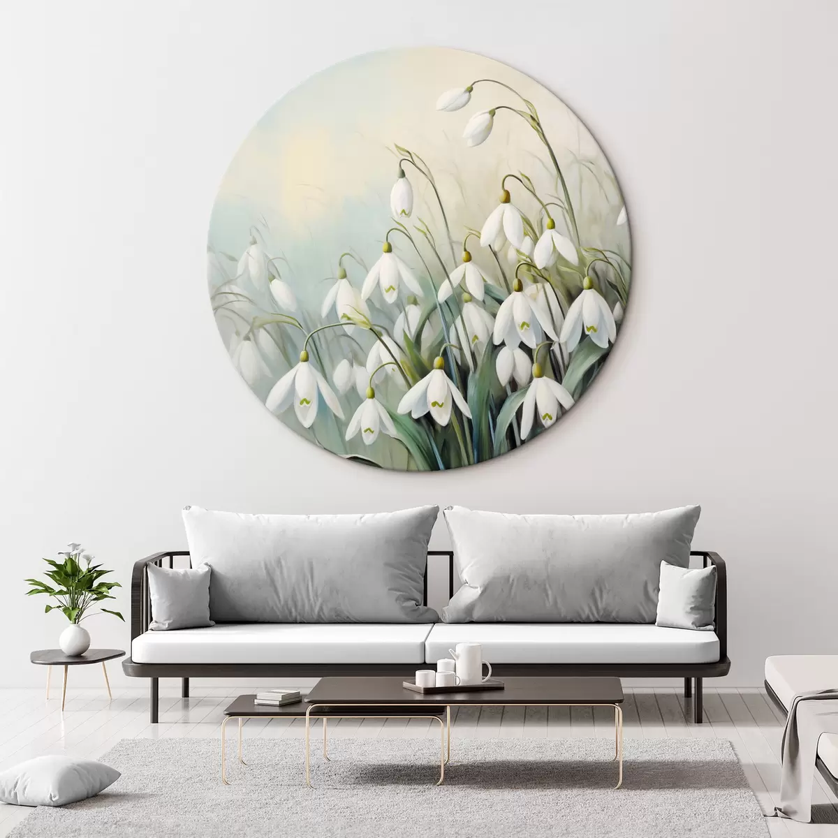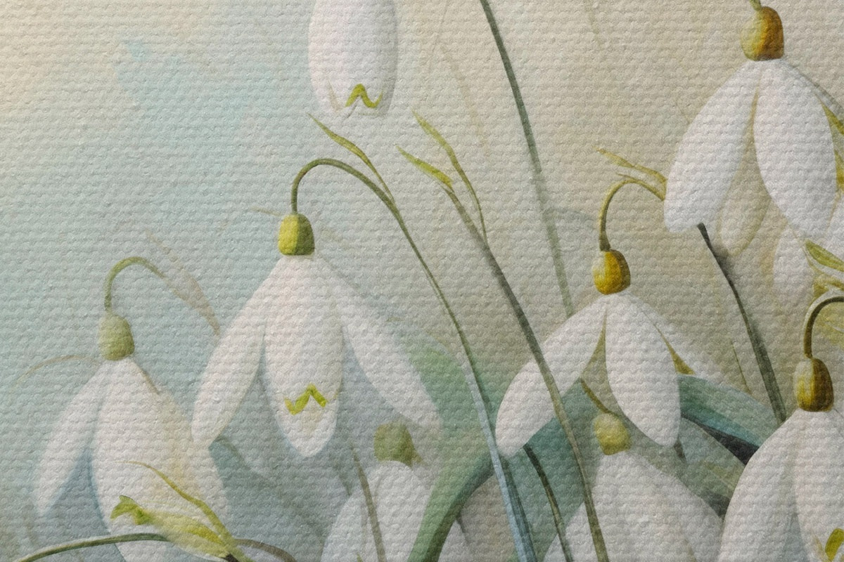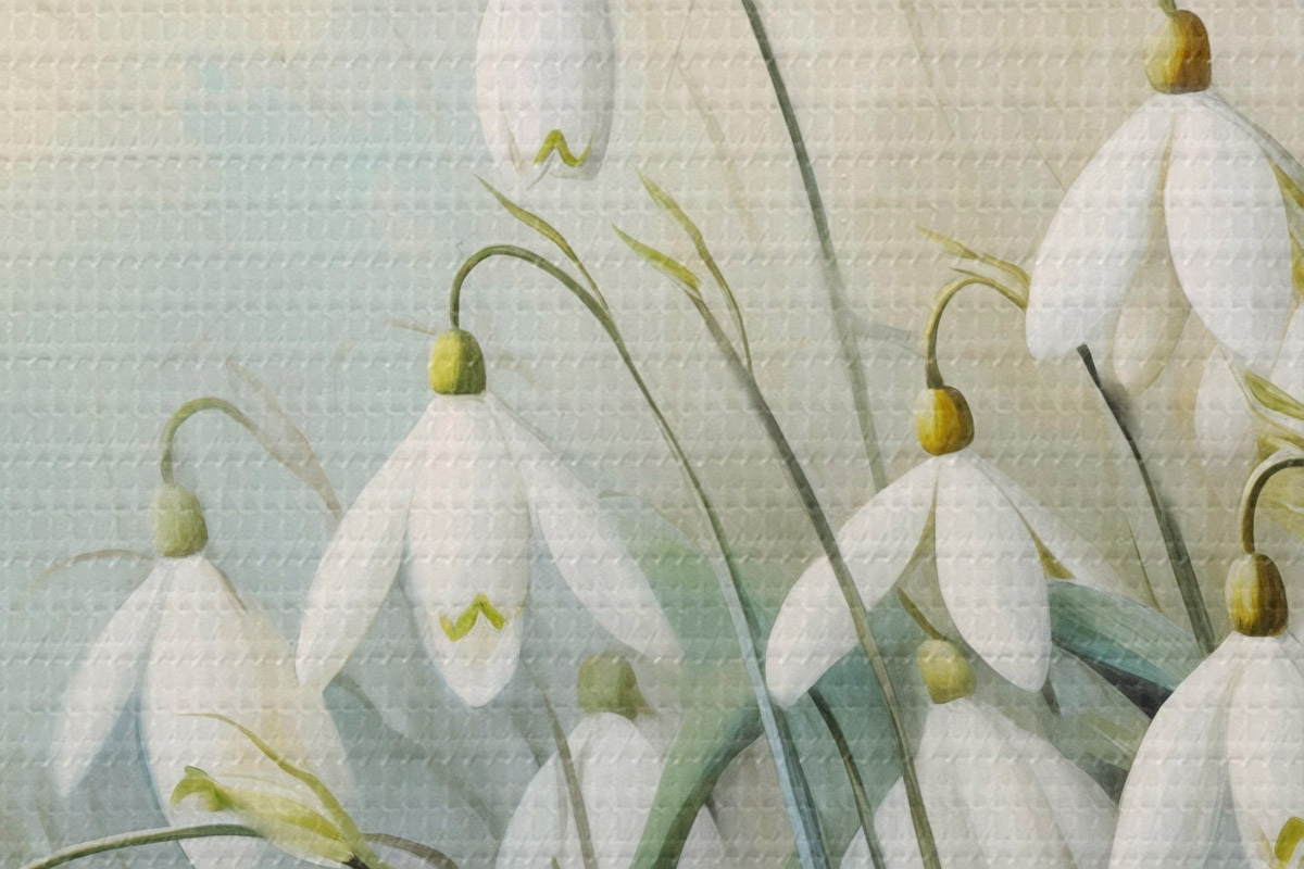 Nuotrauka Baltos snaigių gėlės su mėlynais ir žaliais stiebais ir lapais, švelnūs potėpiai, neryškus fonas Nr r44864