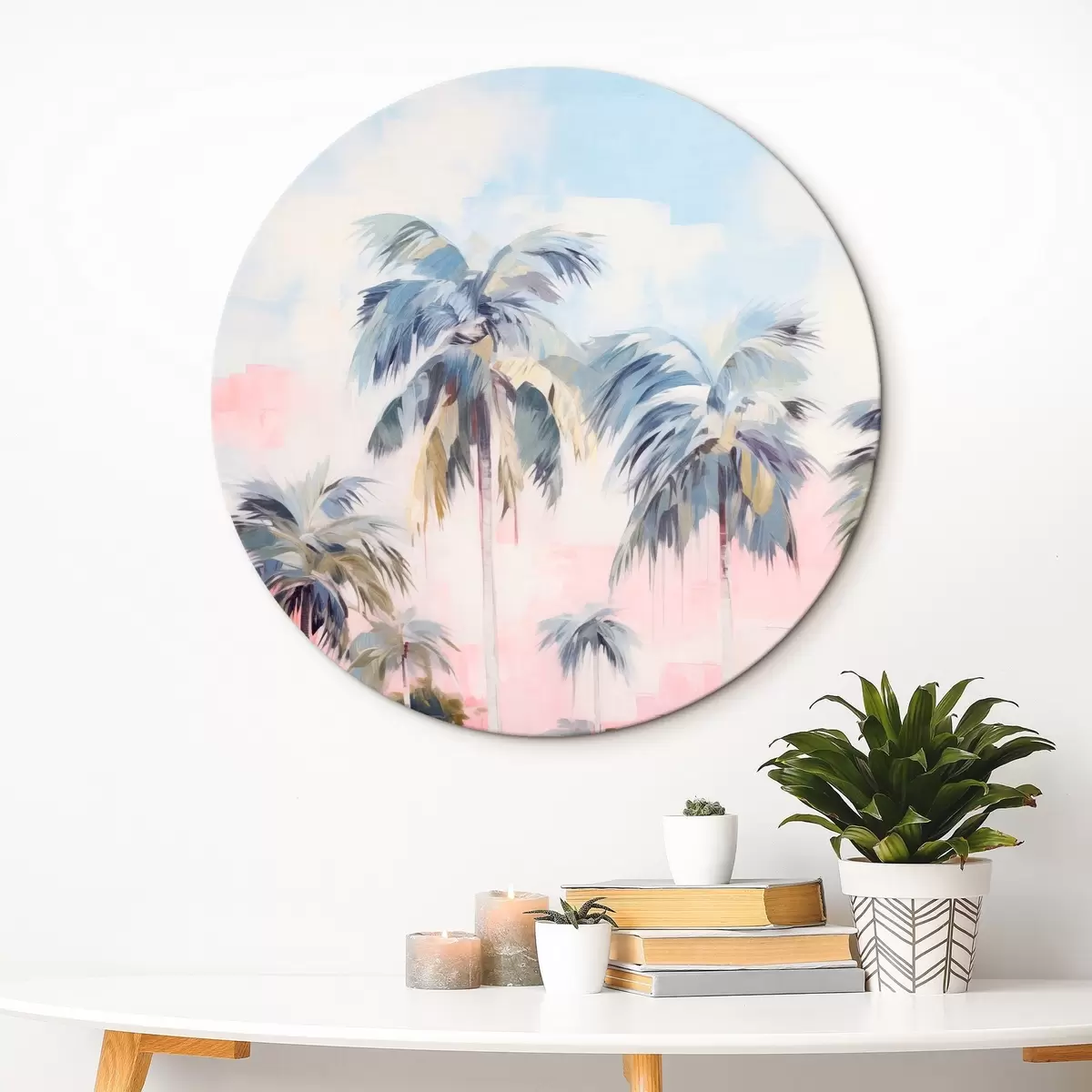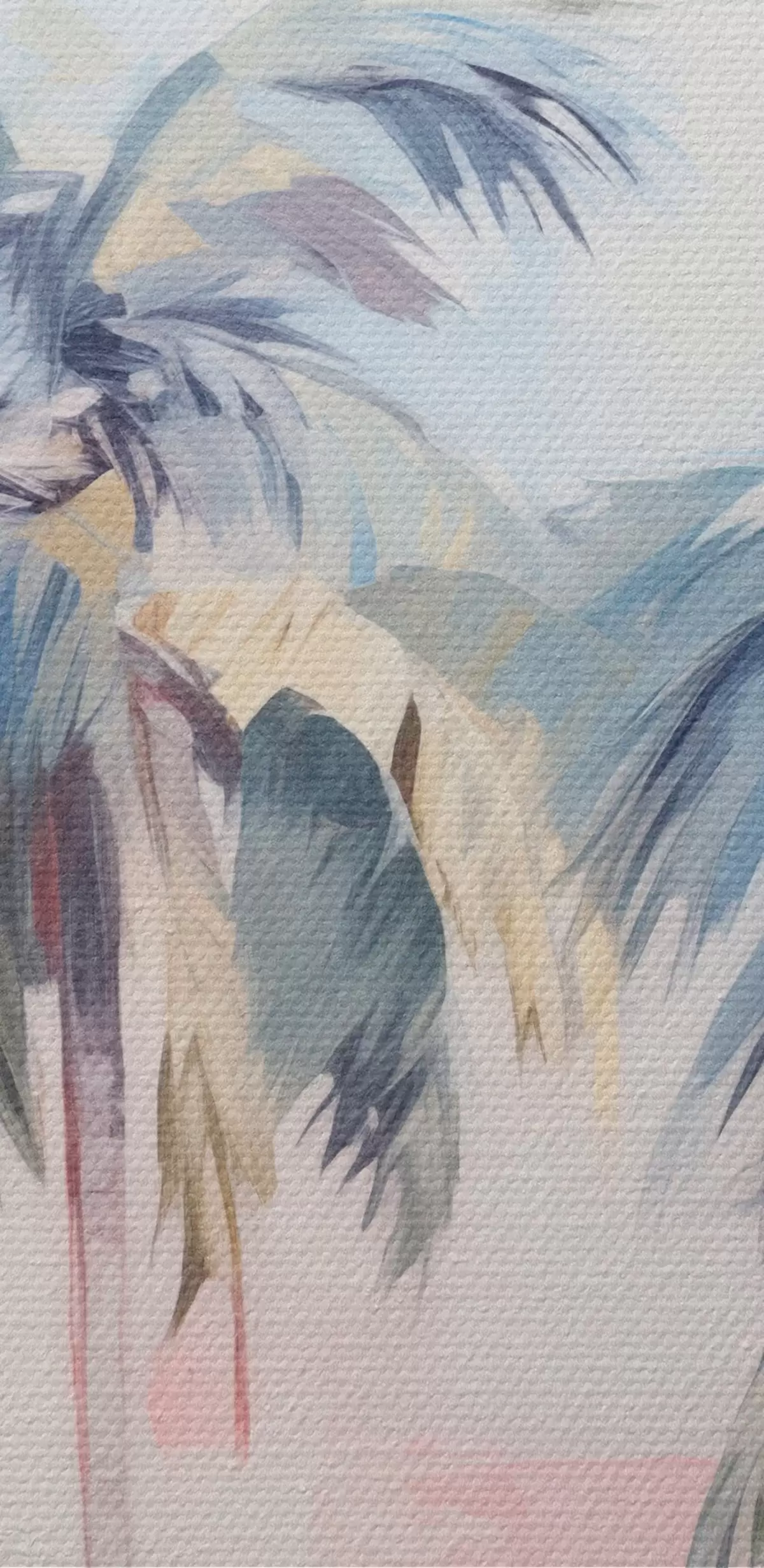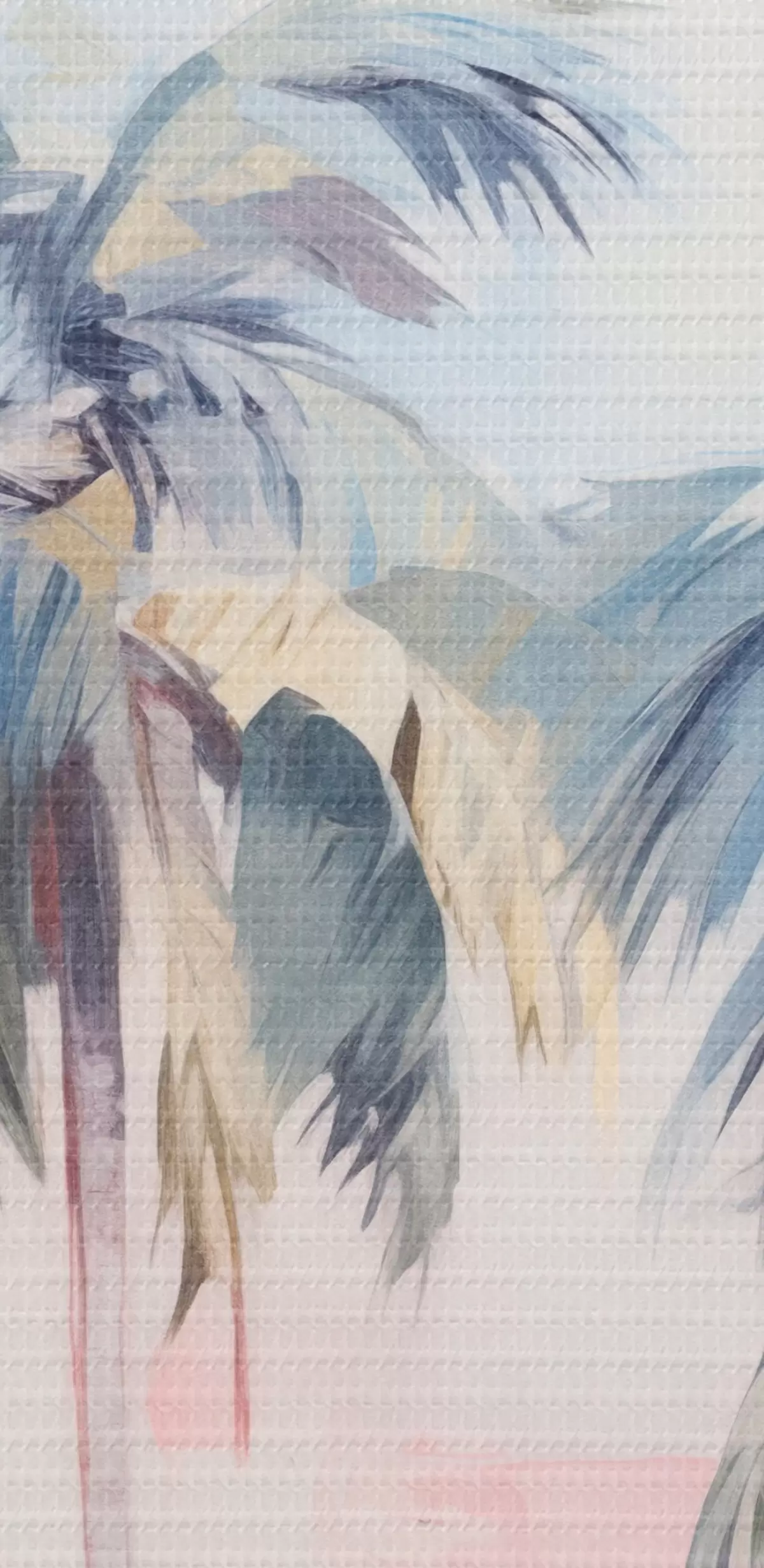 Nuotrauka Palmės su pastelinės spalvos lapais ir rudais kamienais, rausvas ir mėlynas dangus, atogrąžų aplinka Nr r44866