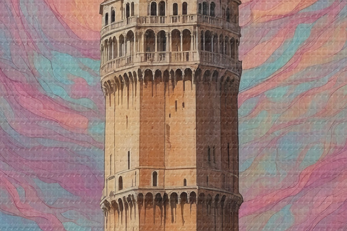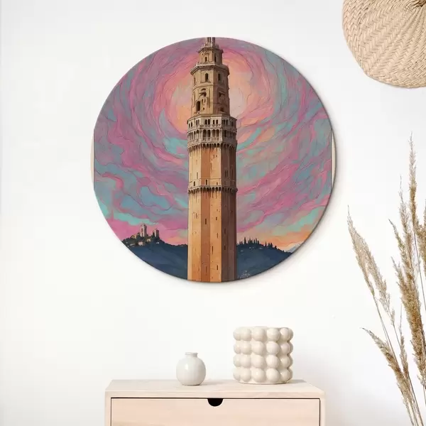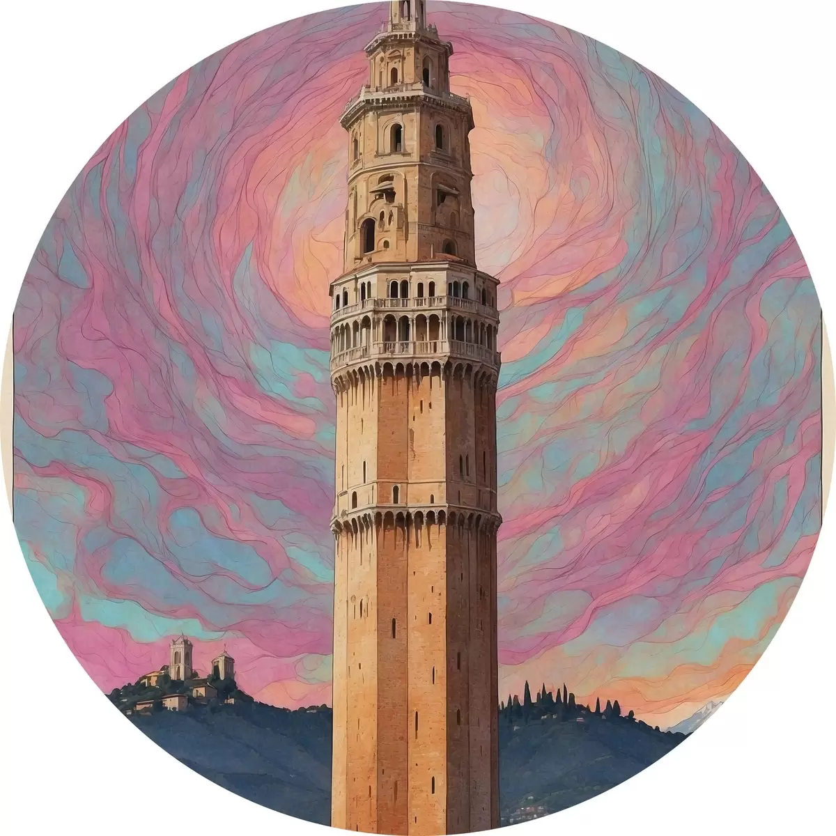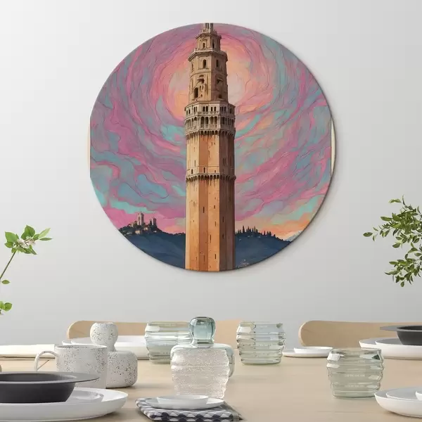 Nuotrauka Fantazijos bokštas su rausvomis ir mėlynomis spiralėmis dangaus fone Nr r44885