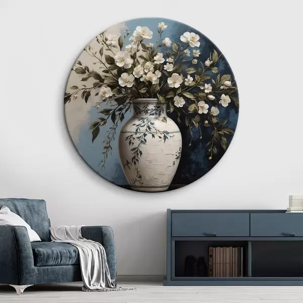 Nuotrauka Baltos ir geltonos gėlės didelėje vazoje mėlyname fone Nr r44893