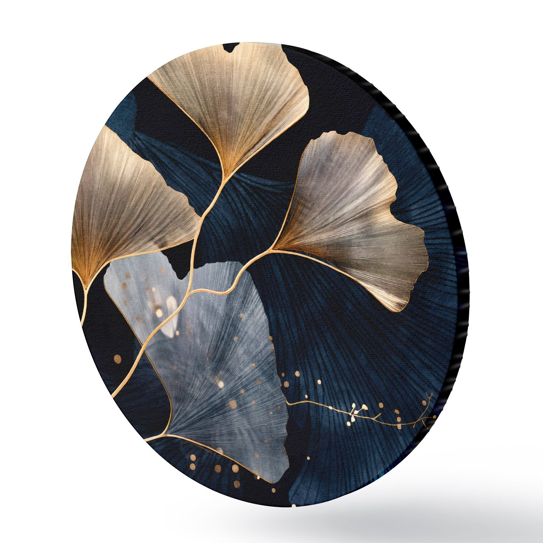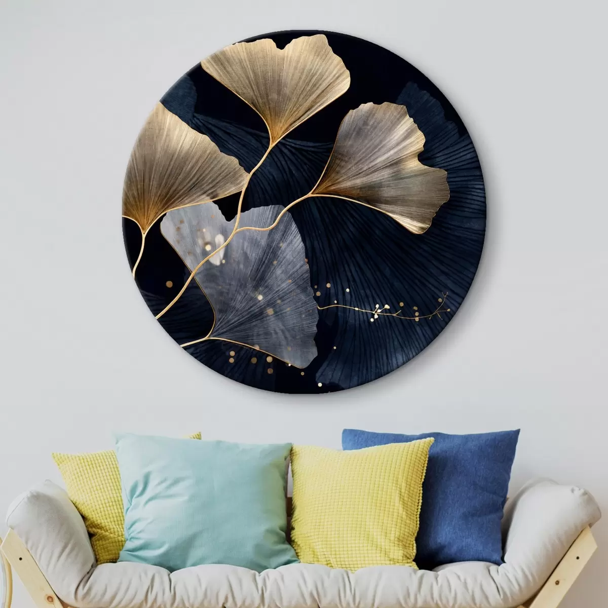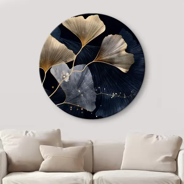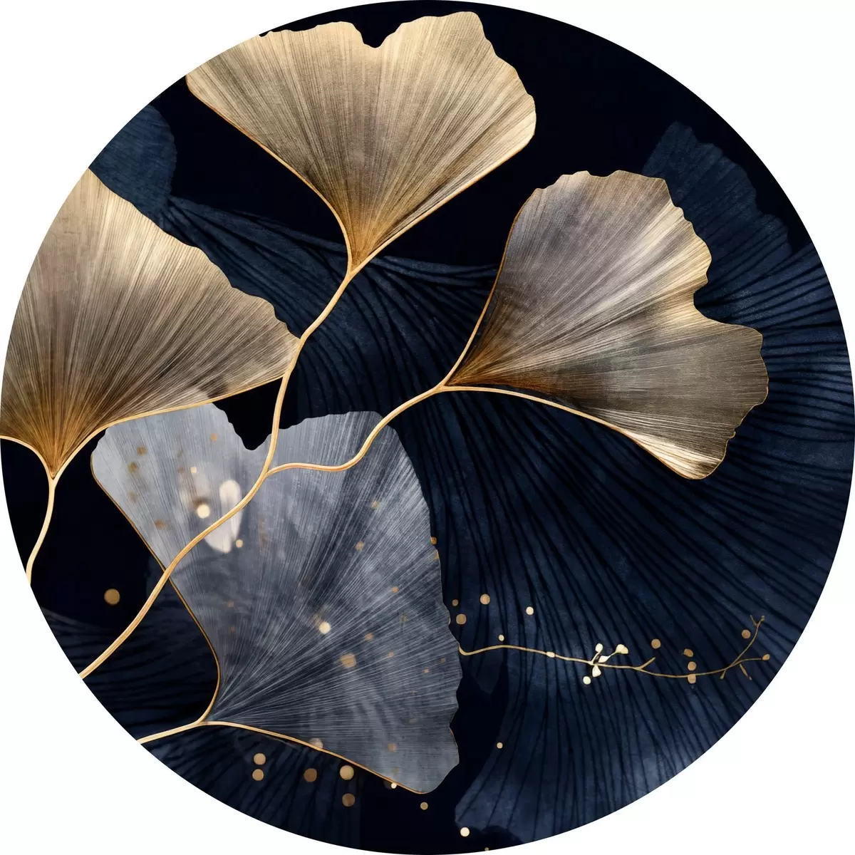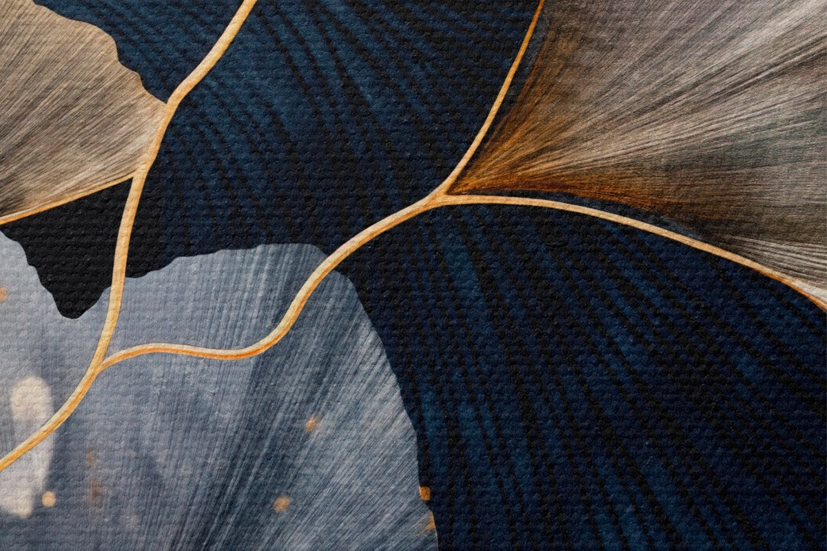 Nuotrauka Ginkmedžio lapai geltonos ir mėlynos spalvos, elegantiškas tamsus fonas, modernus menas, minimalistinis stilius, įkvėptas gamtos Nr r44921