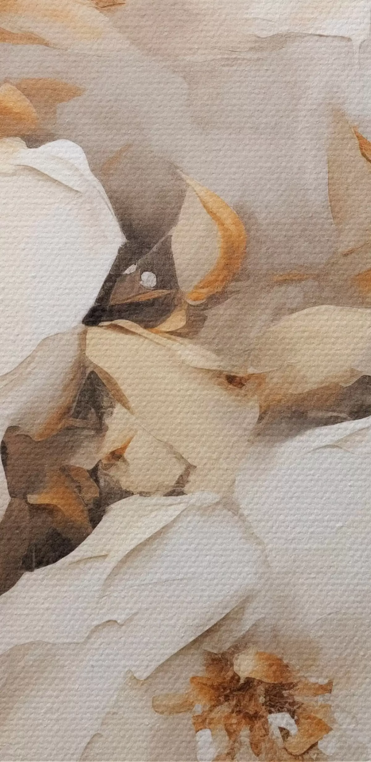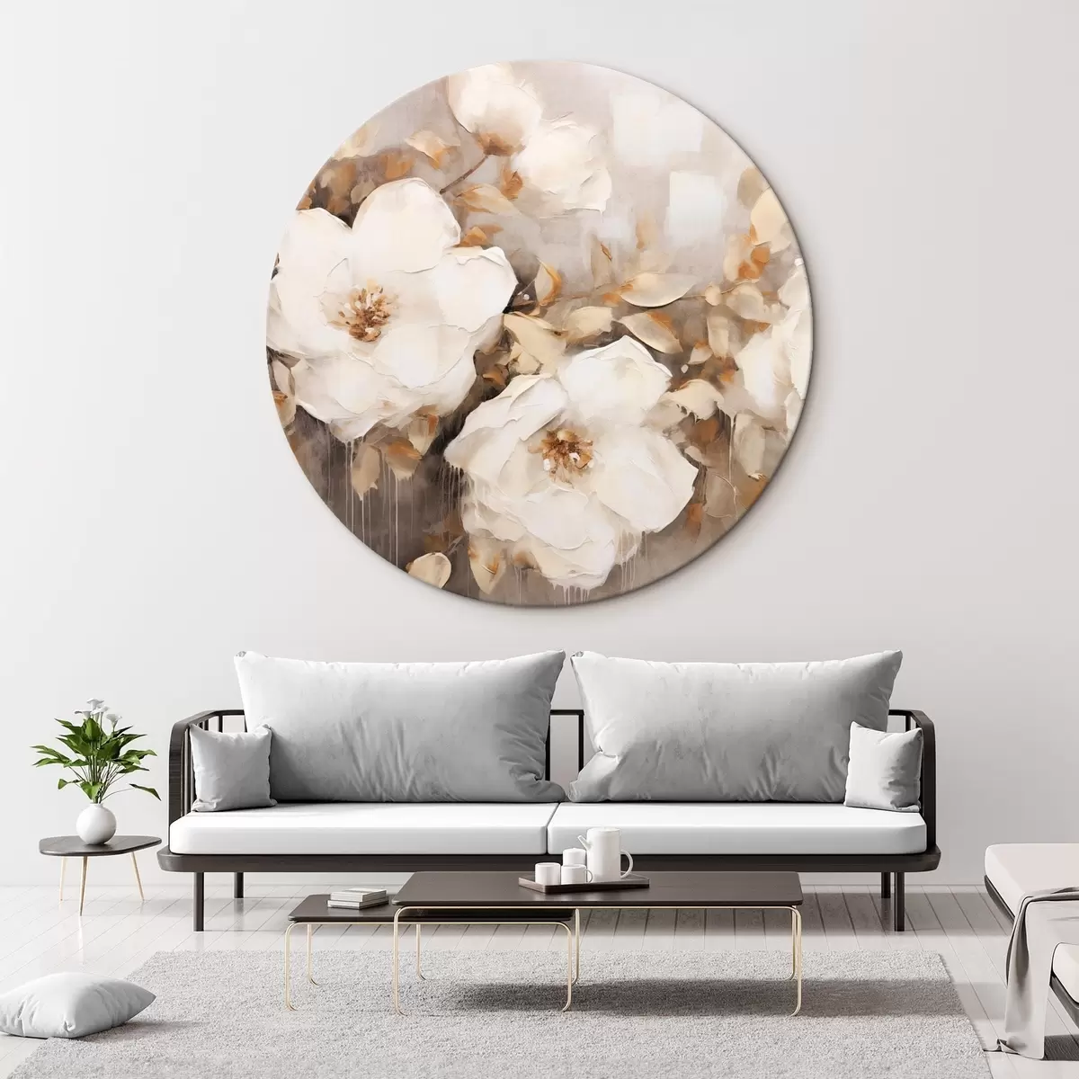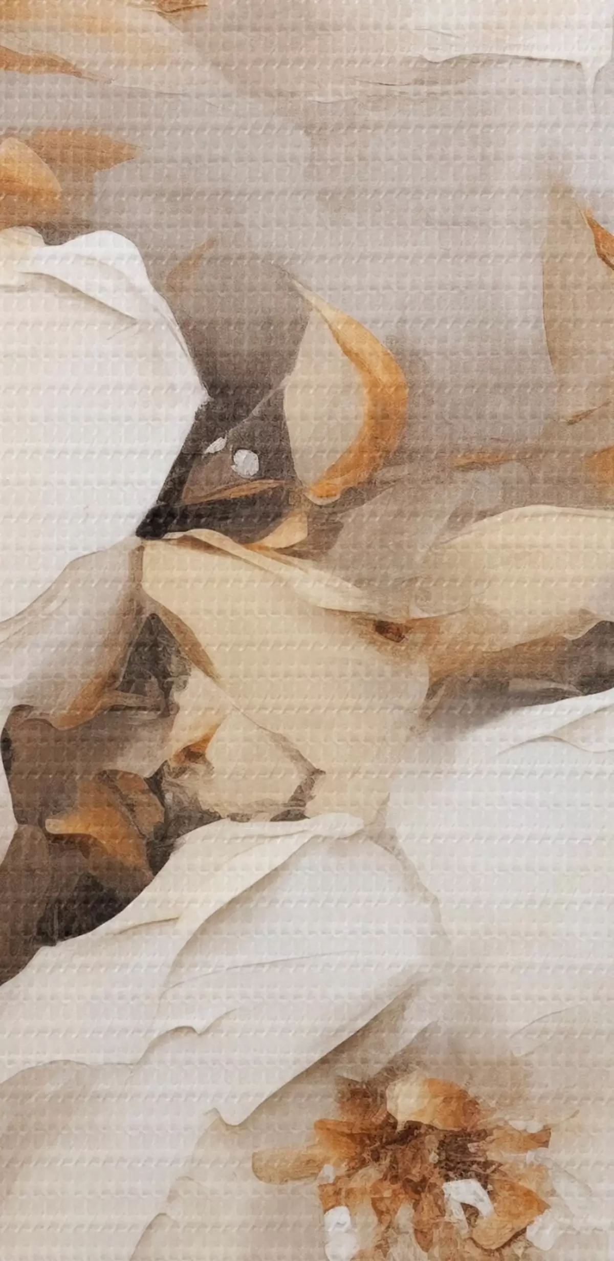 Nuotrauka Baltos gėlės su rudais lapais smėlio spalvos fone, aliejinės tapybos imitacija, gėlių kompozicija, botanikos menas Nr r44922