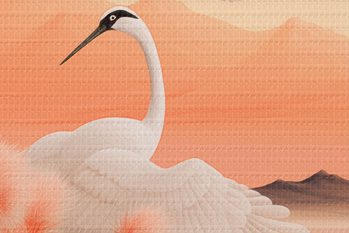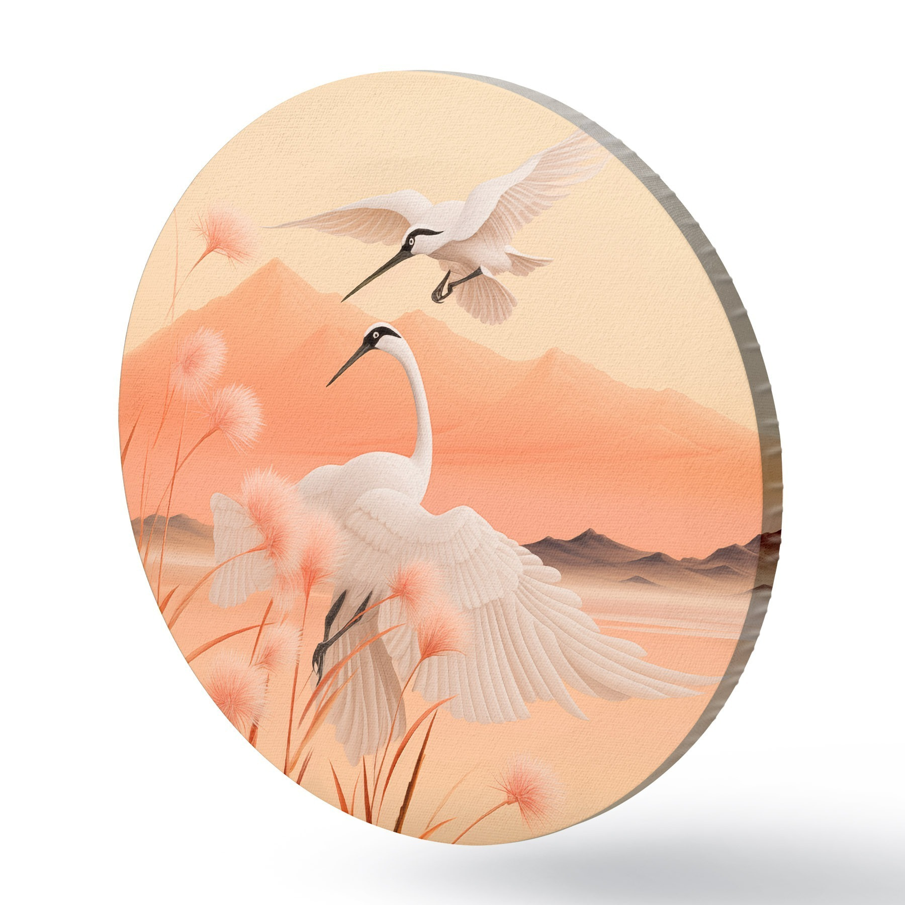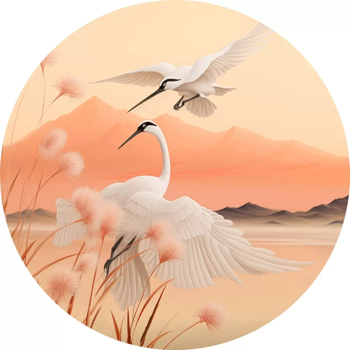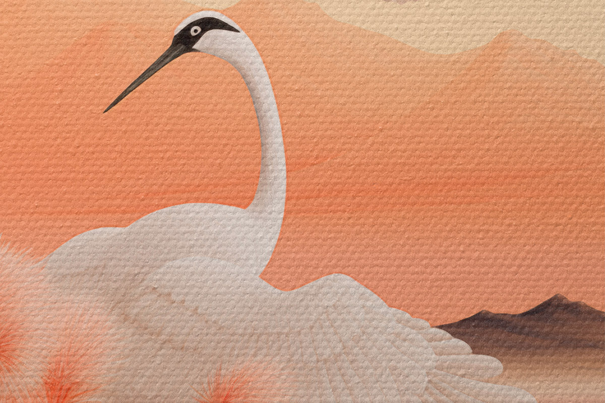 Nuotrauka Baltos gervės su rausvomis nendrėmis pirmame plane, kalnai ir ežeras antrame plane, minkšta oranžinė šviesa Nr r44925
