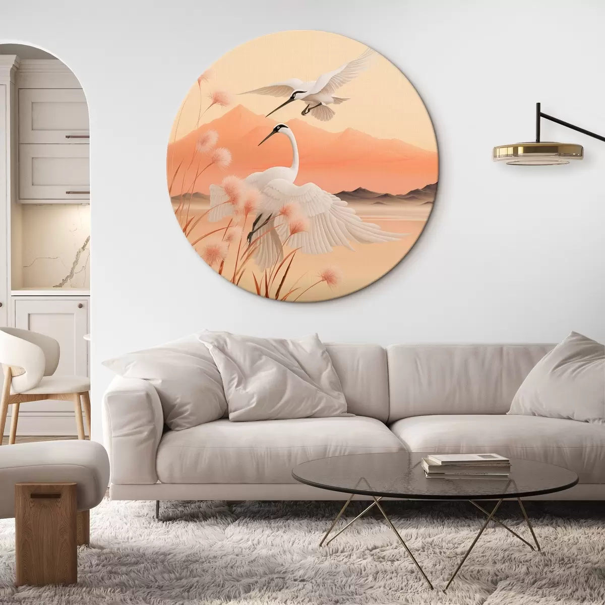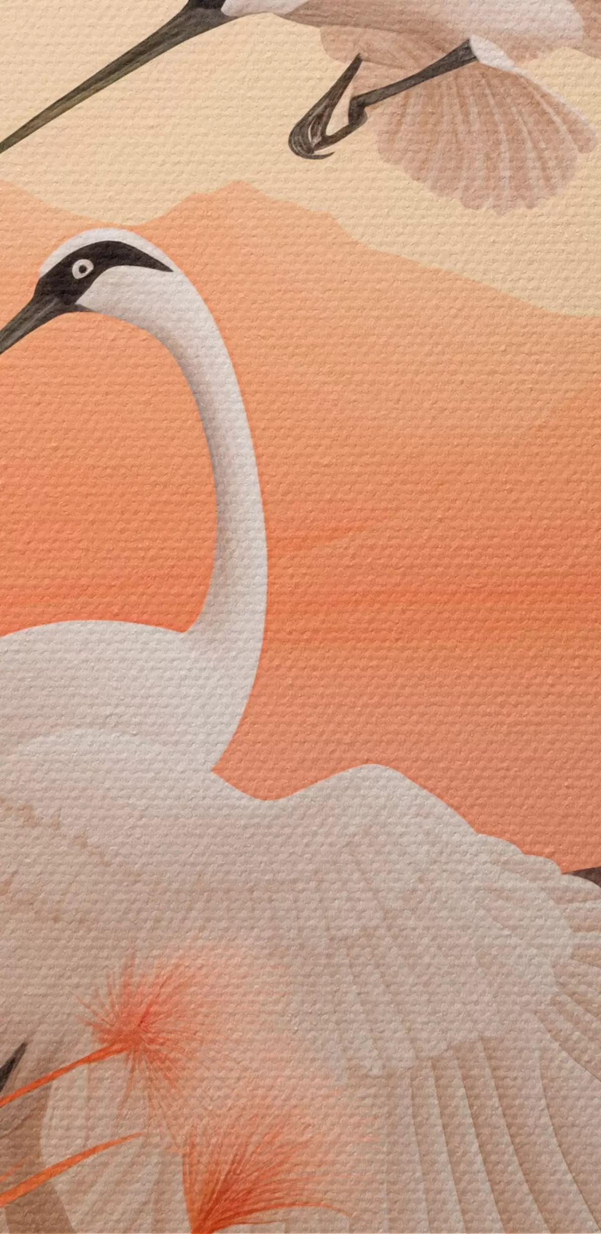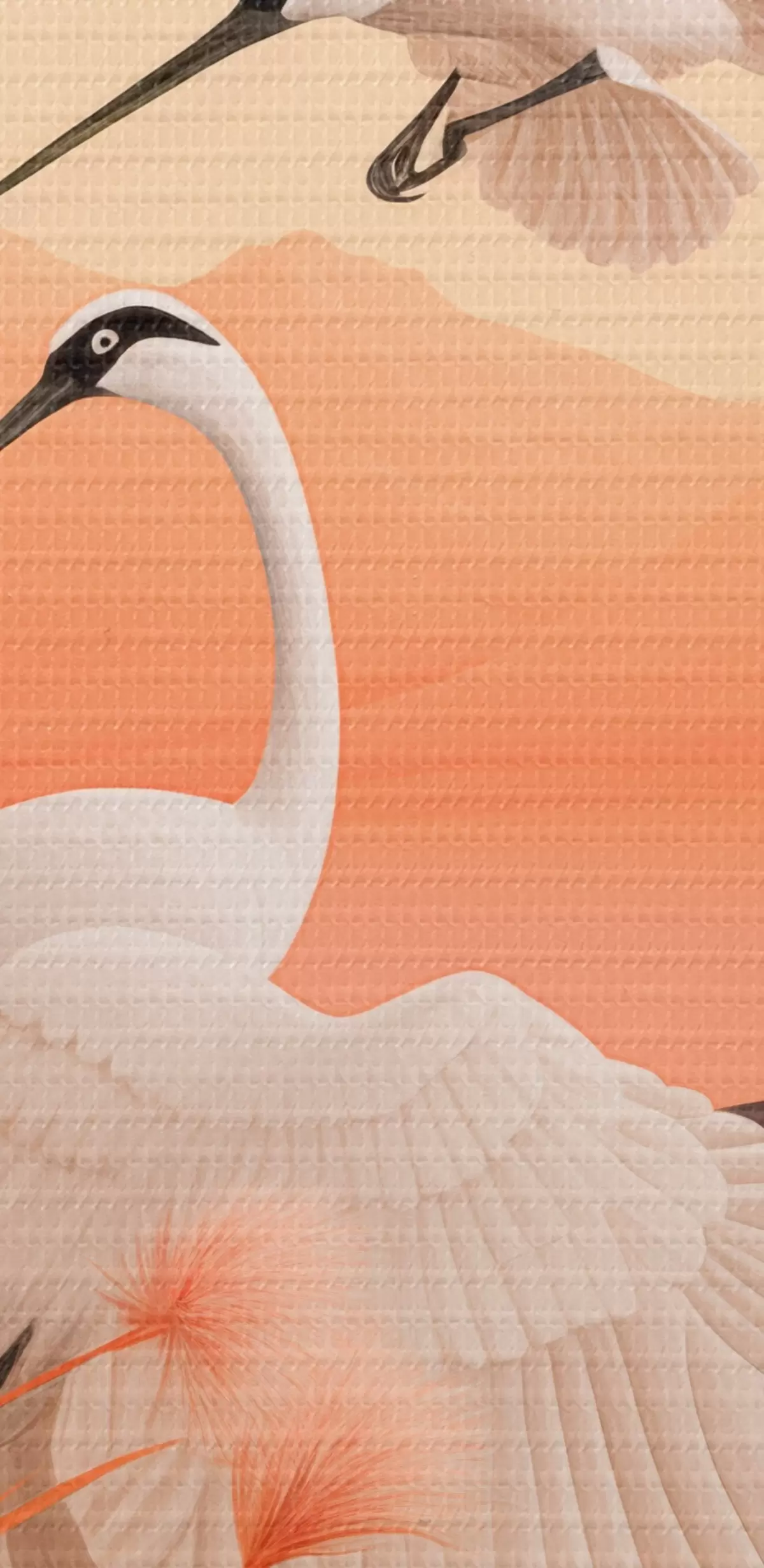 Nuotrauka Baltos gervės su rausvomis nendrėmis pirmame plane, kalnai ir ežeras antrame plane, minkšta oranžinė šviesa Nr r44925