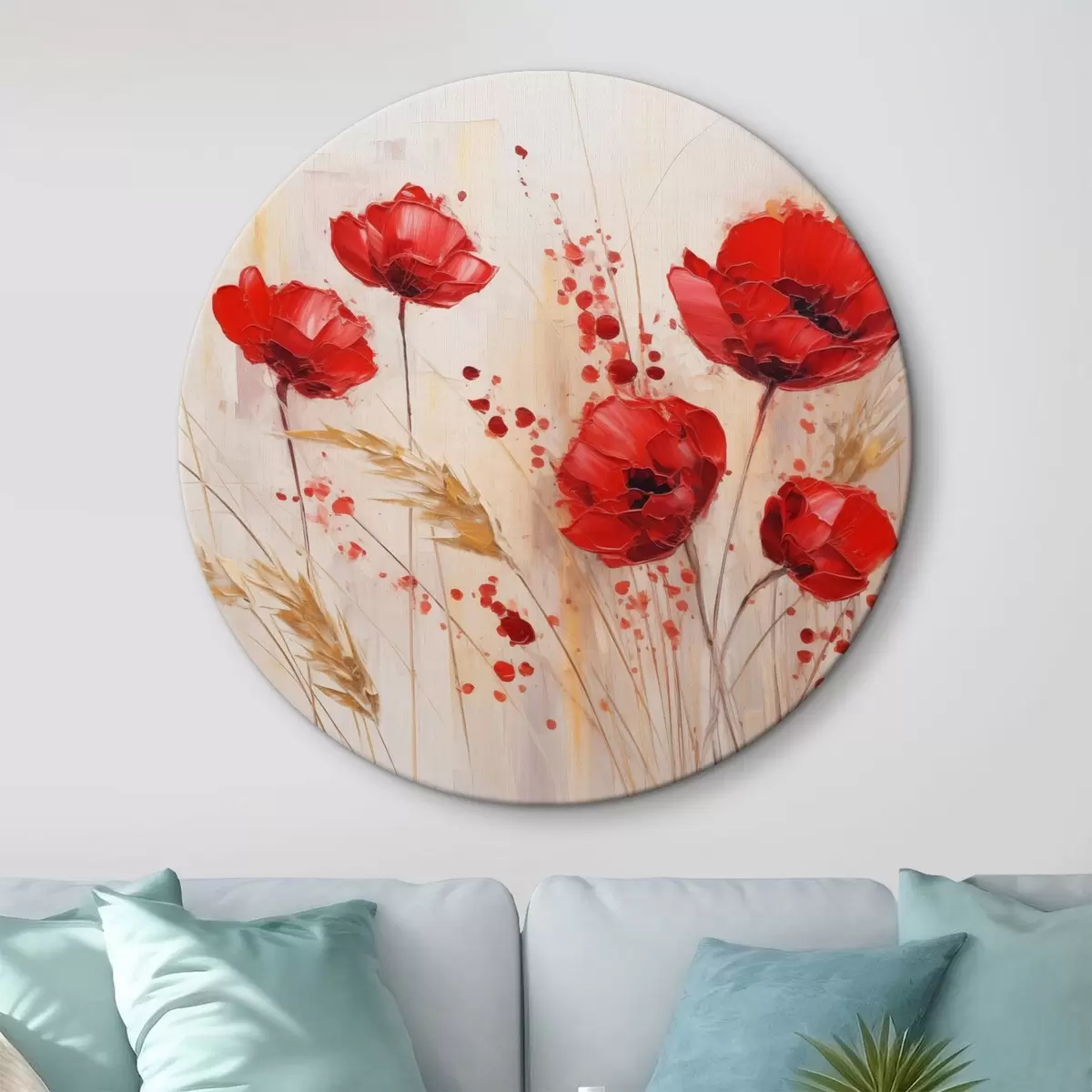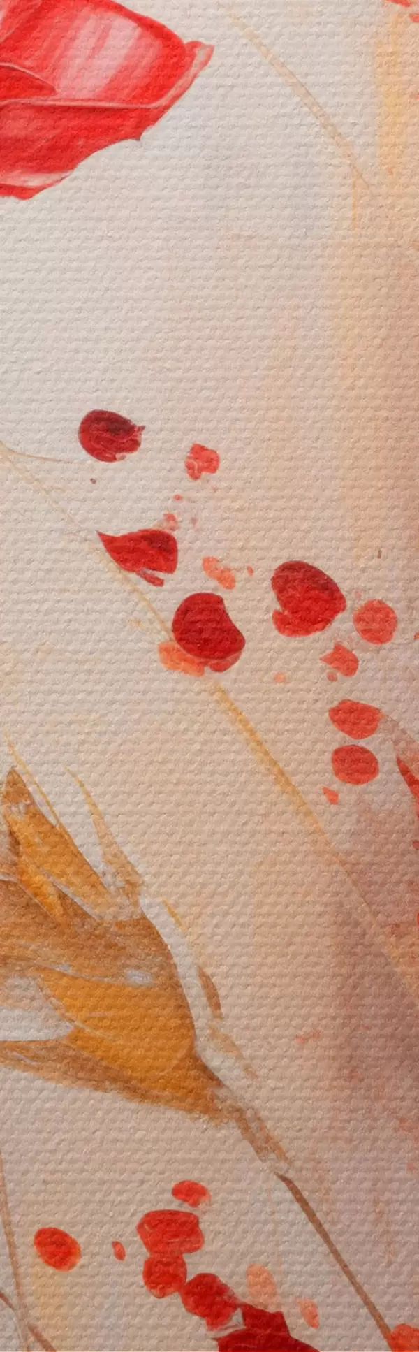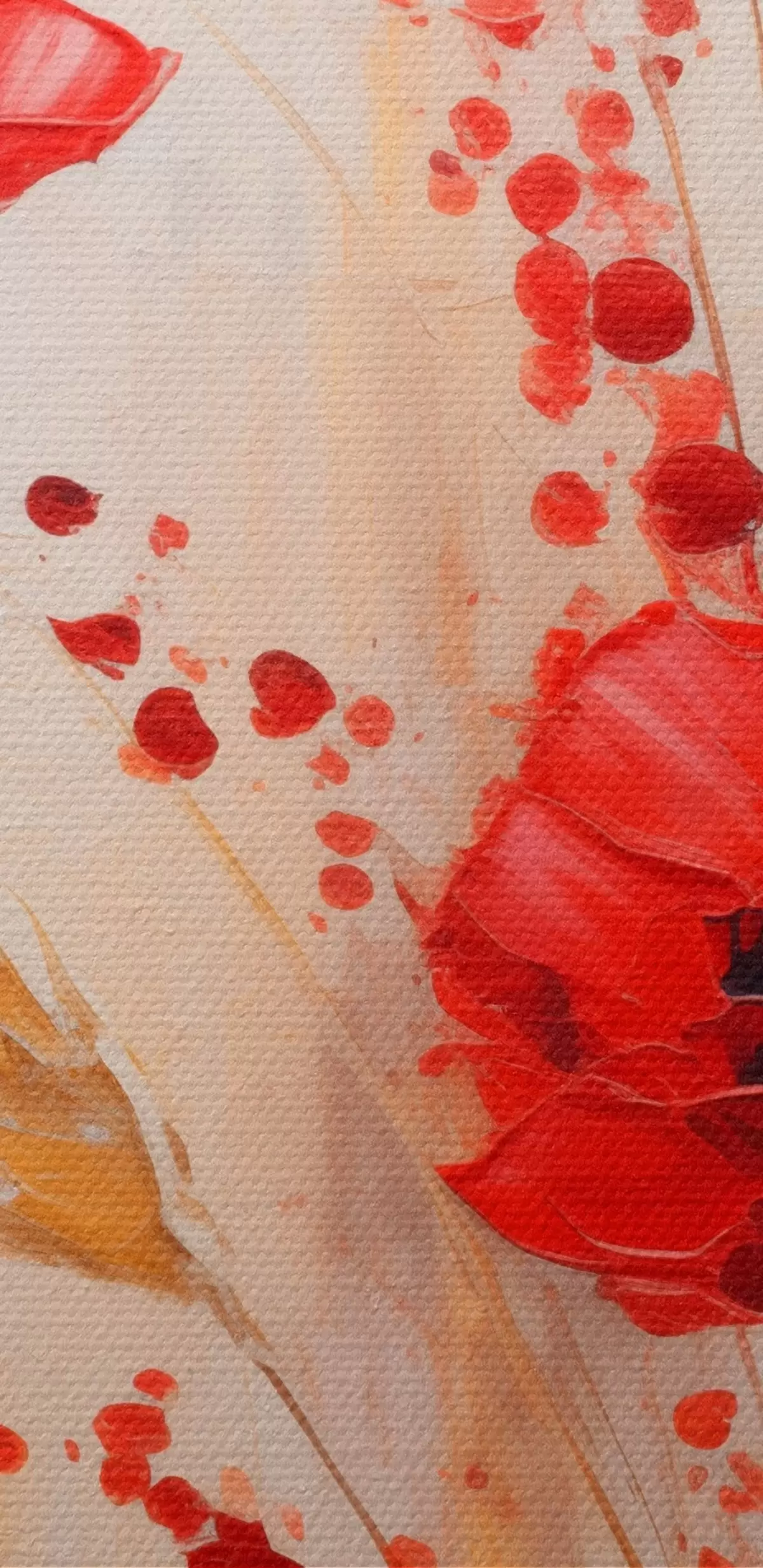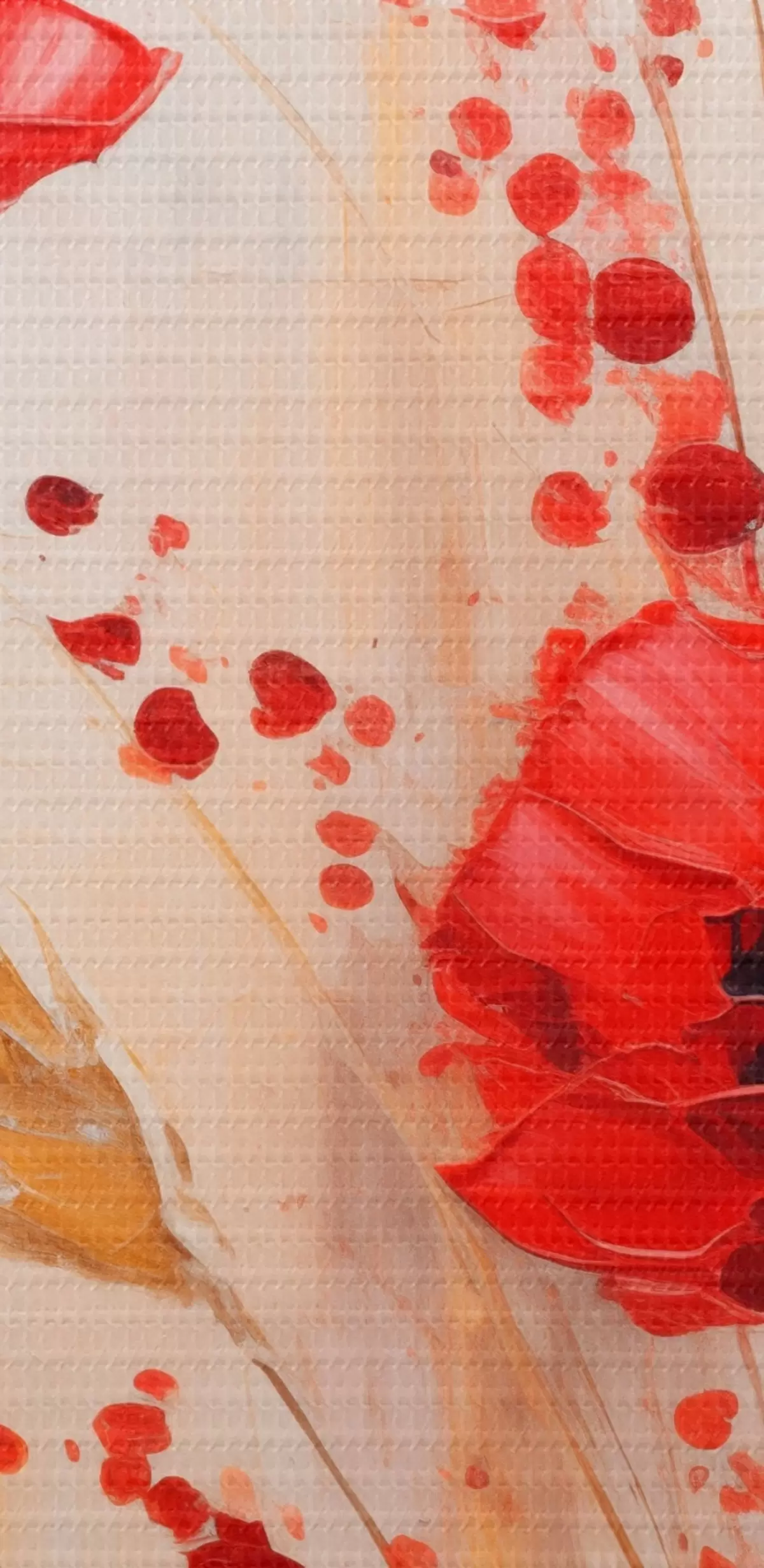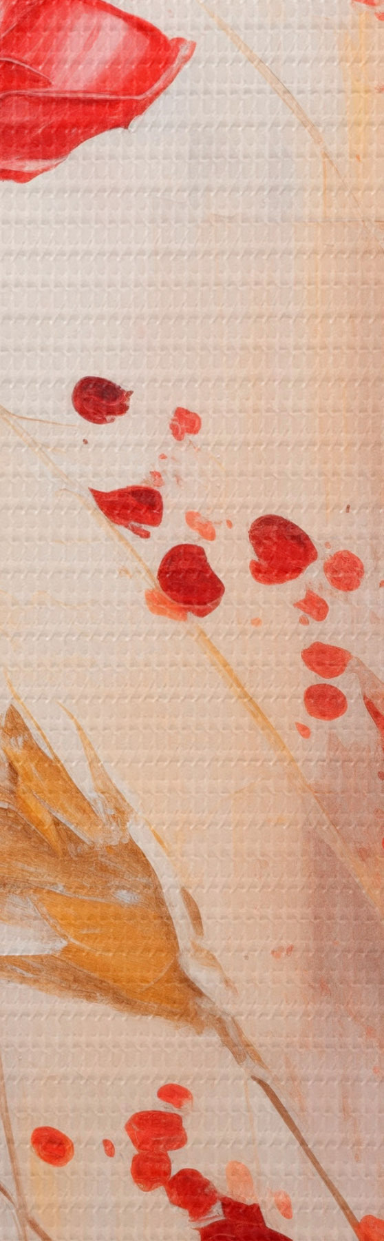 Nuotrauka Raudonų aguonų žiedai su geltonais kviečių stiebais švelniame neutraliame fone su raudonų dažų purslais Nr r44926