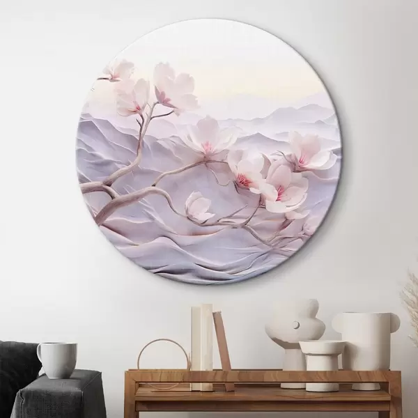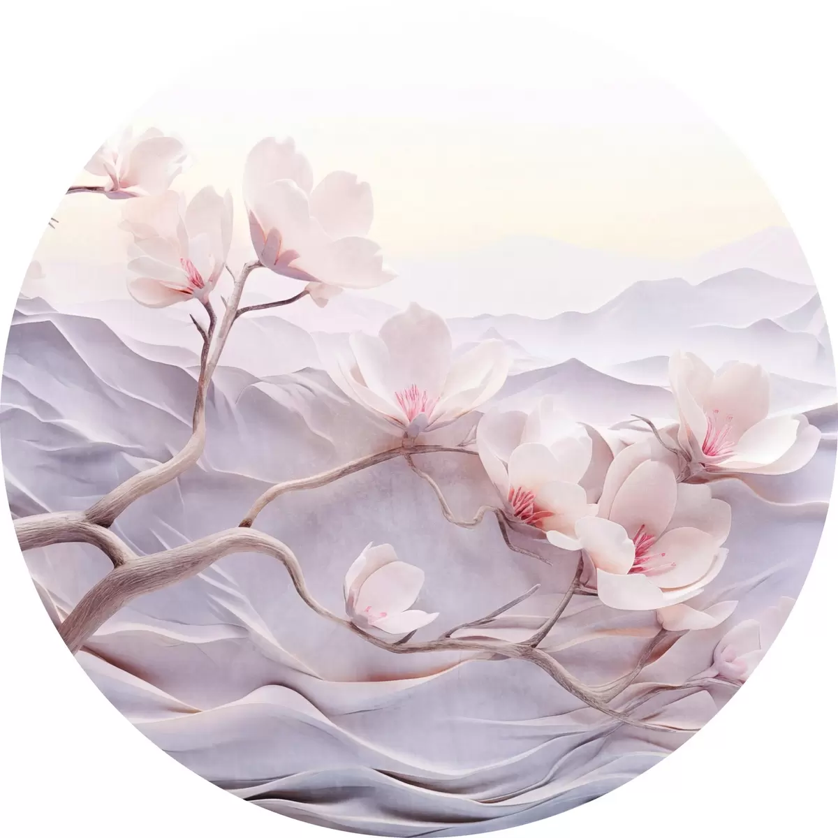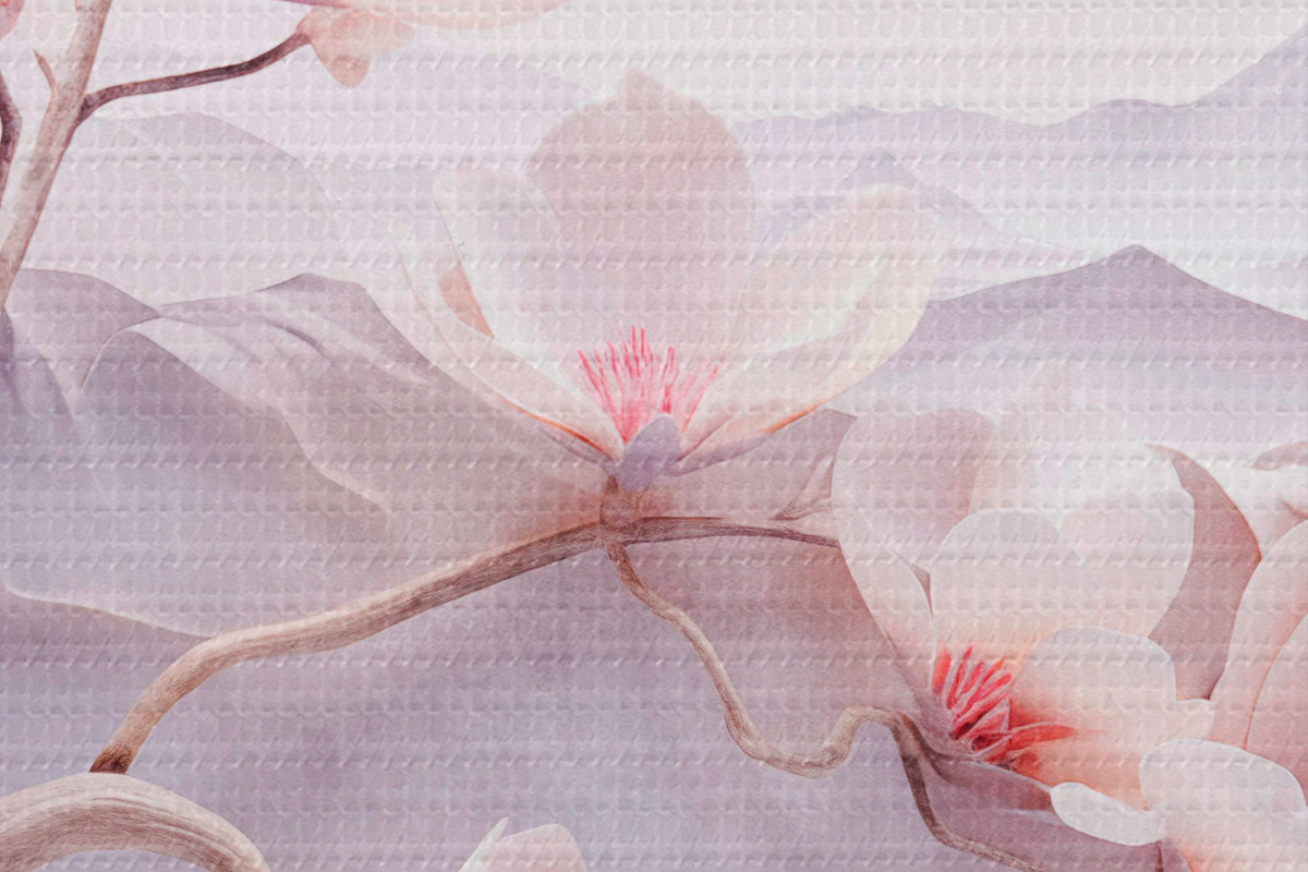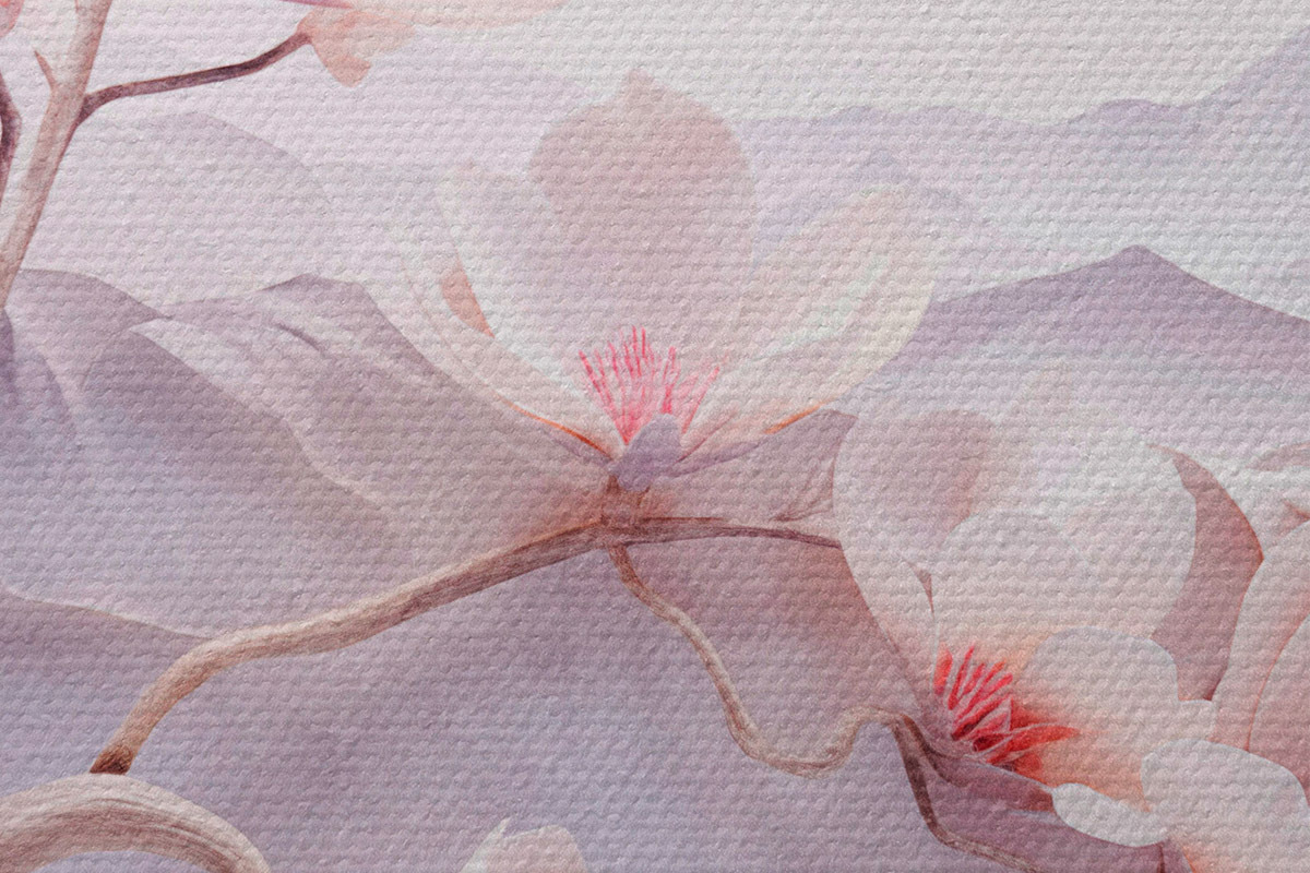 Nuotrauka Žiedų šaka su rausvais žiedais, kalnai fone, švelnios pastelinės spalvos, japonų tekstūrinis menas Nr r44930