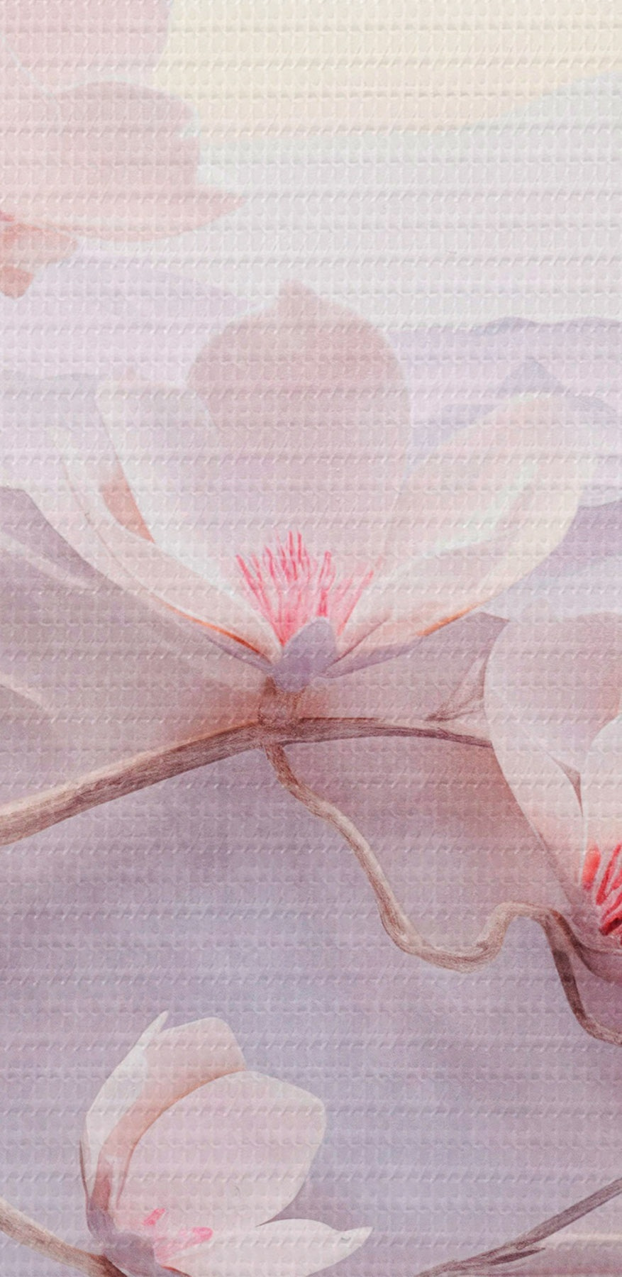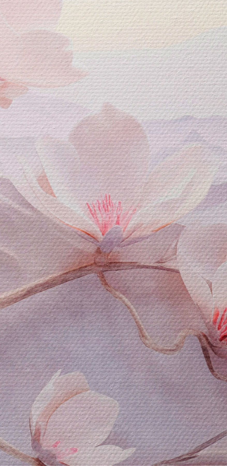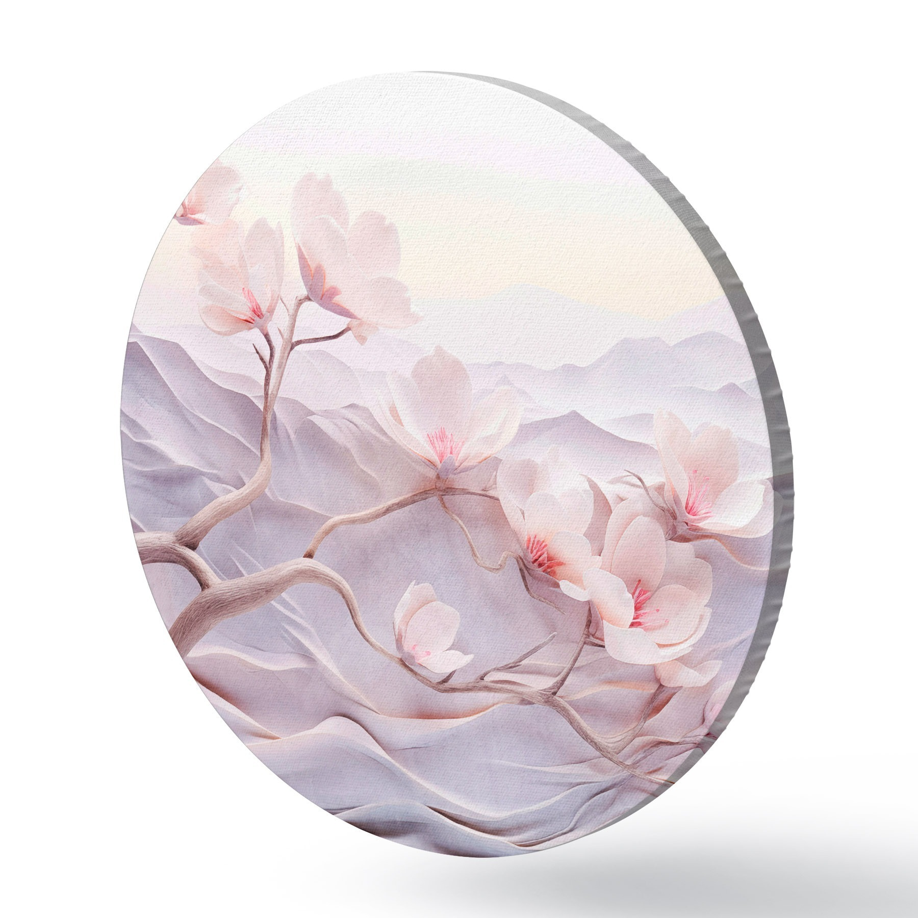 Nuotrauka Žiedų šaka su rausvais žiedais, kalnai fone, švelnios pastelinės spalvos, japonų tekstūrinis menas Nr r44930