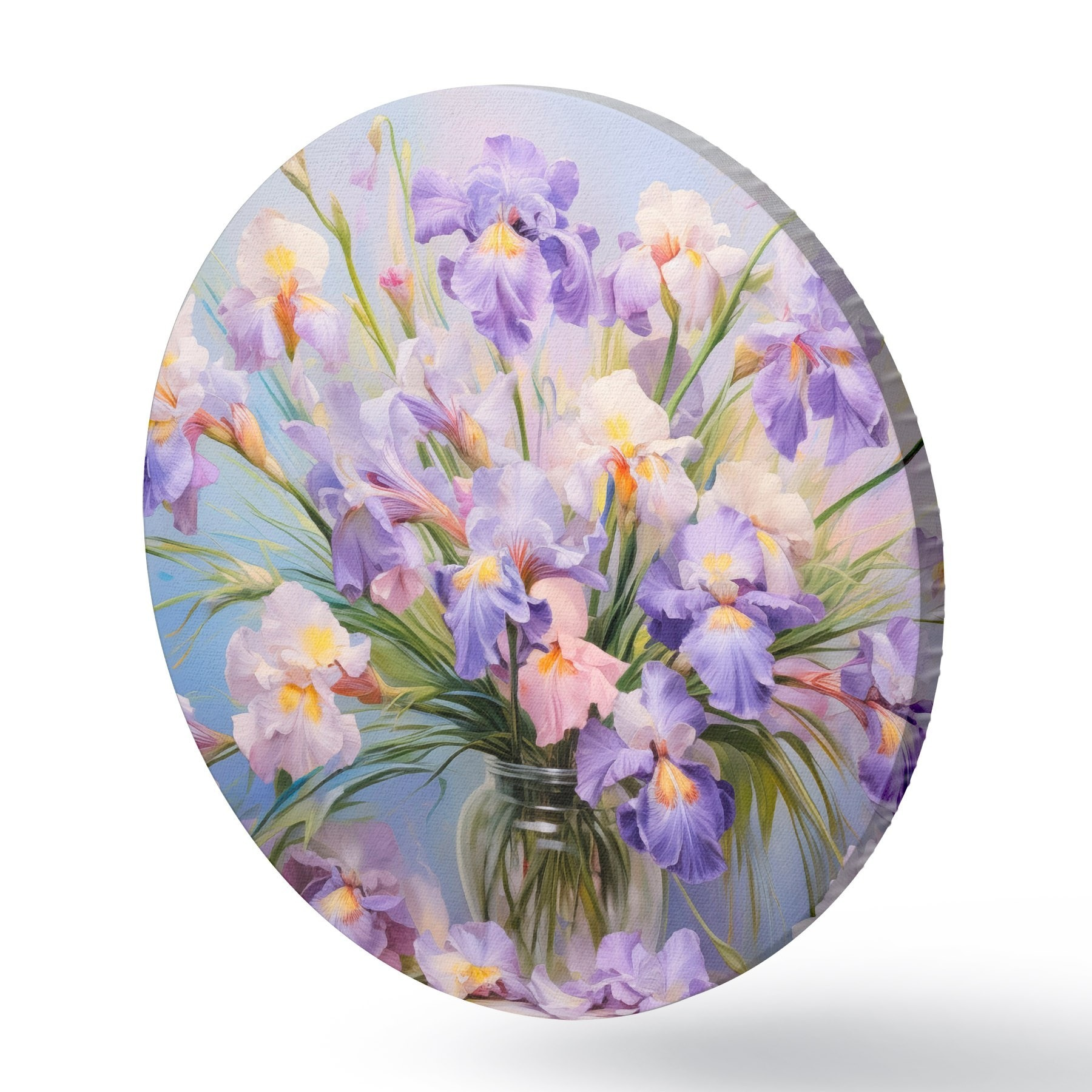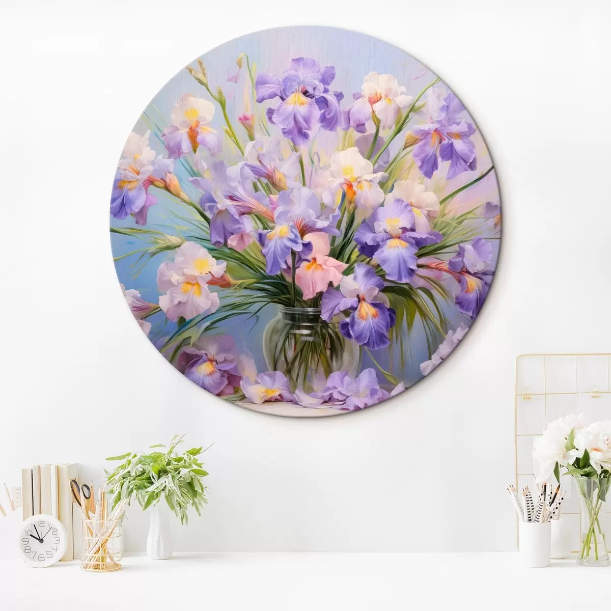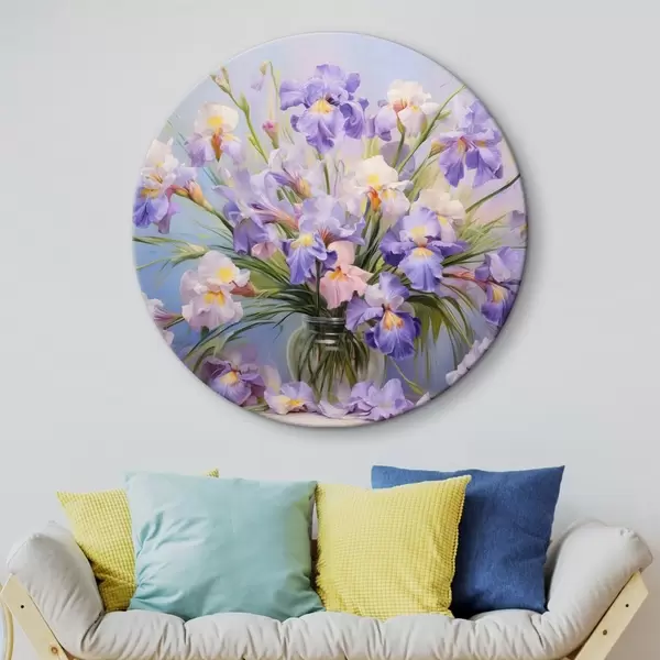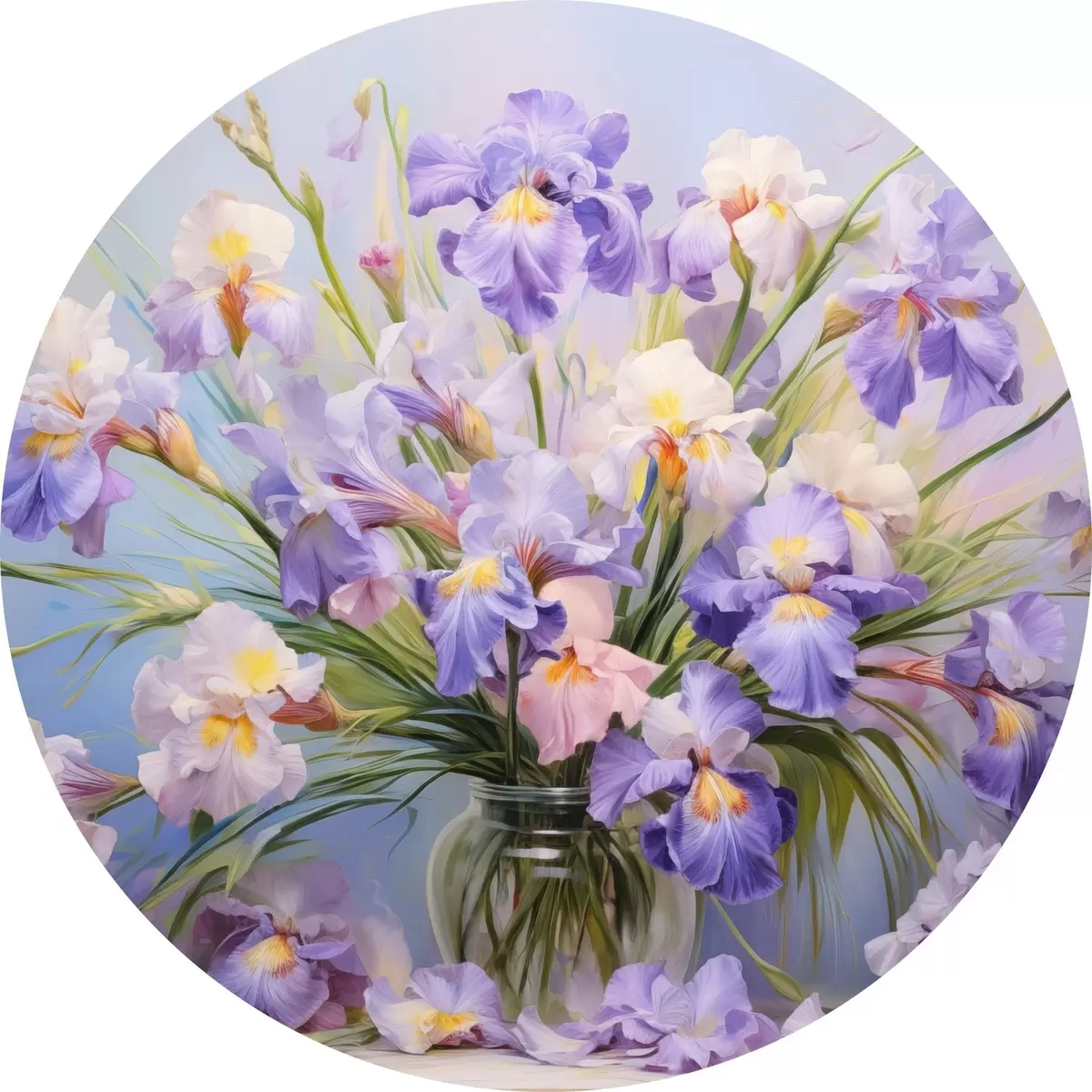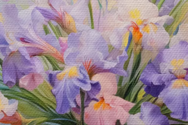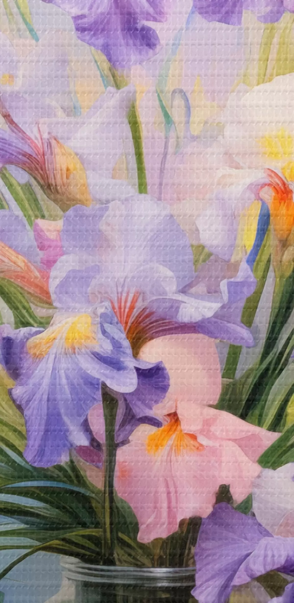 Nuotrauka Vaza su daugybe pastelinių irisų, keli žiedlapiai išbarstyti ant stalo, švelnus pastelinis mėlynos ir rožinės spalvos fonas Nr r44933