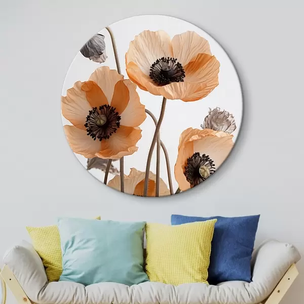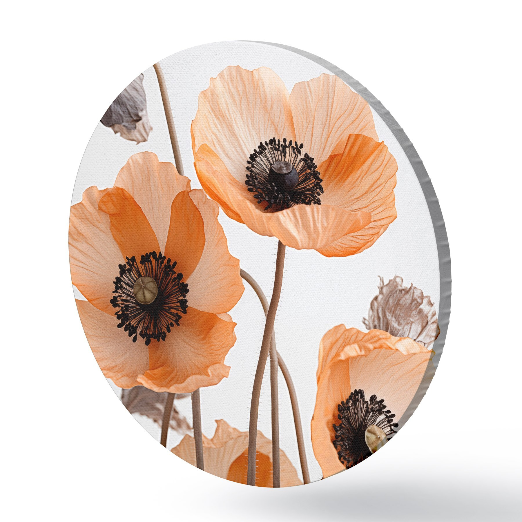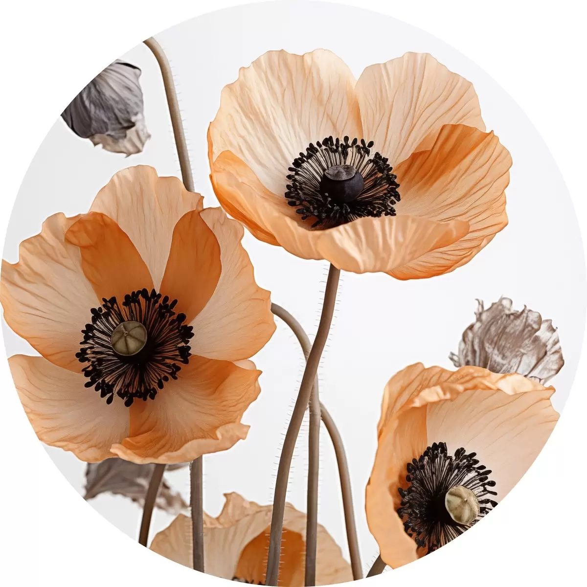 Apvalūs paveikslai Oranžinės aguonos, džiovintos gėlės šviesiame fone, švelnus apšvietimas, subtilūs žiedlapiai, gėlių kompozicija r45167