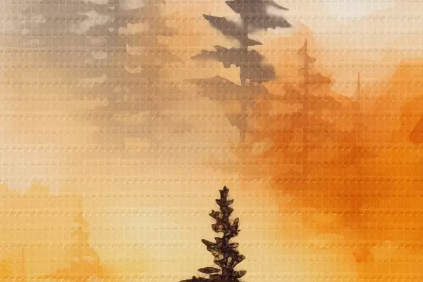 Nuotrauka Peizažo akvarele tapyba, imituojanti mišką su aukštomis pušimis ir kalnais fone Nr r45170