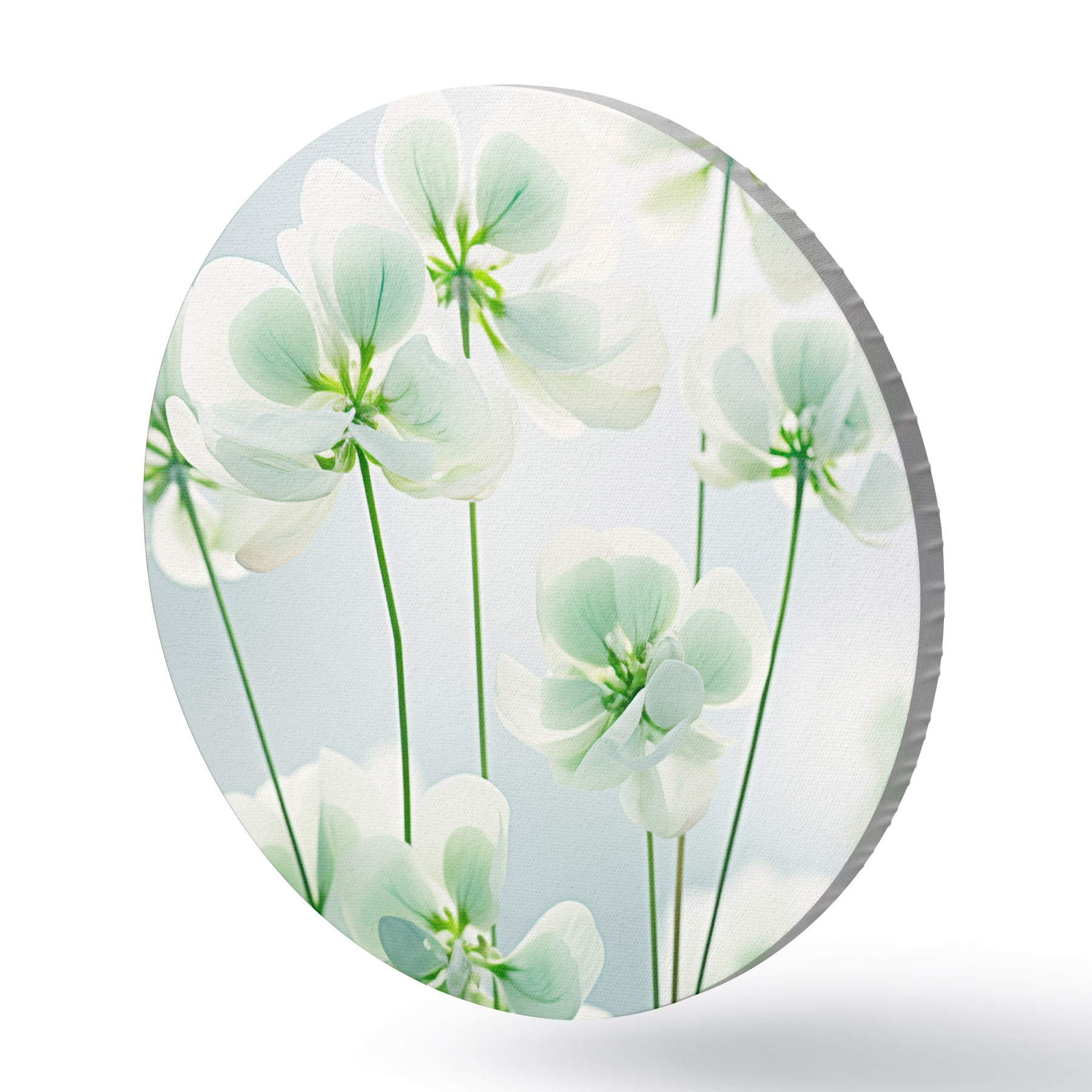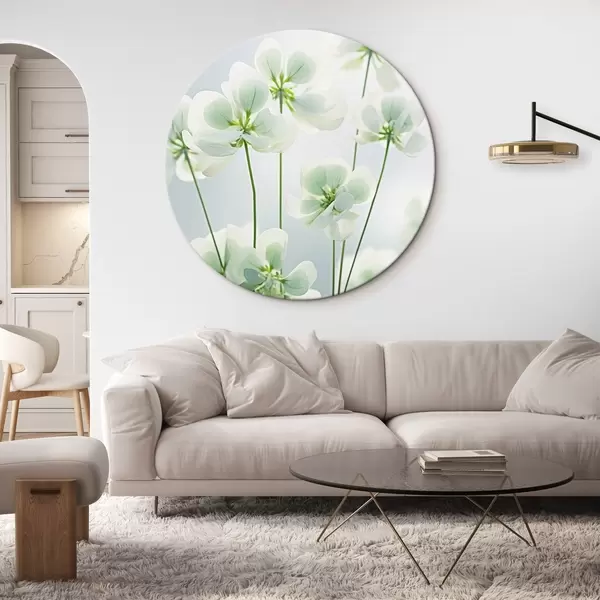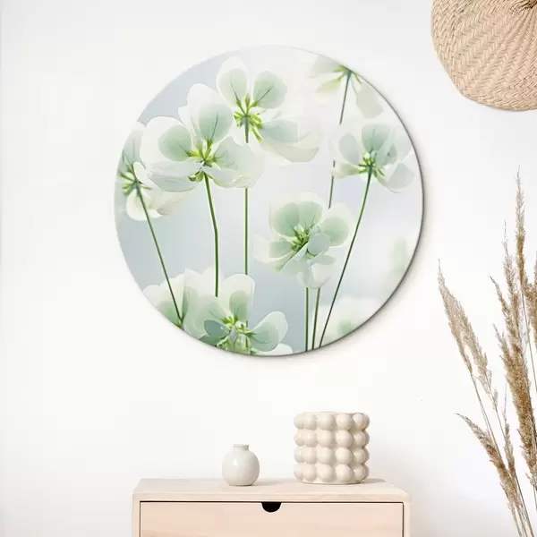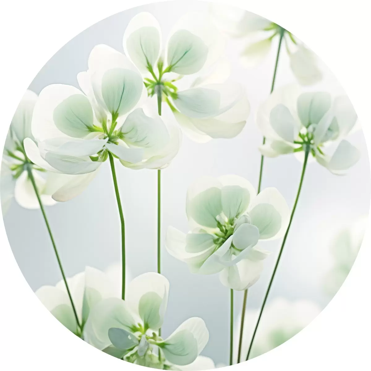 Nuotrauka Baltų dobilų gėlės su žaliu stiebu ir lapais, minkštas apšvietimas, švarus fonas, minimalistinė kompozicija, botaninis Nr r45172