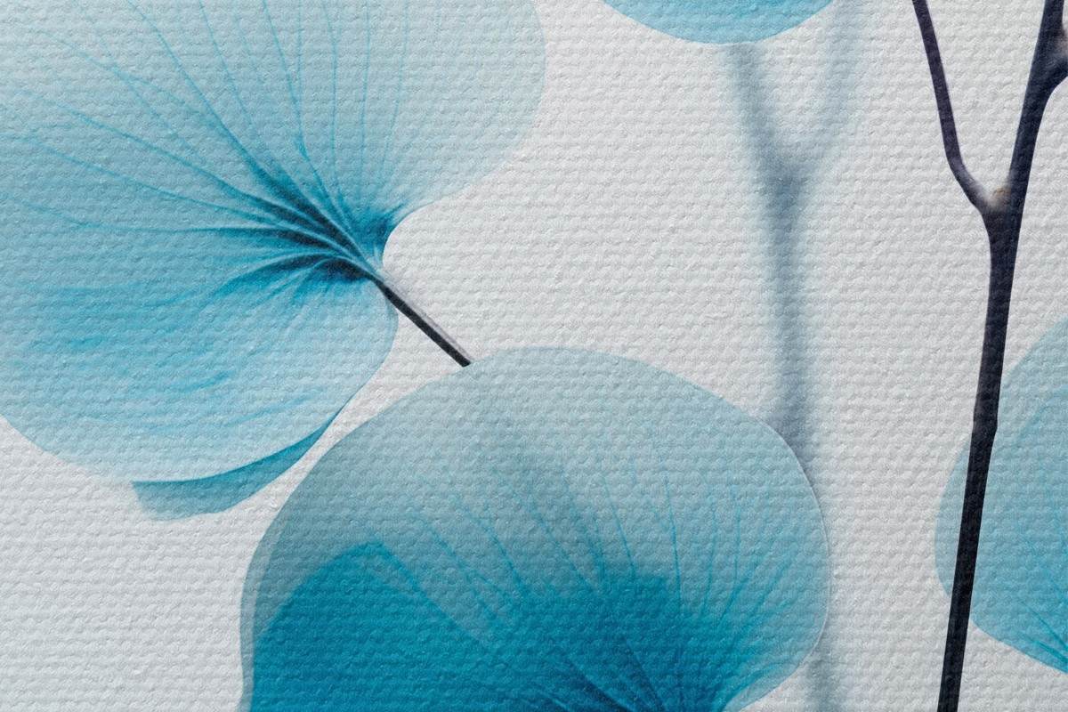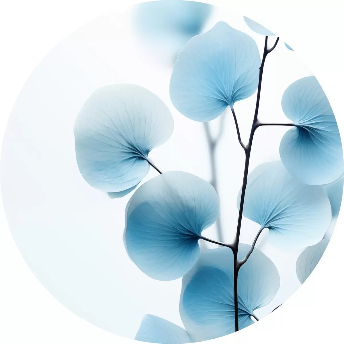 Nuotrauka Šaka su permatomais mėlynais lapais, matomos subtilios gyslos, lengva ir rami kompozicija, minimalistinė estetika Nr r45176