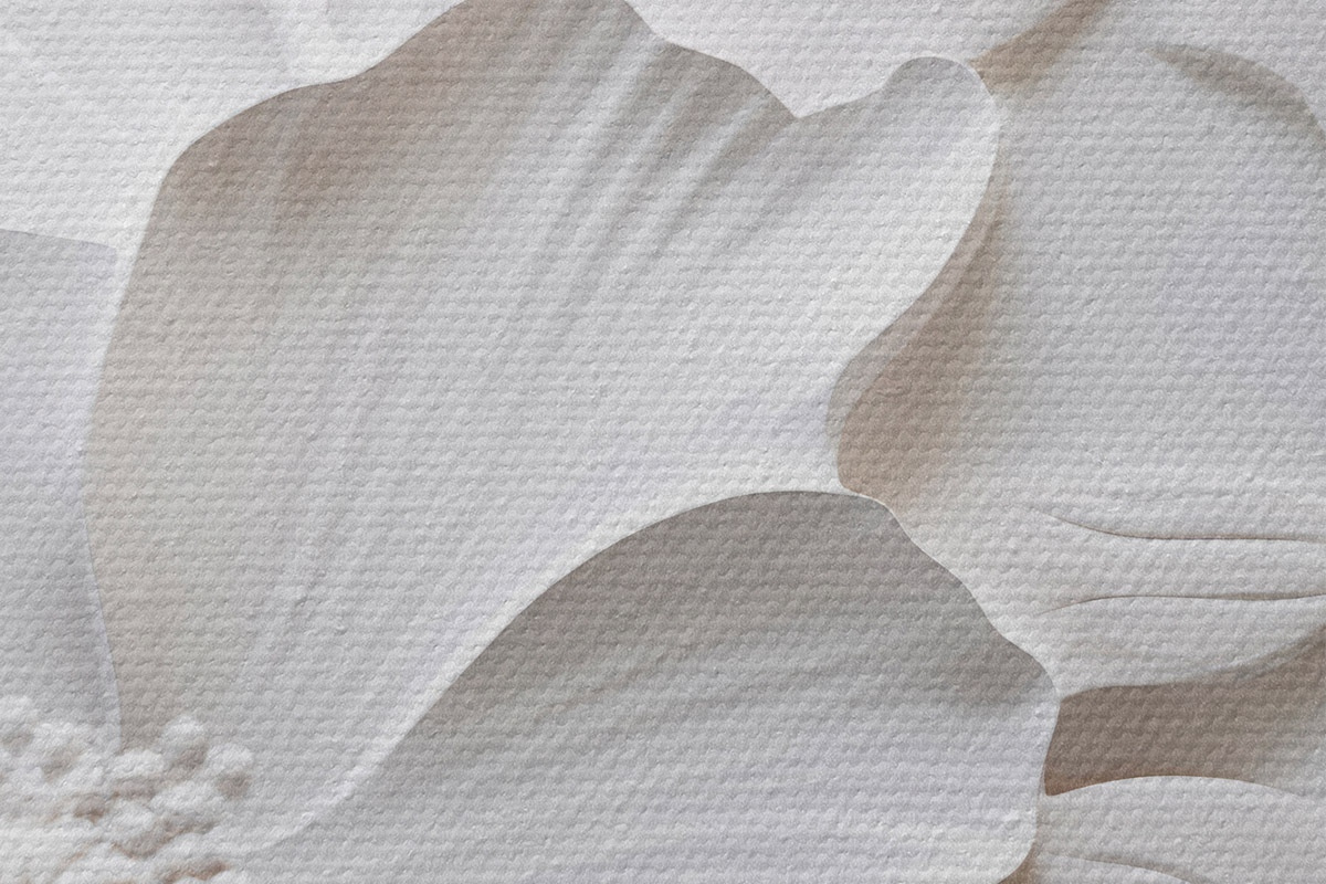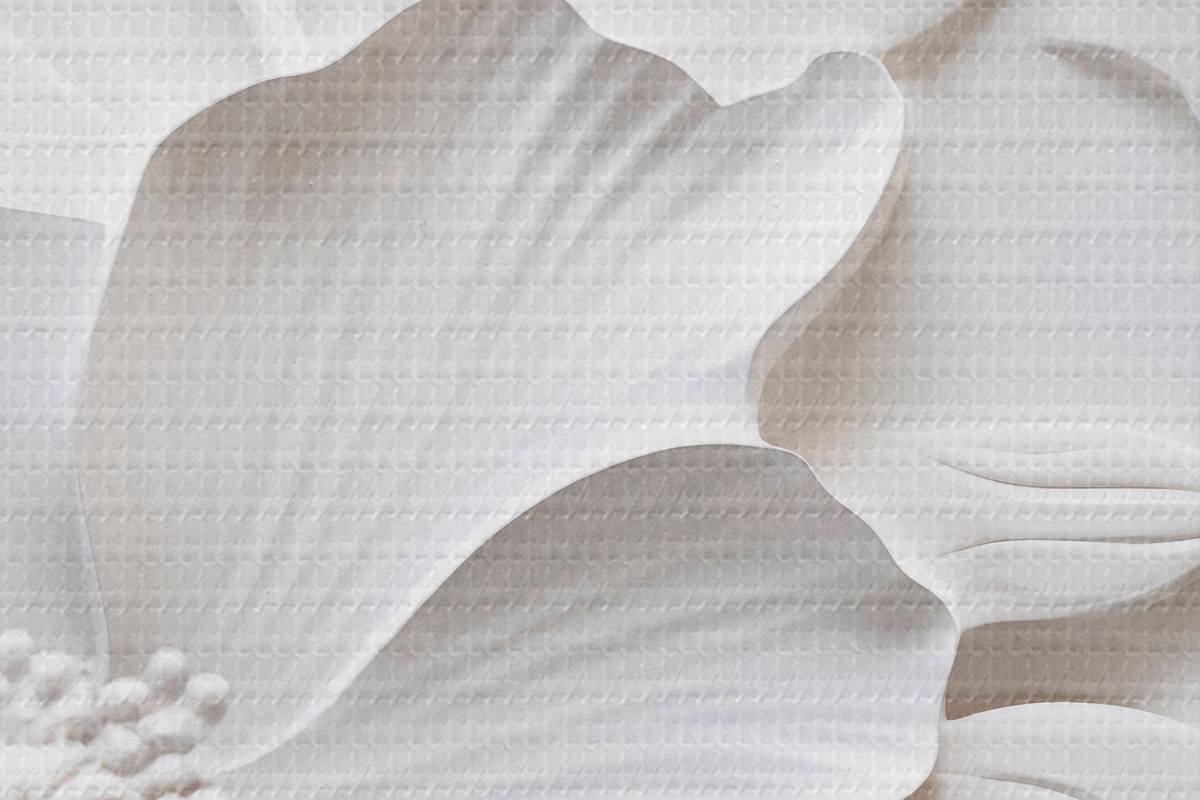 Nuotrauka Dekoratyvios minimalistinės baltos gėlės su lapais, reljefo imitacija, baltas fonas Nr r45180