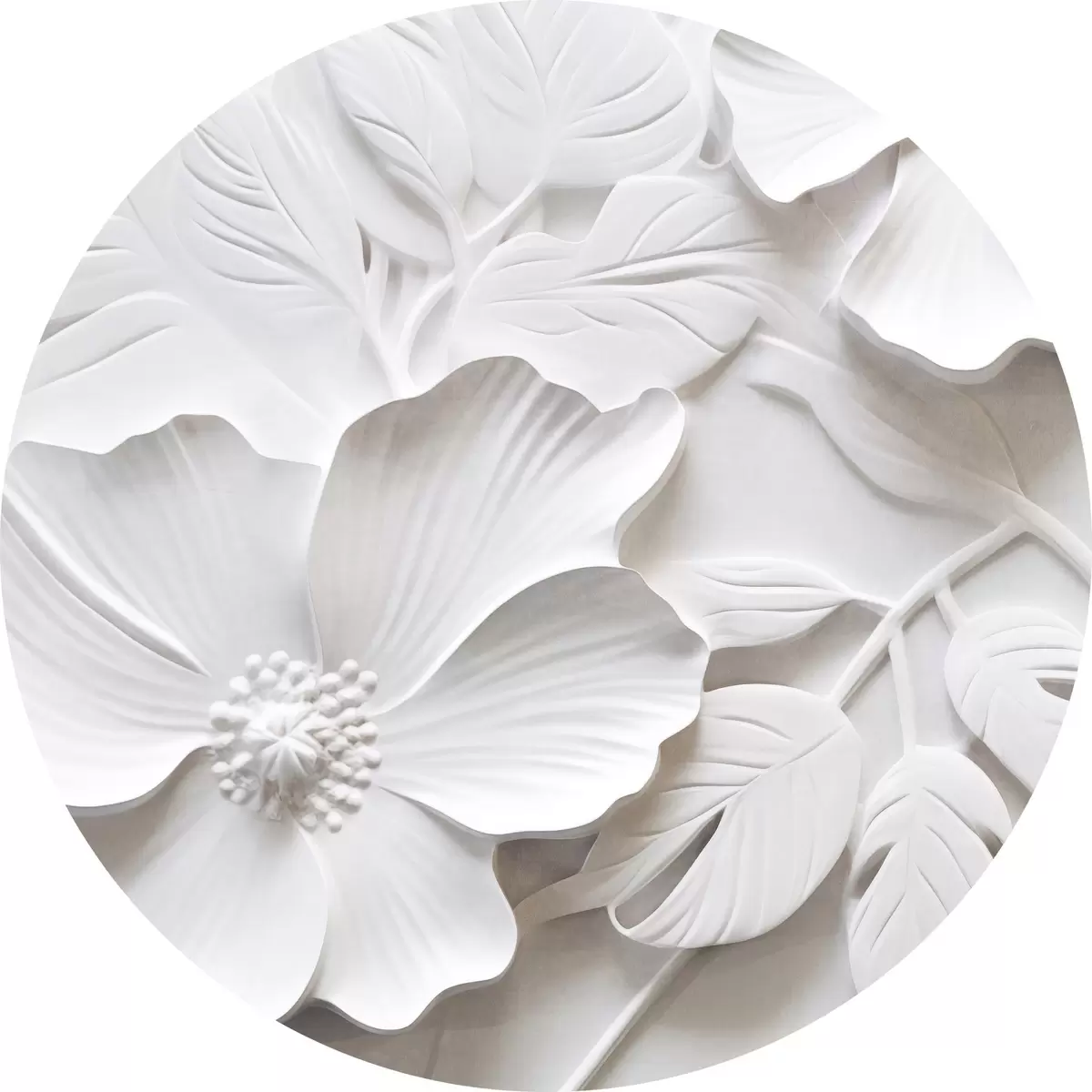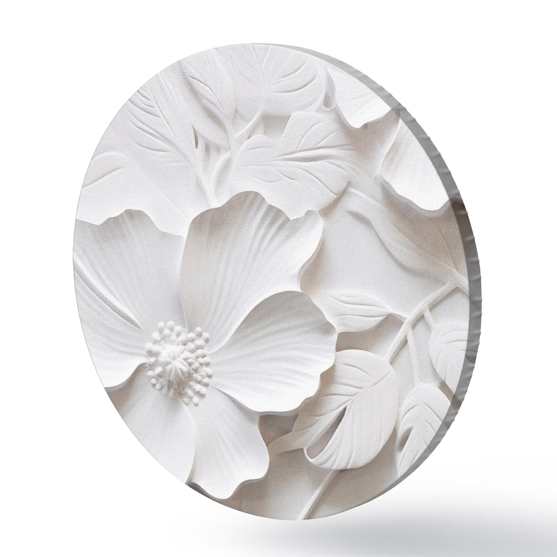 Apvalūs paveikslai Dekoratyvios minimalistinės baltos gėlės su lapais, reljefo imitacija, baltas fonas r45180