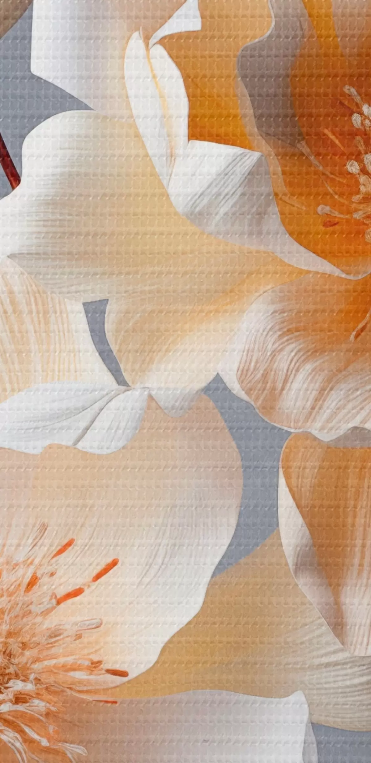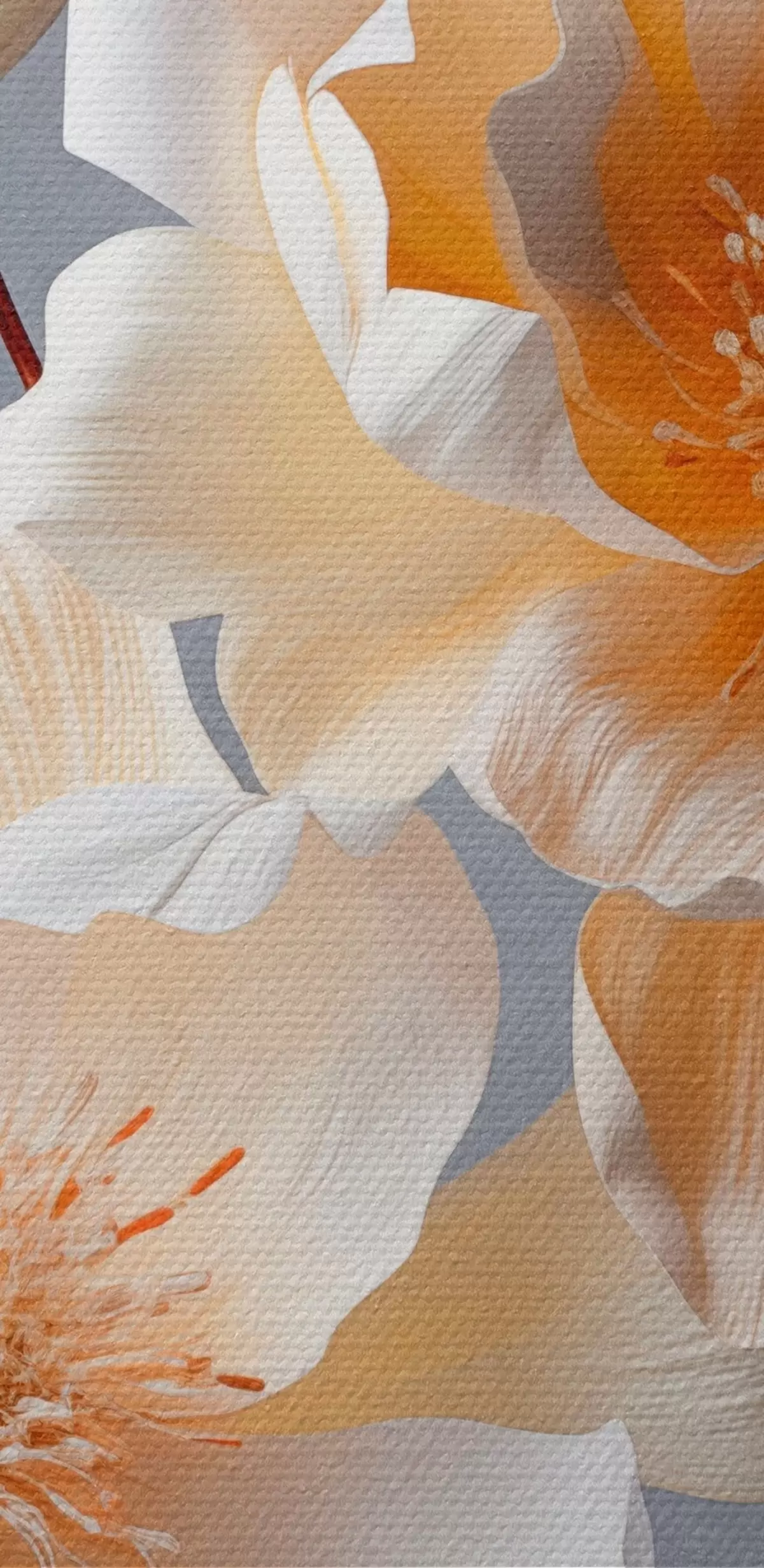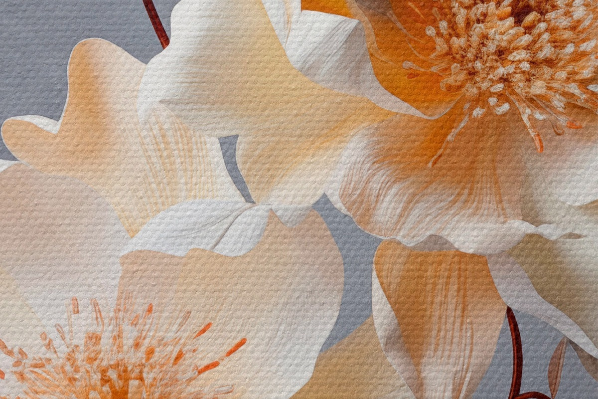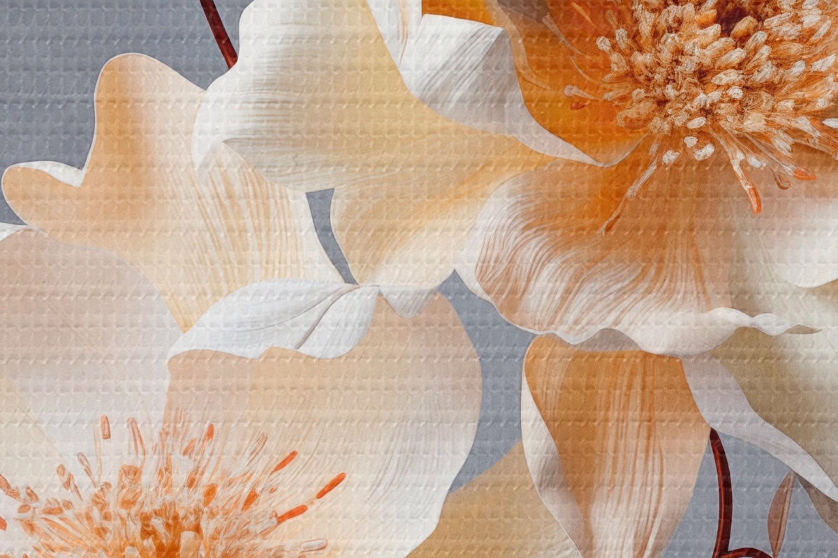 Nuotrauka Tekstūruotos gėlės su oranžiniais piesteliais ir oranžiniais lapais pilkame fone, minkšta šviesa, elegantiškas, detalus, realistiškas Nr r45181