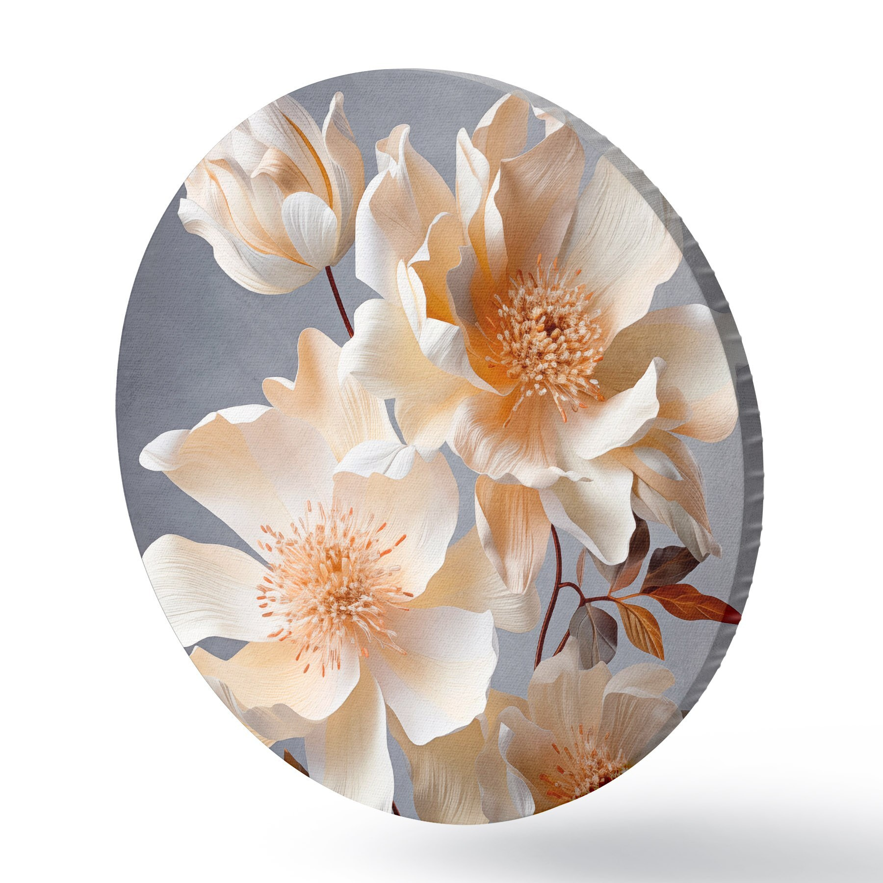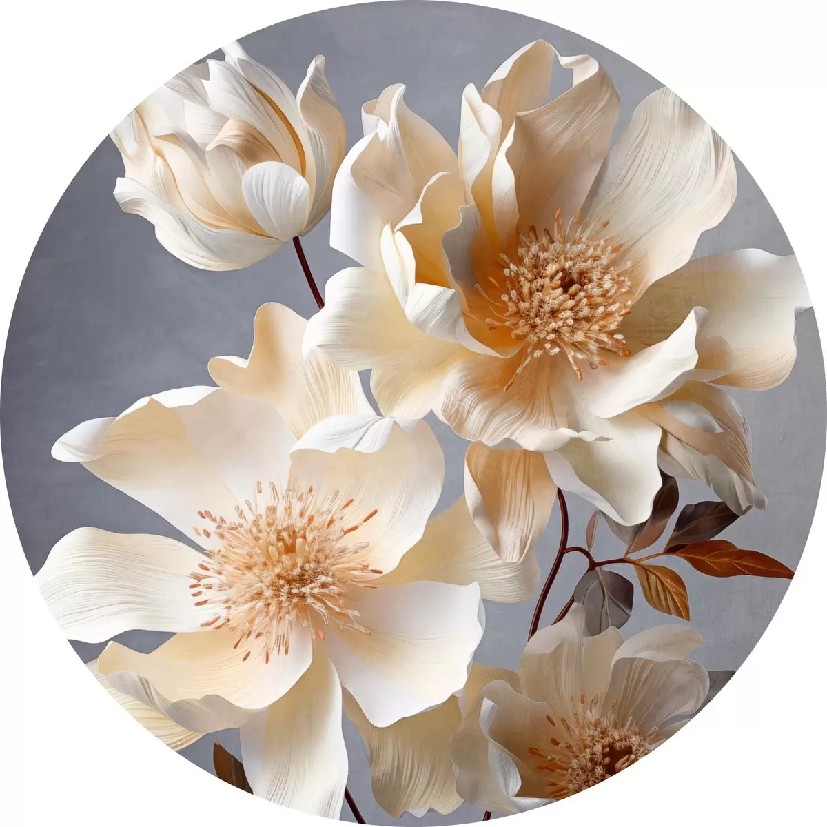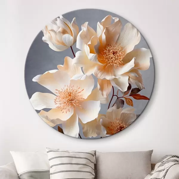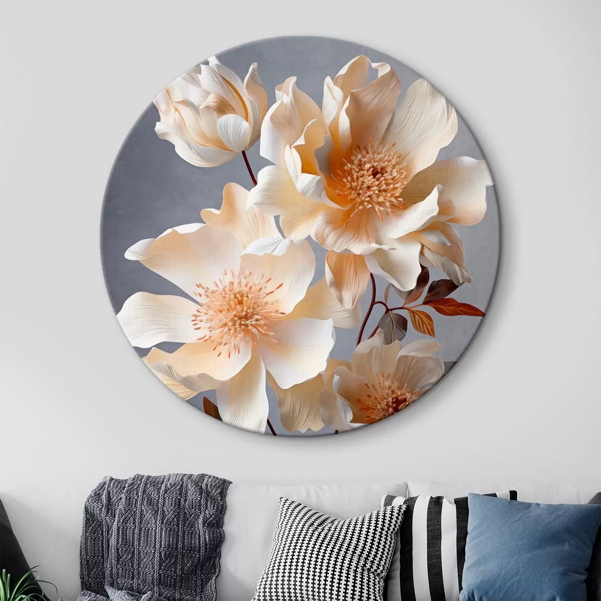 Nuotrauka Tekstūruotos gėlės su oranžiniais piesteliais ir oranžiniais lapais pilkame fone, minkšta šviesa, elegantiškas, detalus, realistiškas Nr r45181