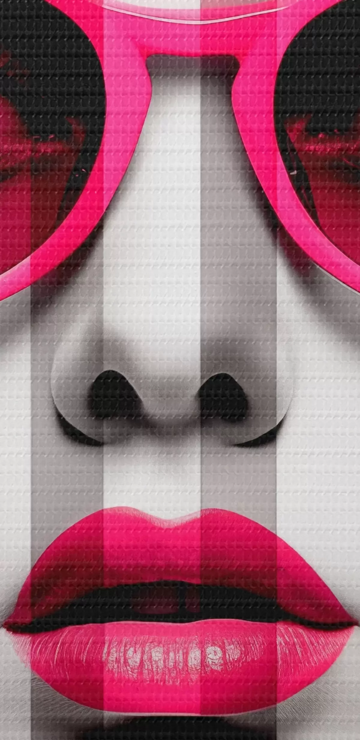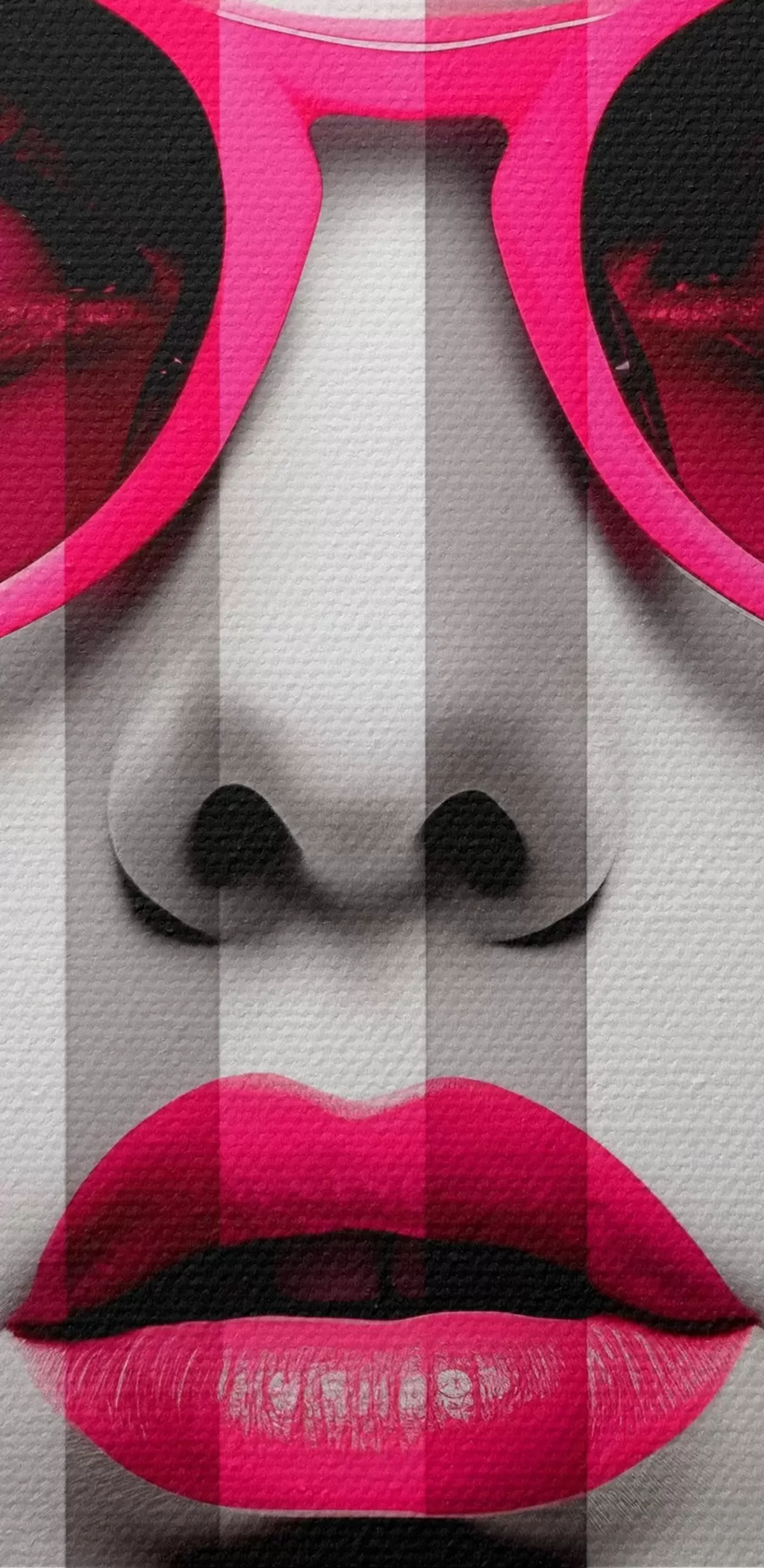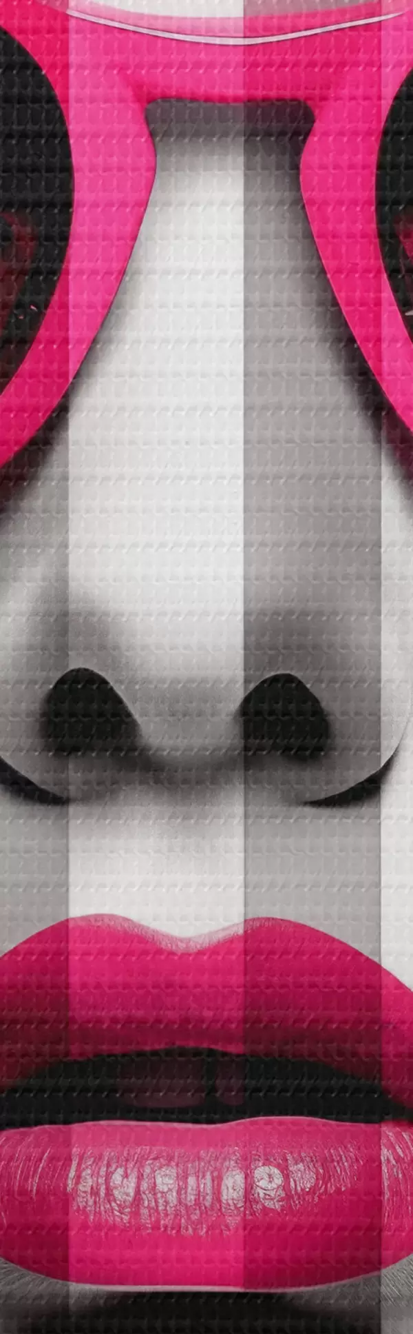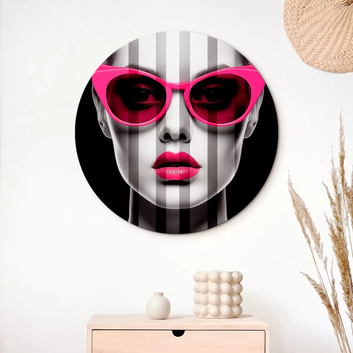 Nuotrauka Moteris, dėvinti rožinius akinius su juodais ir baltais dryžiais Nr r45315