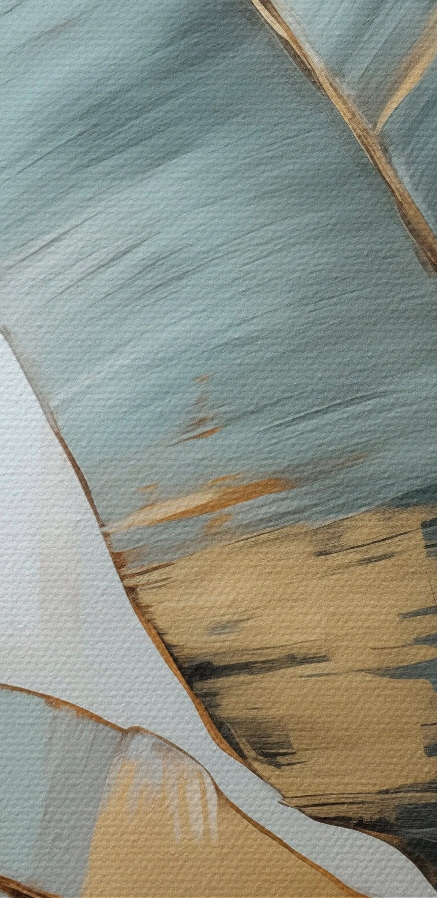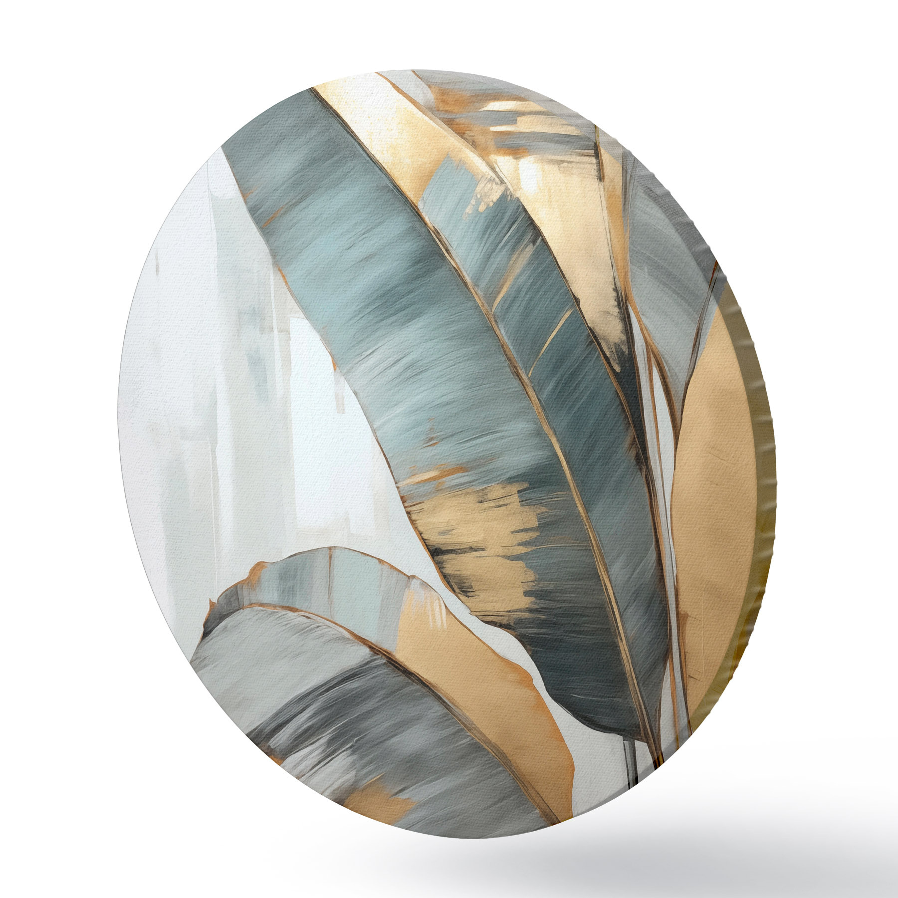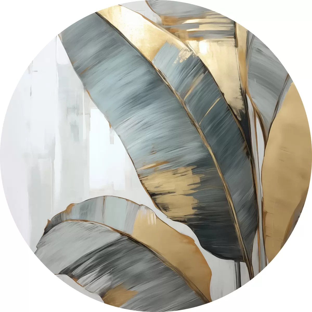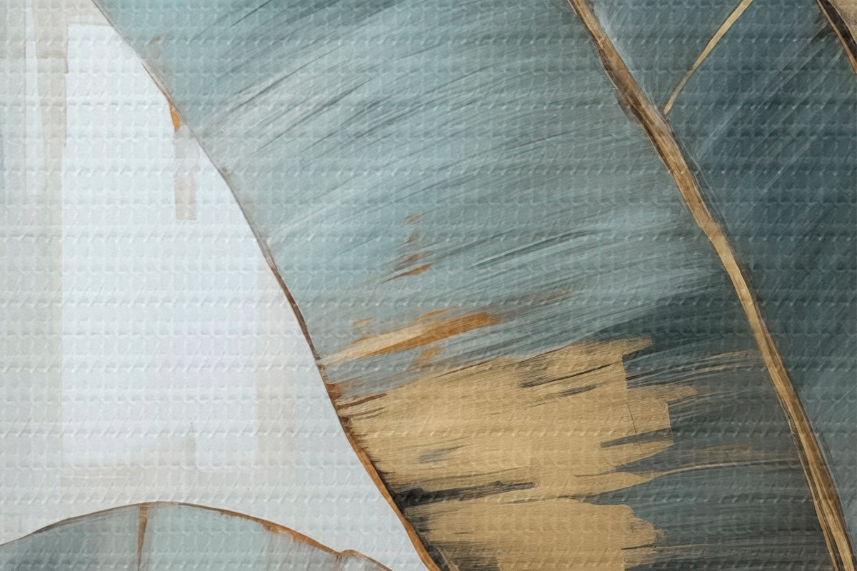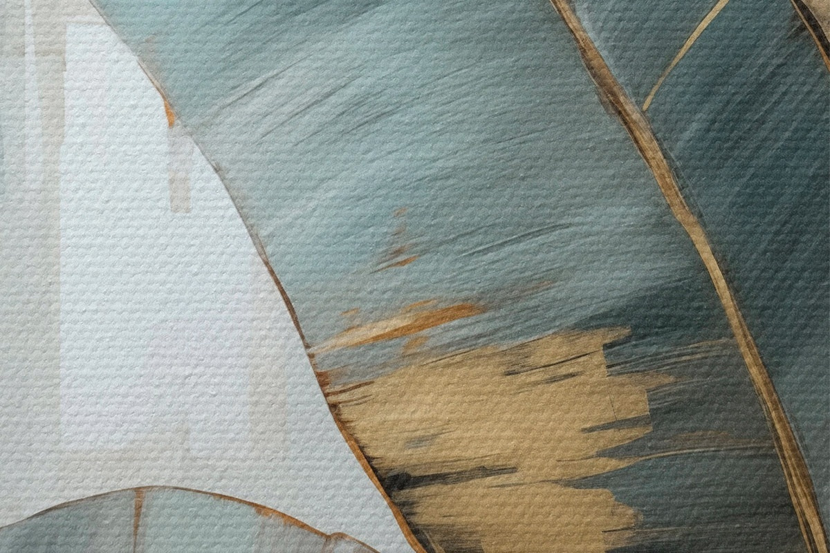Nuotrauka Prislopintų mėlynų, pilkų ir geltonų bananų lapų rinkinys su matomais teptuko potėpiais baltame abstrakčiame fone Nr r45551