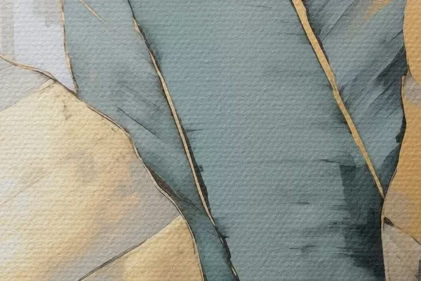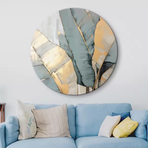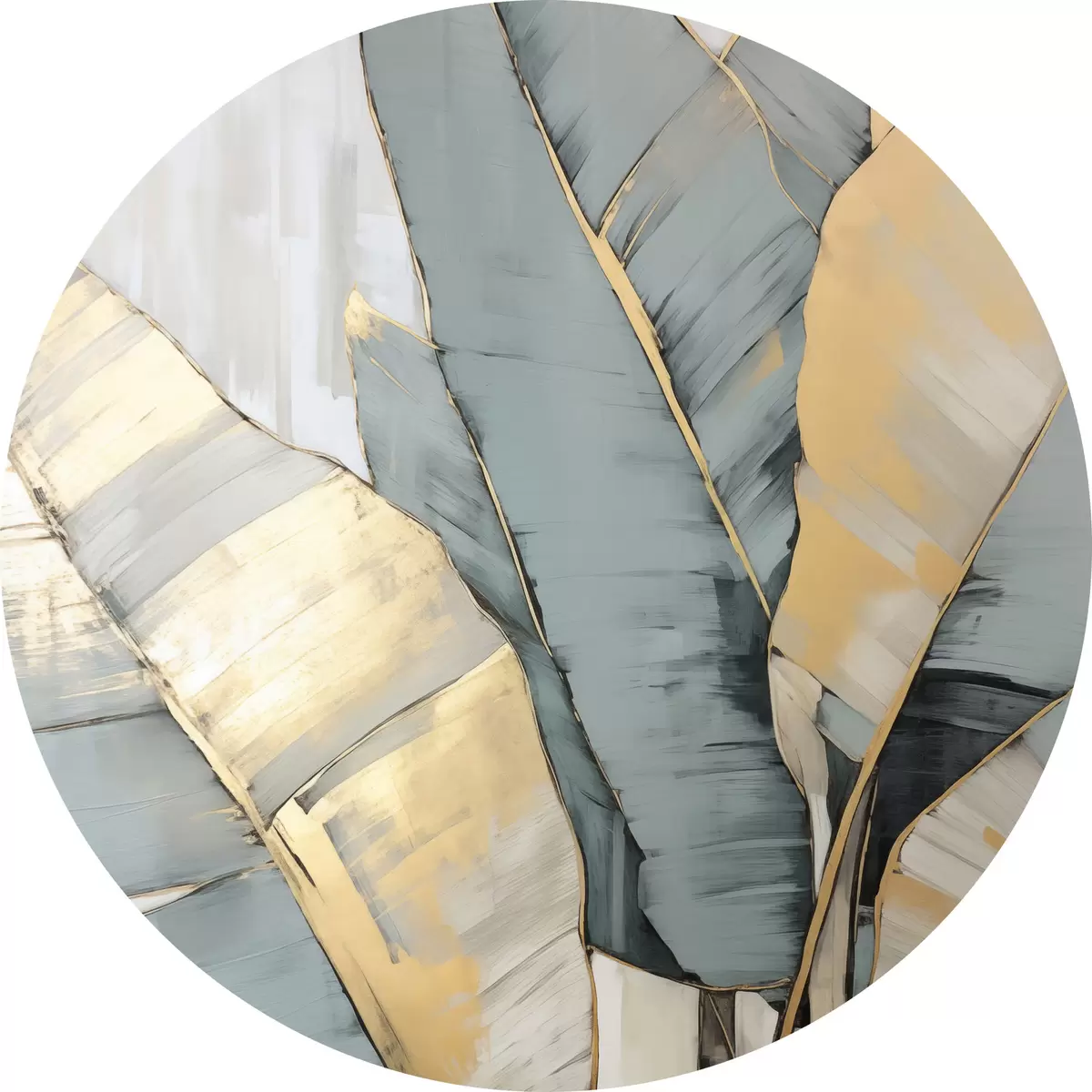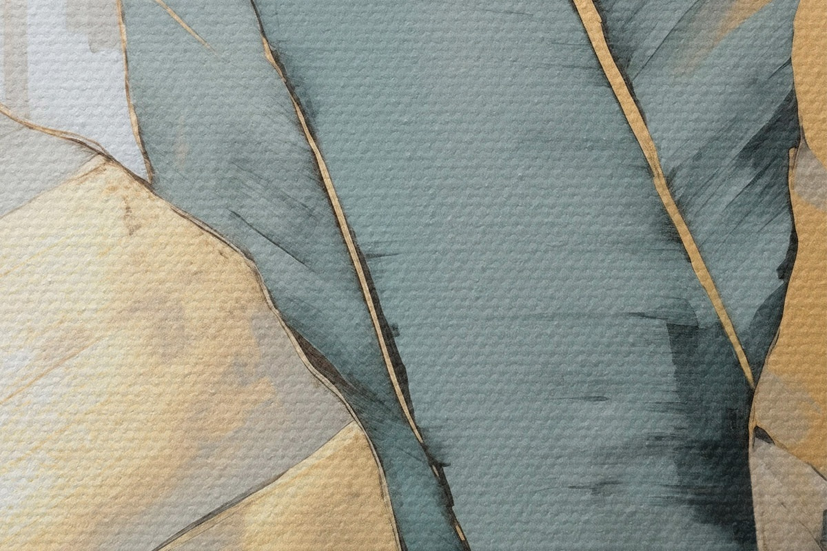 Nuotrauka Prislopinti mėlyni, pilki ir geltoni bananų lapai su matomais teptuko potėpiais baltame abstrakčiame fone Nr r45552