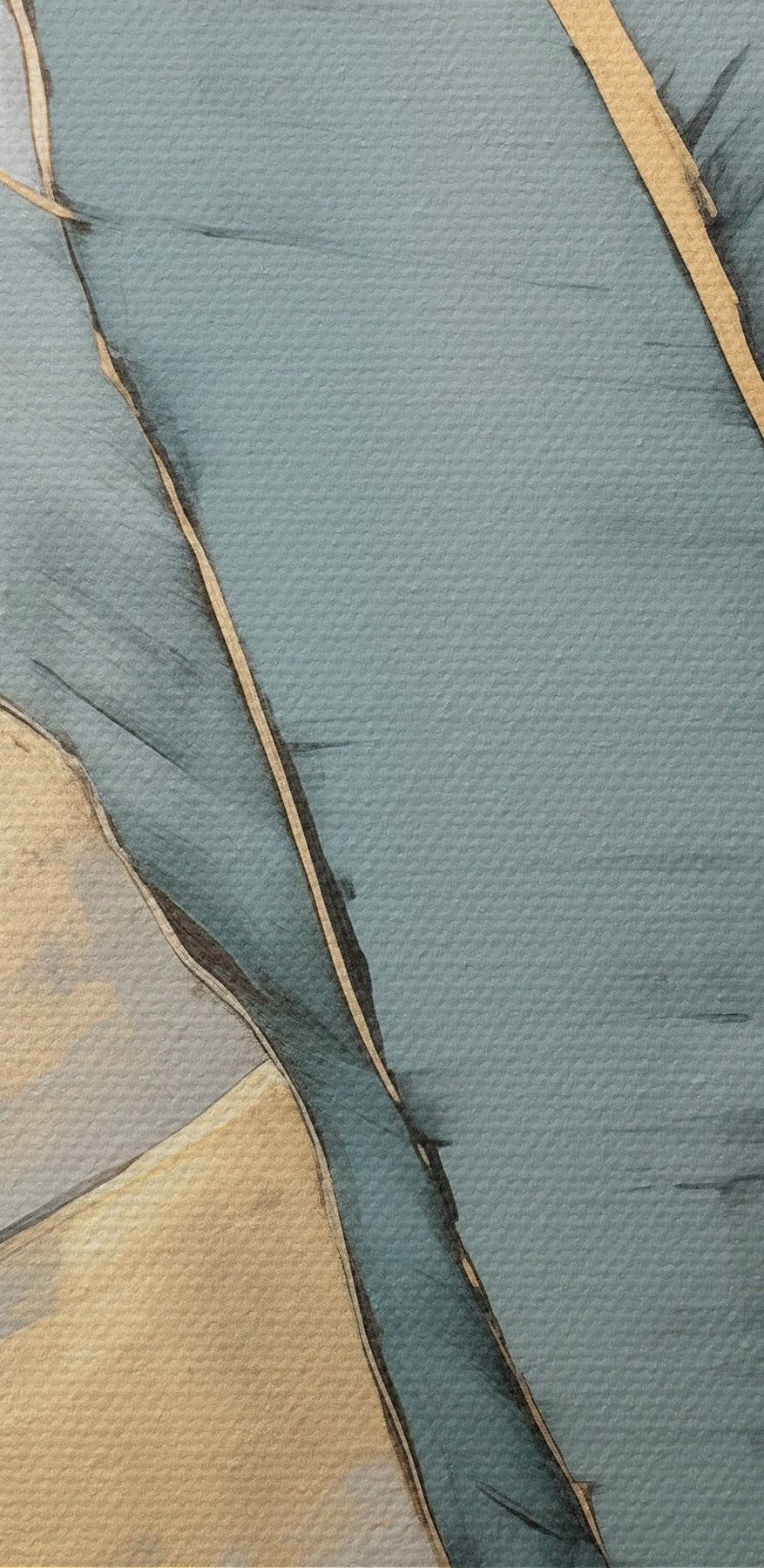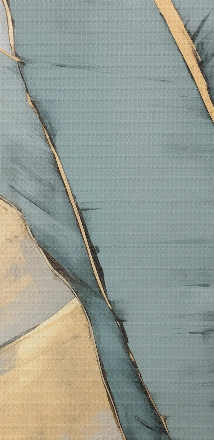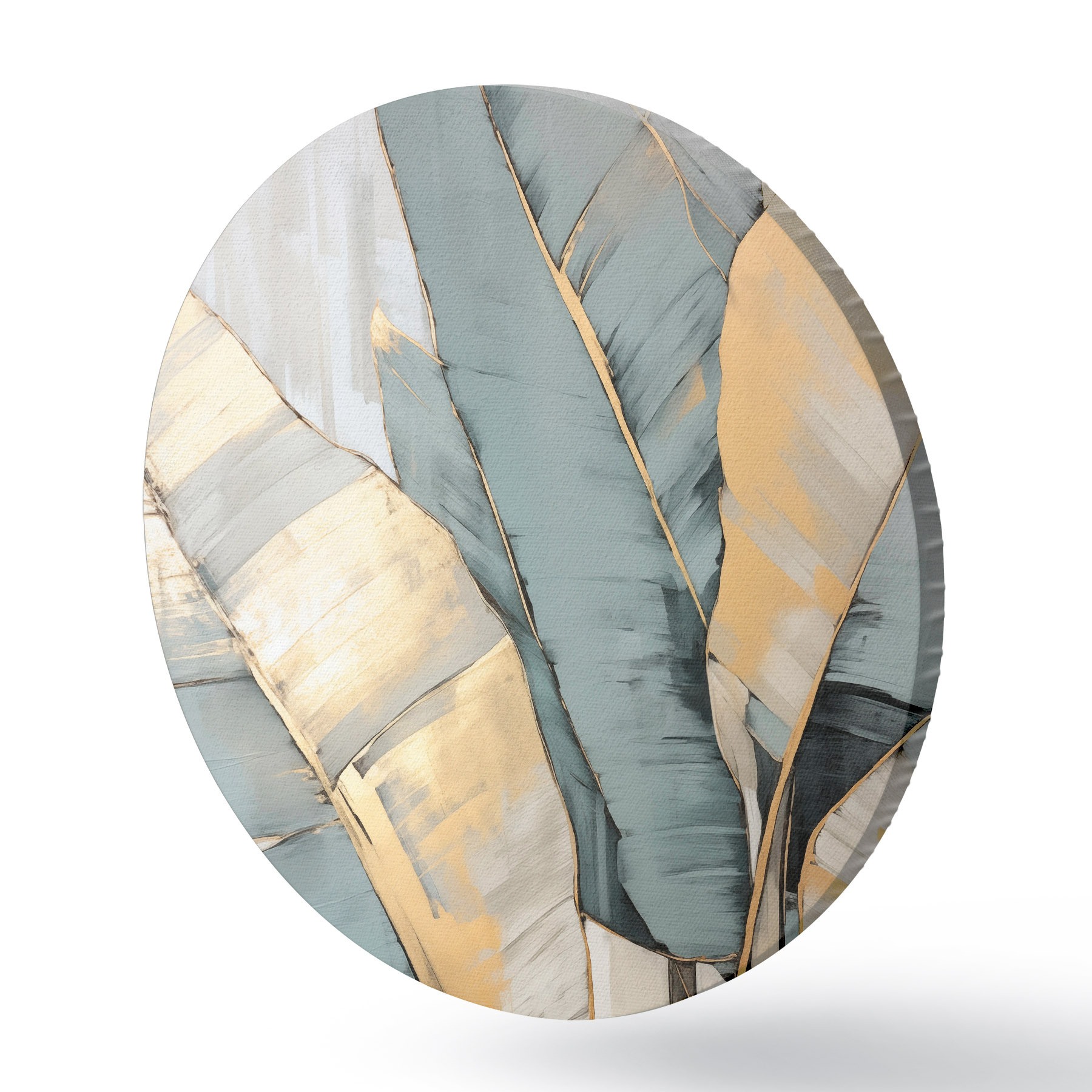 Nuotrauka Prislopinti mėlyni, pilki ir geltoni bananų lapai su matomais teptuko potėpiais baltame abstrakčiame fone Nr r45552