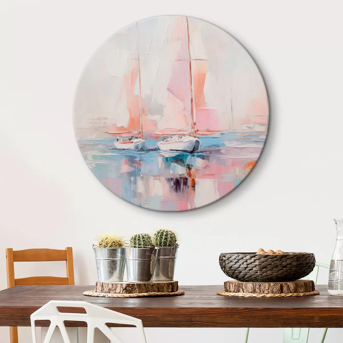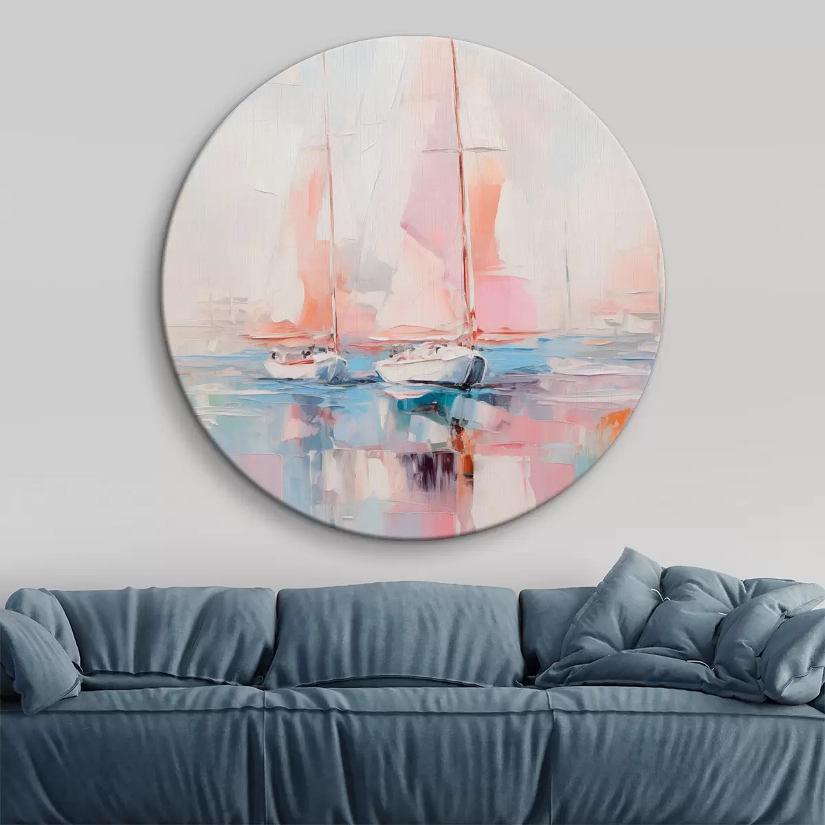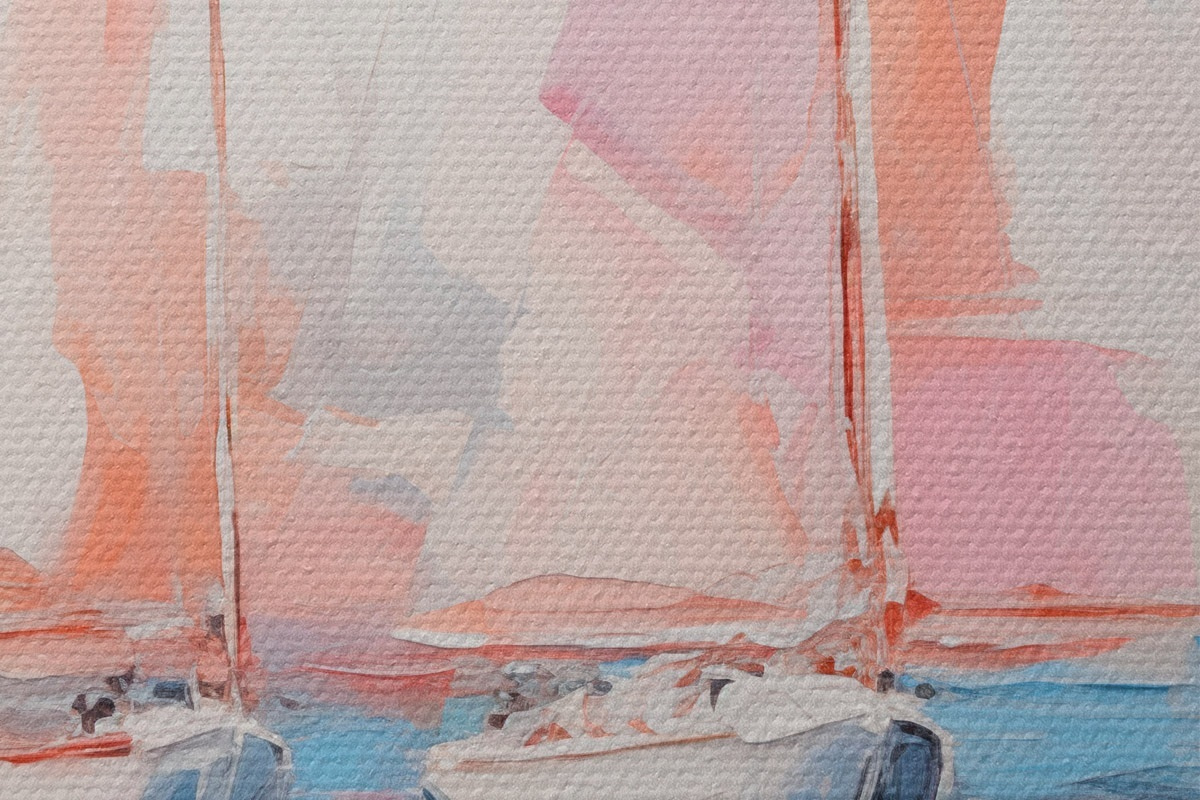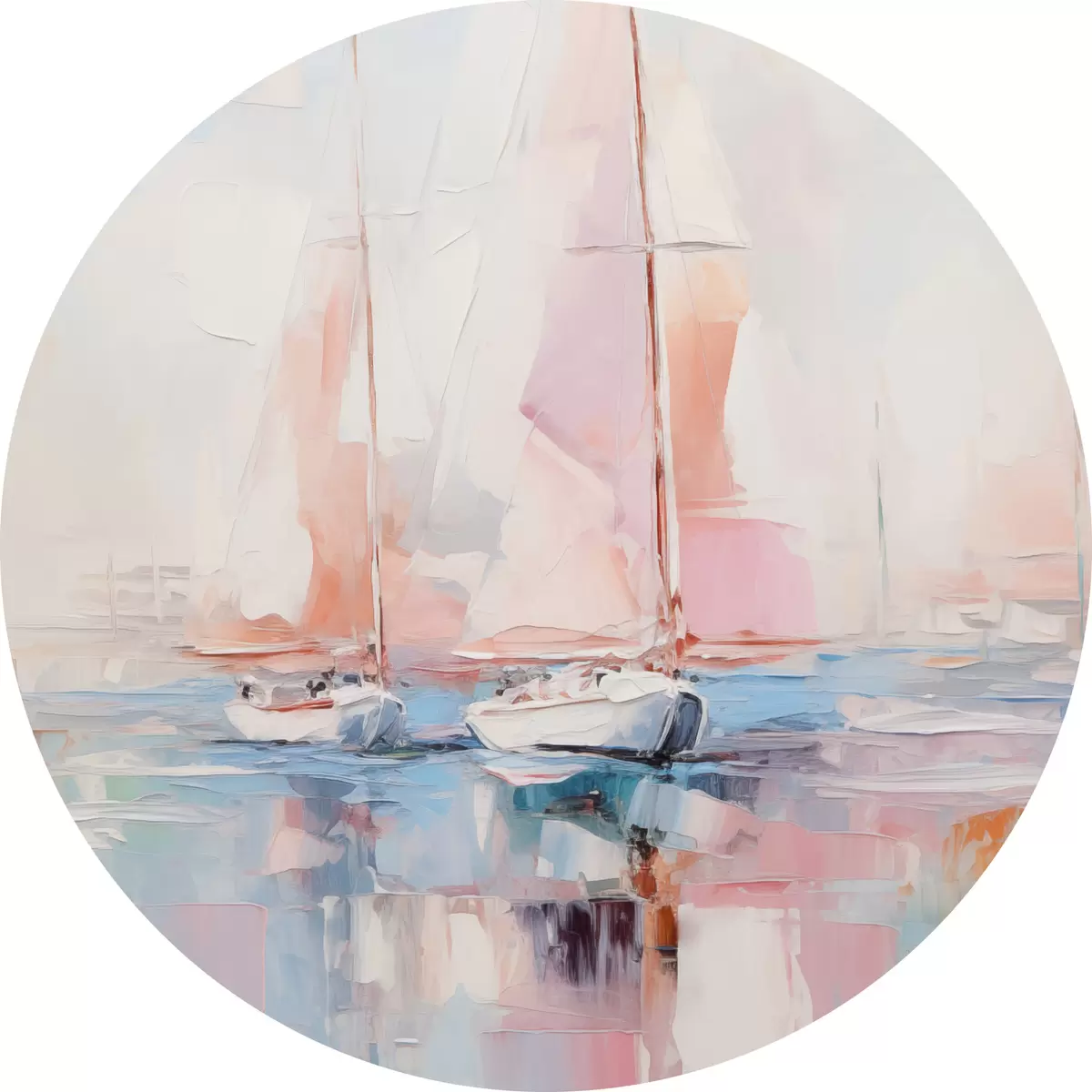 Nuotrauka Ramioje jūroje plaukiojančios burinės valtys su rausvomis burėmis, valčių atspindžiai vandenyje, švelnios pastelinės spalvos Nr r45557