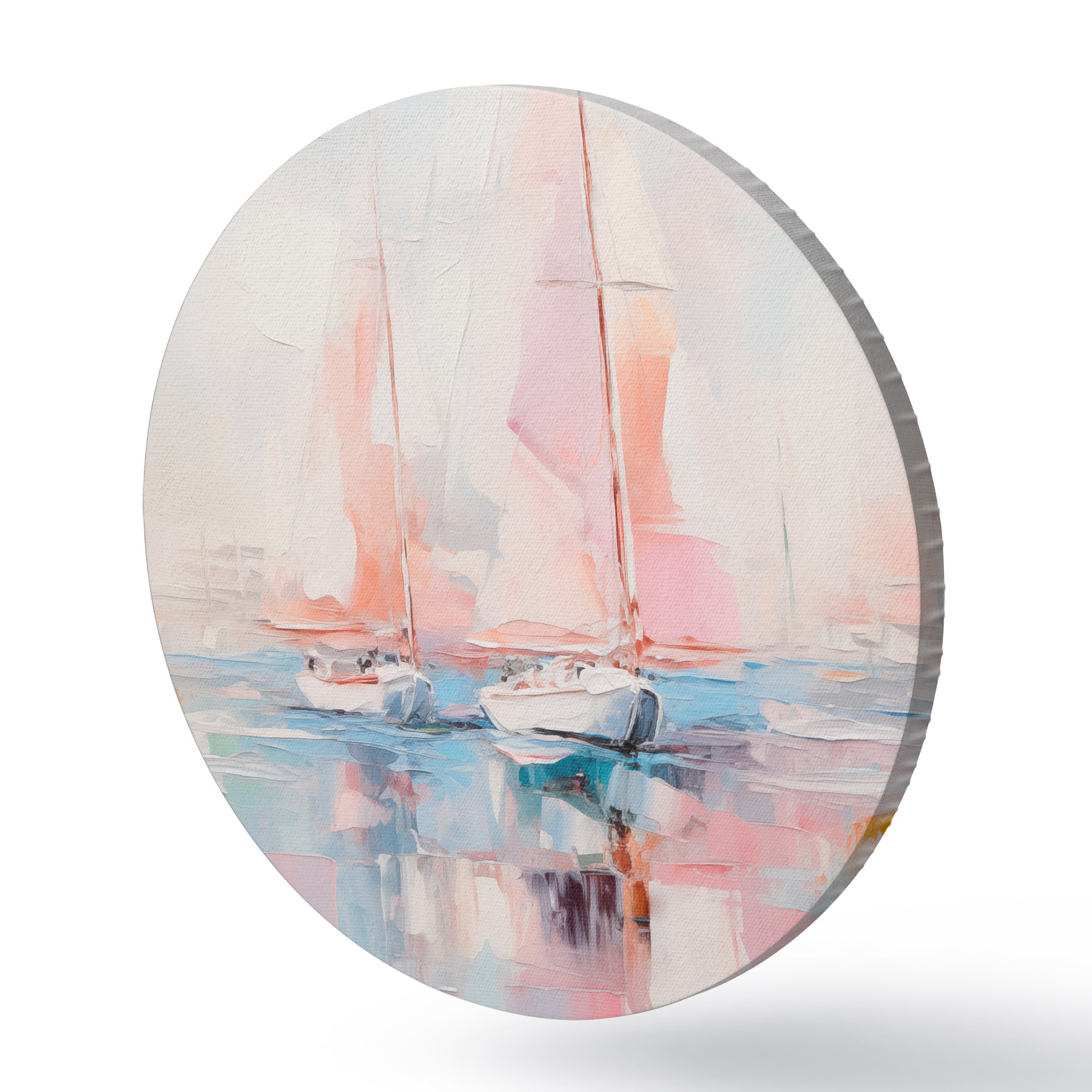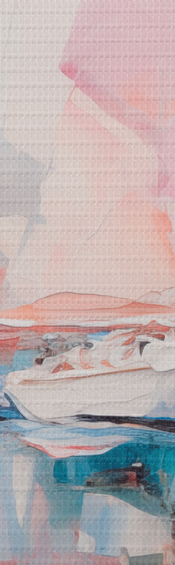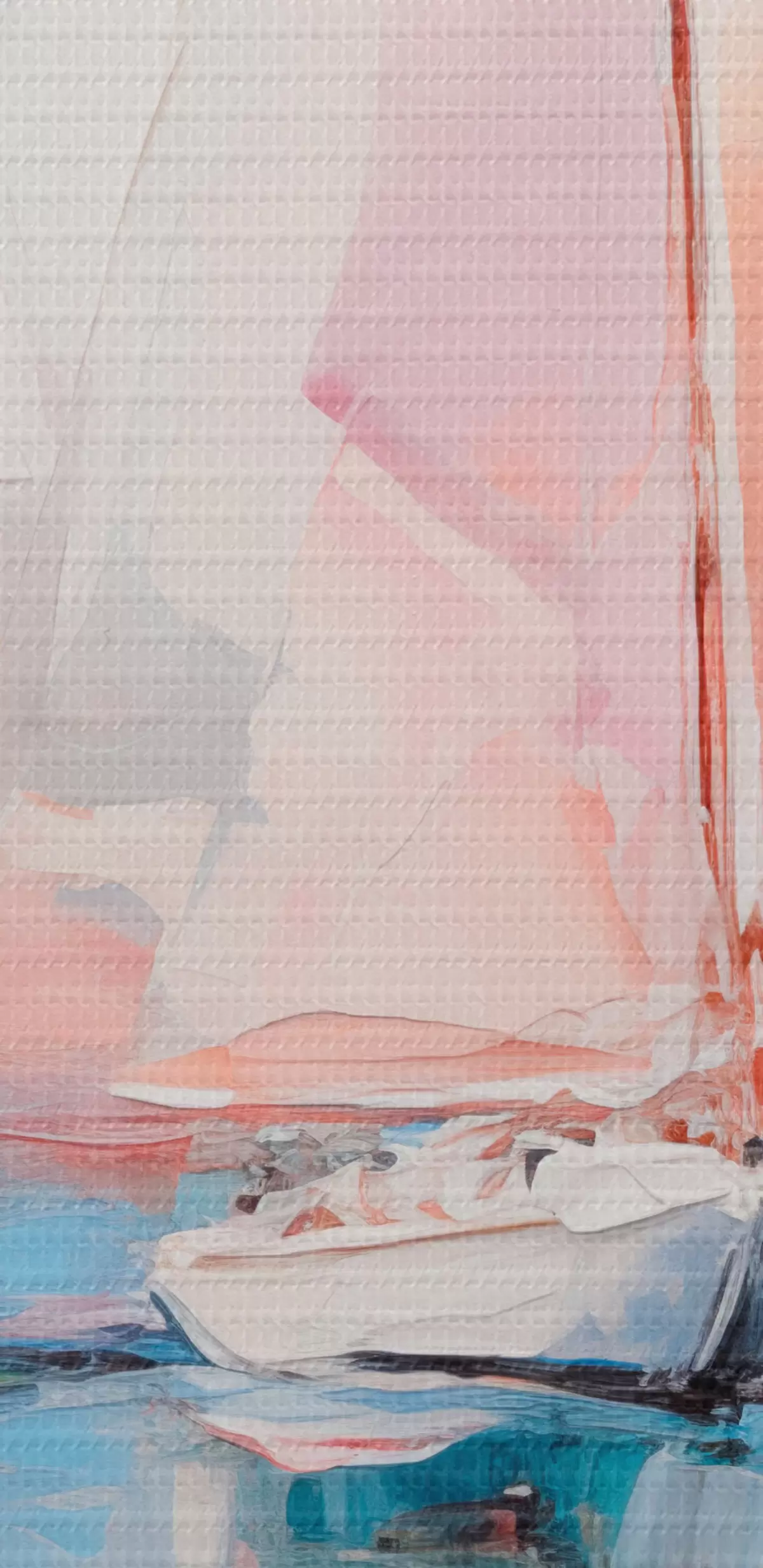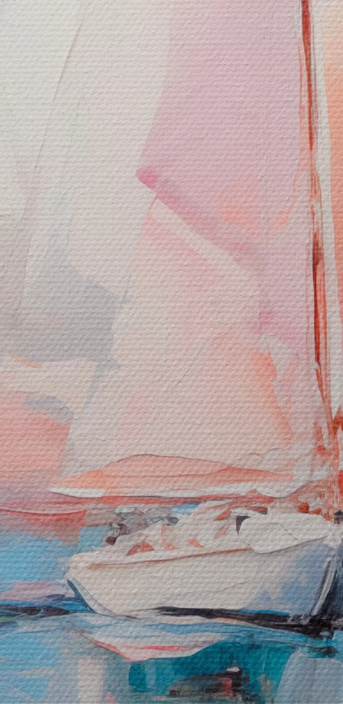 Nuotrauka Ramioje jūroje plaukiojančios burinės valtys su rausvomis burėmis, valčių atspindžiai vandenyje, švelnios pastelinės spalvos Nr r45557
