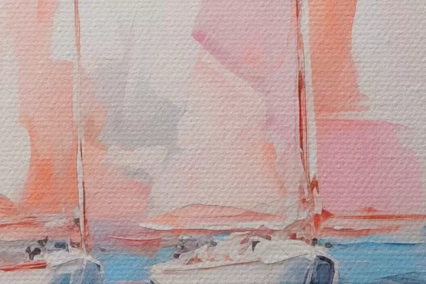 Nuotrauka Ramioje jūroje plaukiojančios burinės valtys su rausvomis burėmis, valčių atspindžiai vandenyje, švelnios pastelinės spalvos Nr r45557