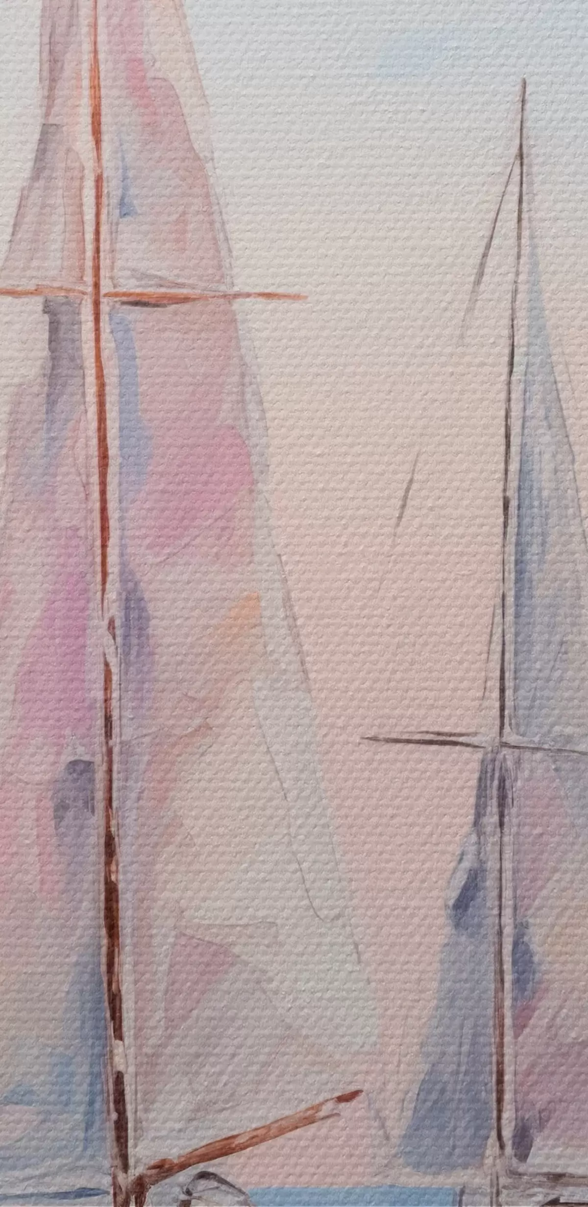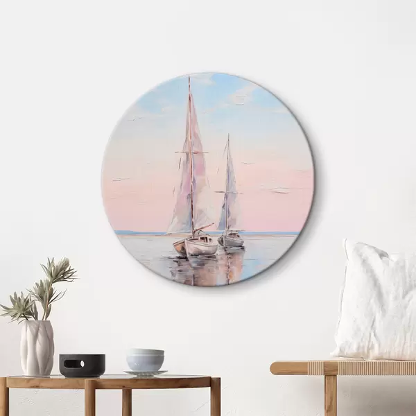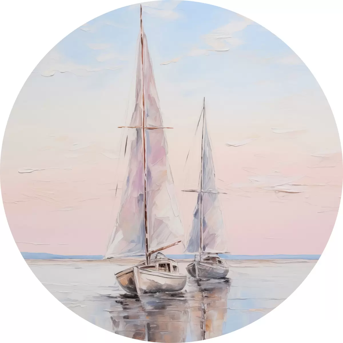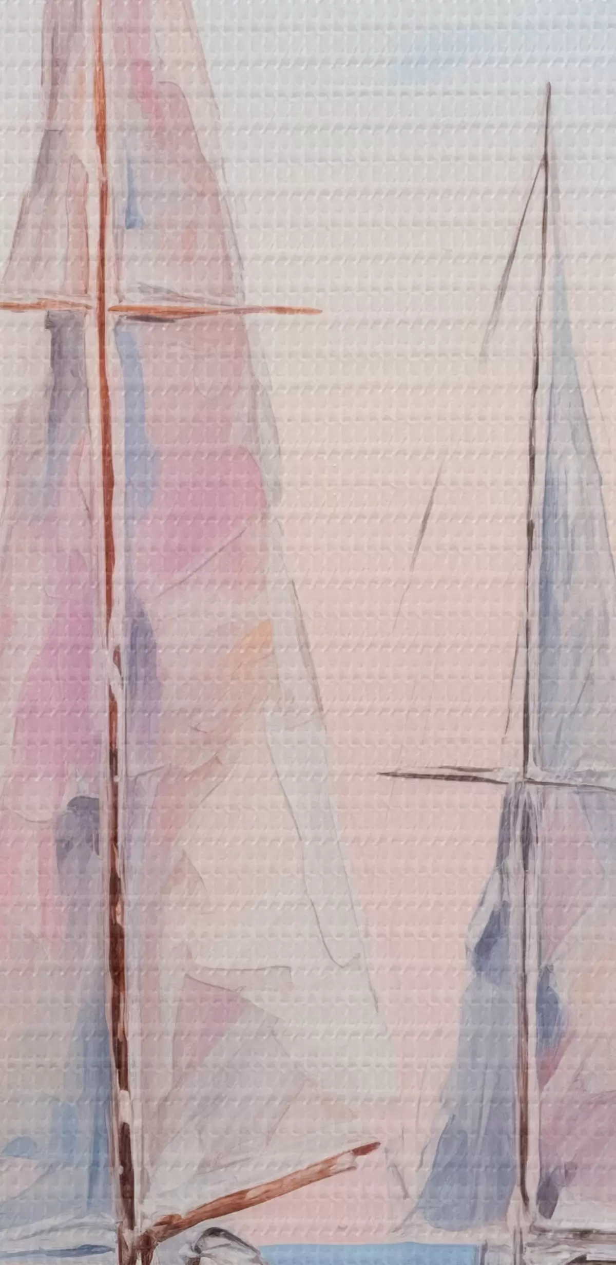 Nuotrauka Ramioje jūroje plaukiojančios burinės valtys su rausvomis burėmis, valčių atspindžiai vandenyje, švelnios pastelinės spalvos Nr r45558