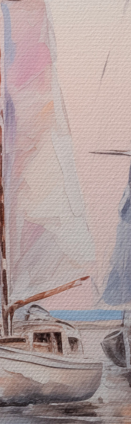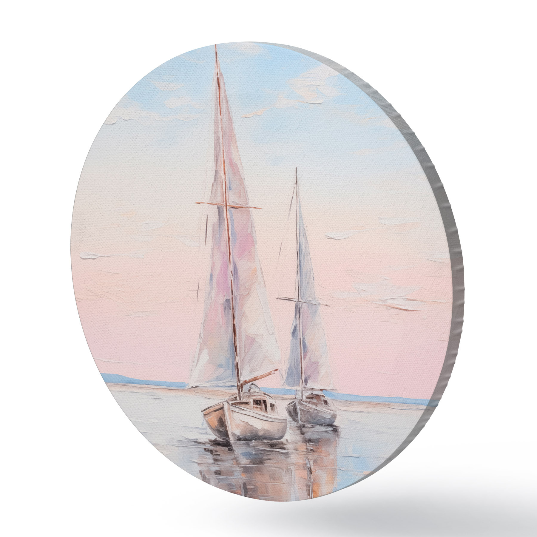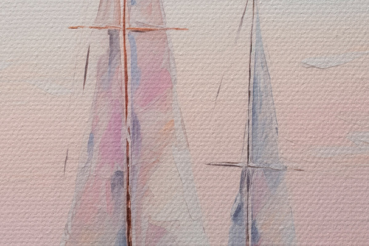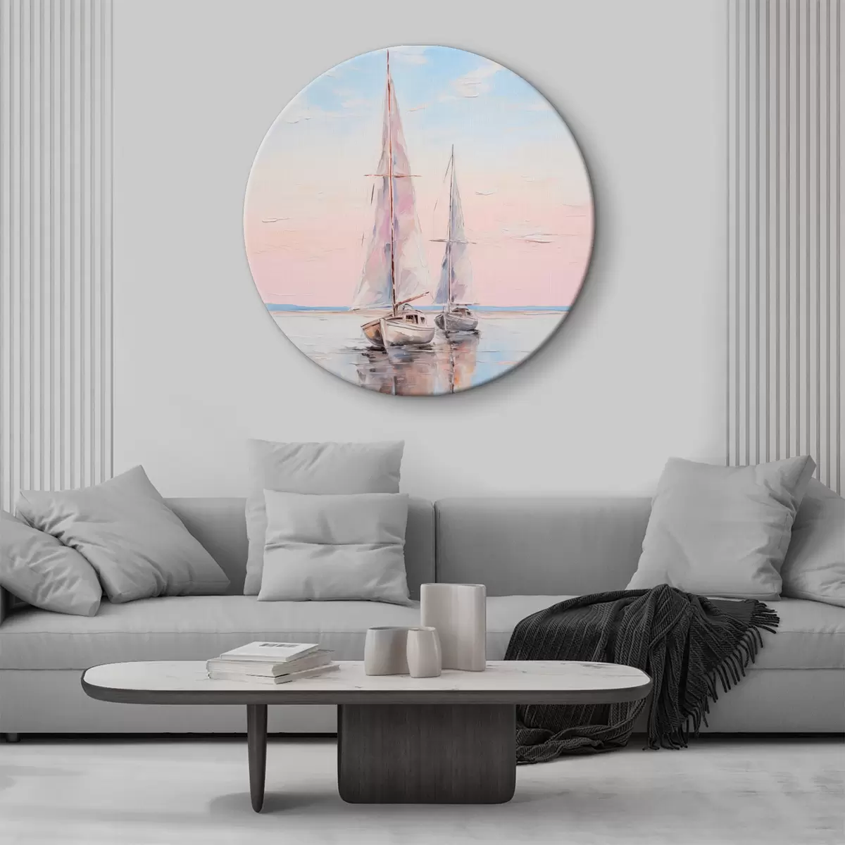Nuotrauka Ramioje jūroje plaukiojančios burinės valtys su rausvomis burėmis, valčių atspindžiai vandenyje, švelnios pastelinės spalvos Nr r45558