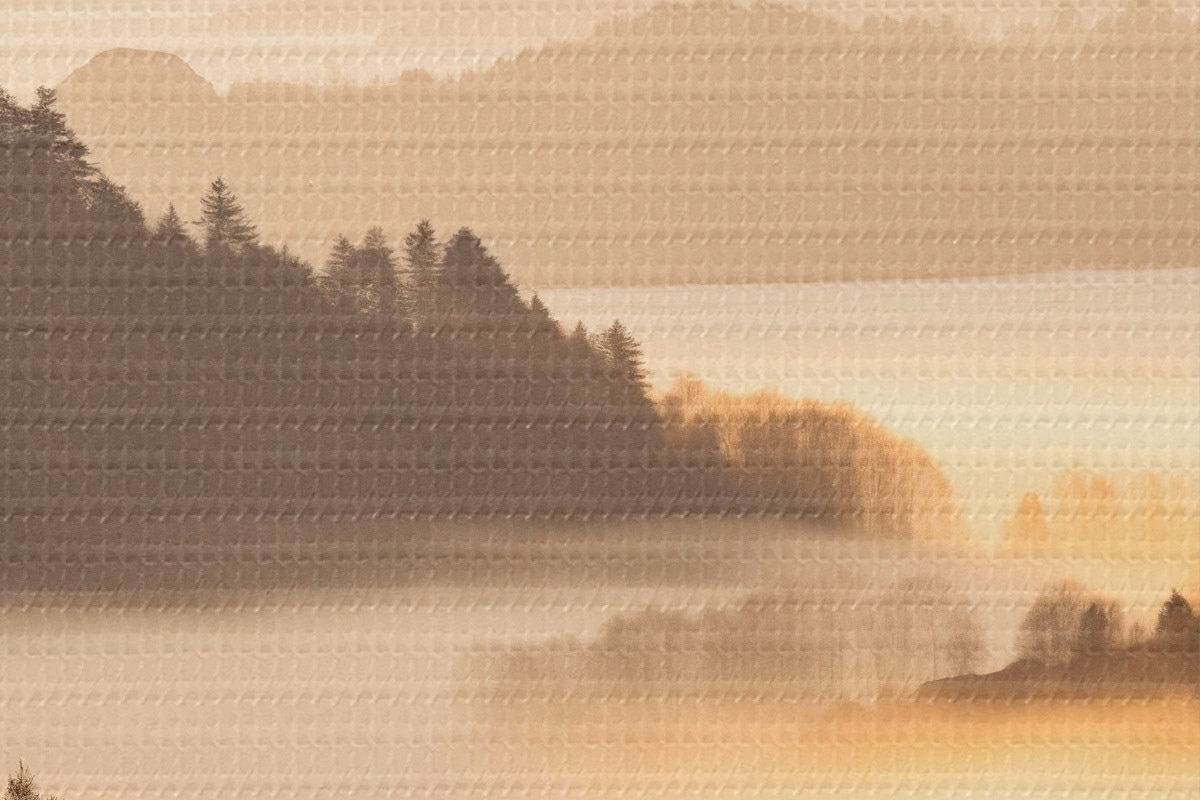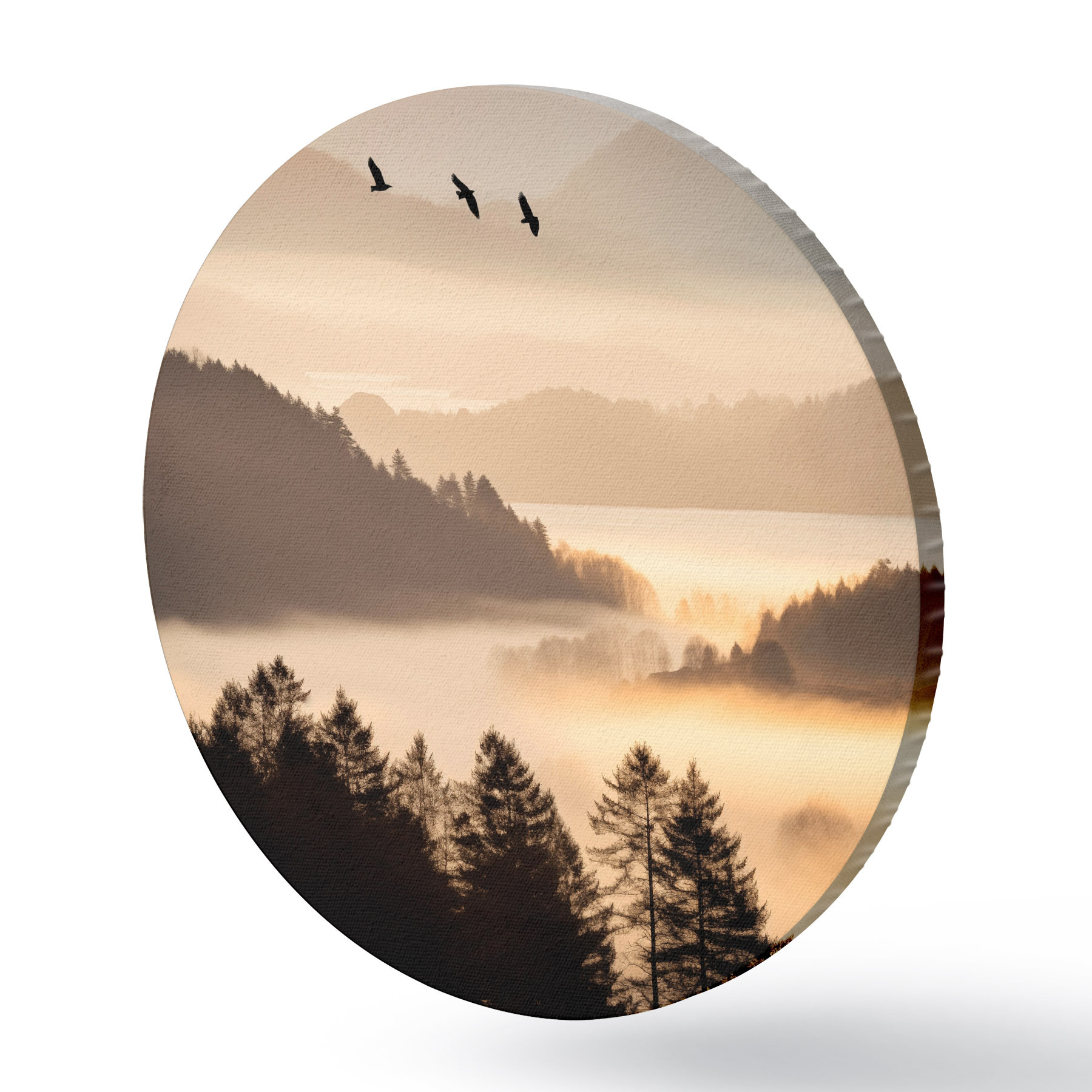 Nuotrauka Kalnų kraštovaizdis su mišku ir danguje skrendančiais paukščiais, visa tai dengia storas rūko sluoksnis saulėtekio metu Nr r45564