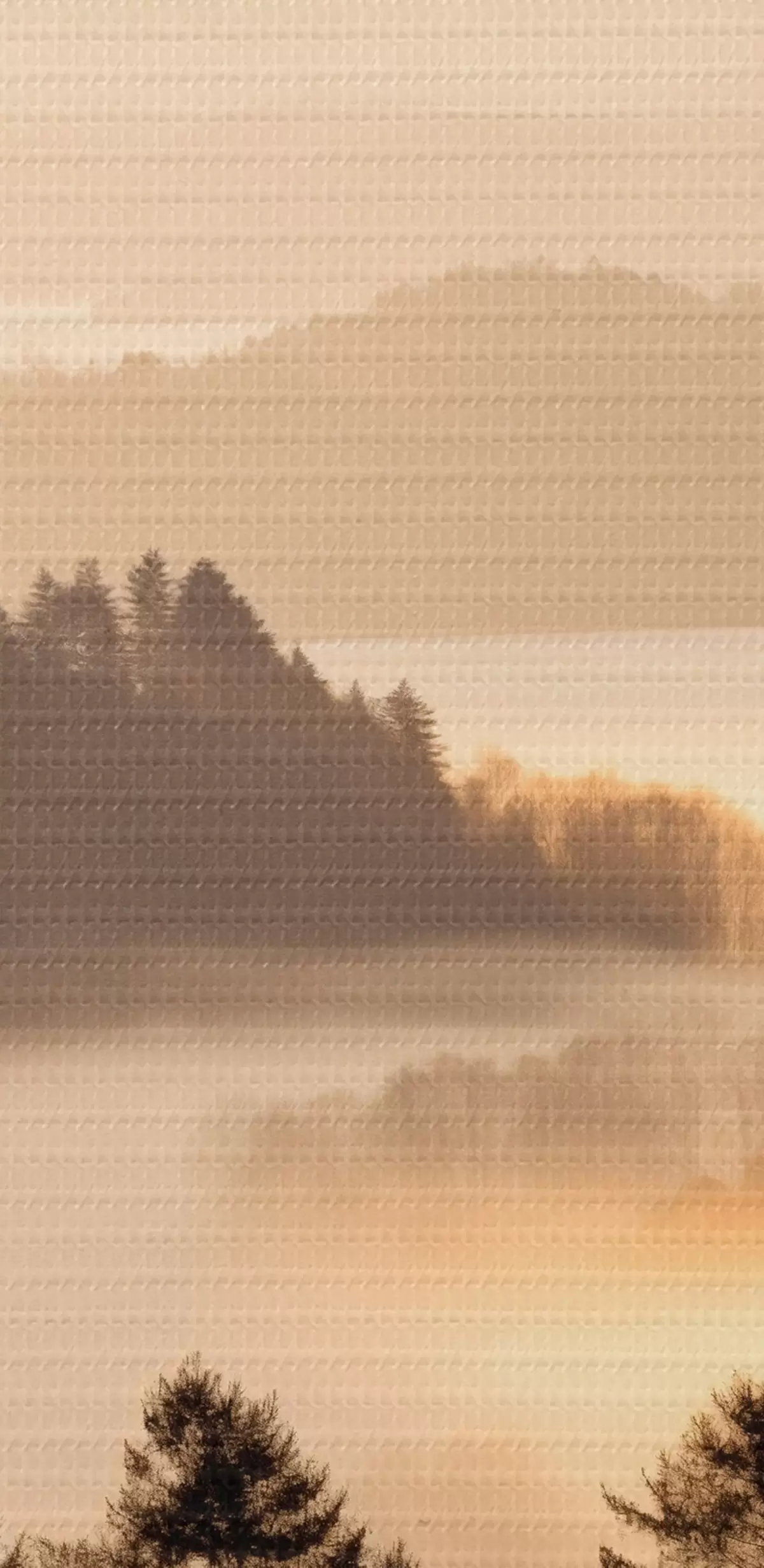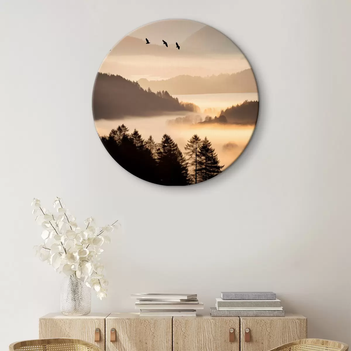 Nuotrauka Kalnų kraštovaizdis su mišku ir danguje skrendančiais paukščiais, visa tai dengia storas rūko sluoksnis saulėtekio metu Nr r45564