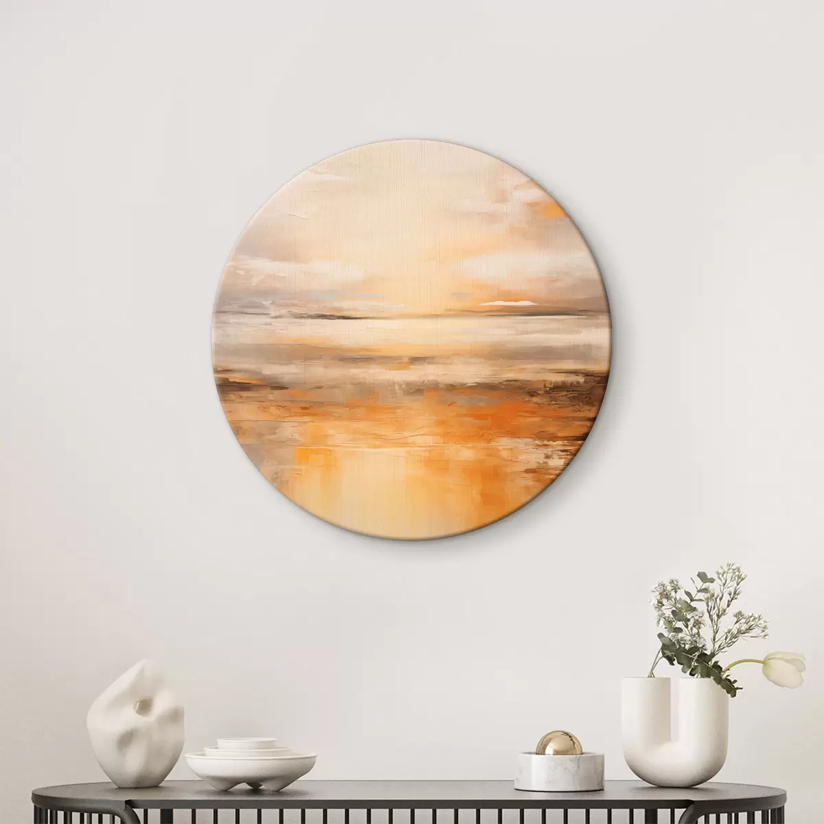 Nuotrauka Abstraktus paplūdimio peizažas su ramiu vandenynu, oranžiniu smėliu ir debesuotu dangumi su saule Nr r45567
