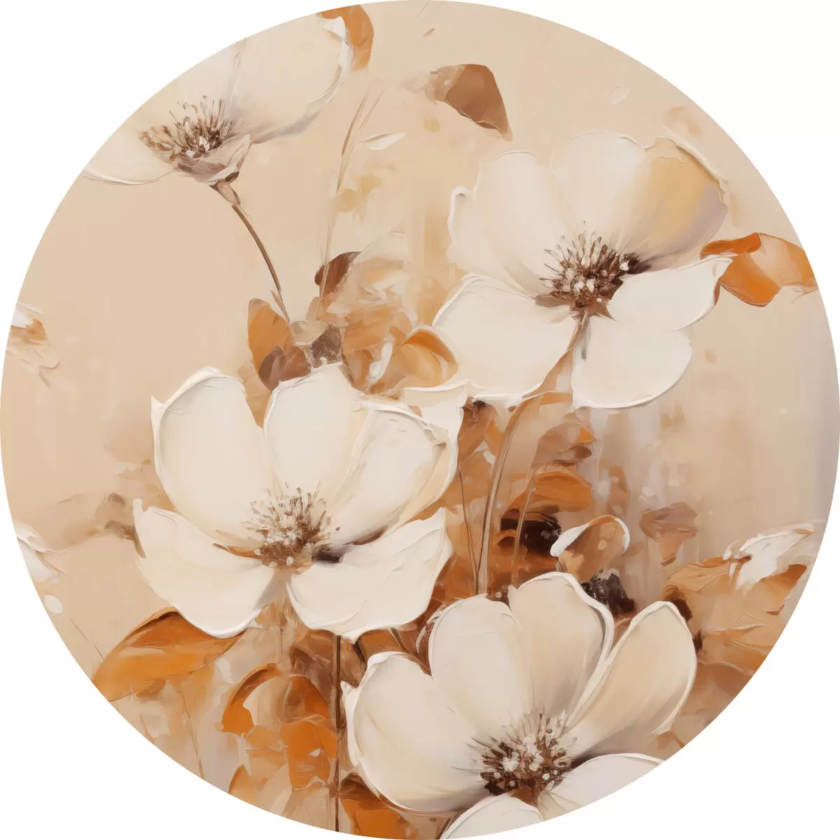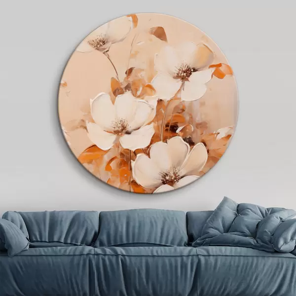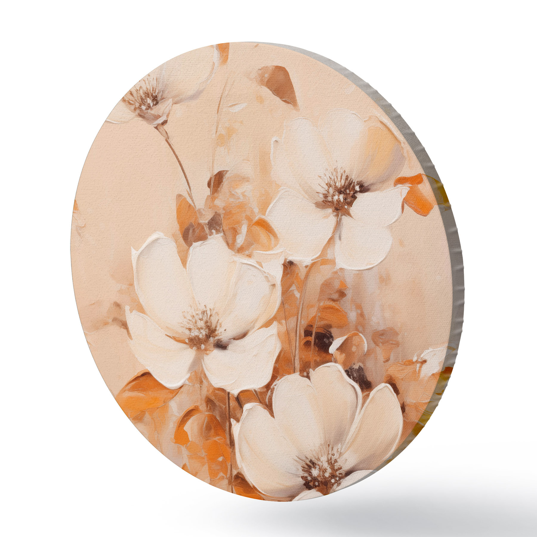 Apvalūs paveikslai Baltos gėlės su oranžiniais lapais, subtilūs potėpiai, šilta spalvų paletė, elegantiška kompozicija r45573