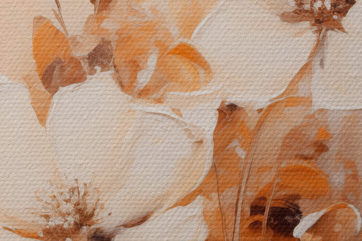 Nuotrauka Baltos gėlės su oranžiniais lapais, subtilūs potėpiai, šilta spalvų paletė, elegantiška kompozicija Nr r45573