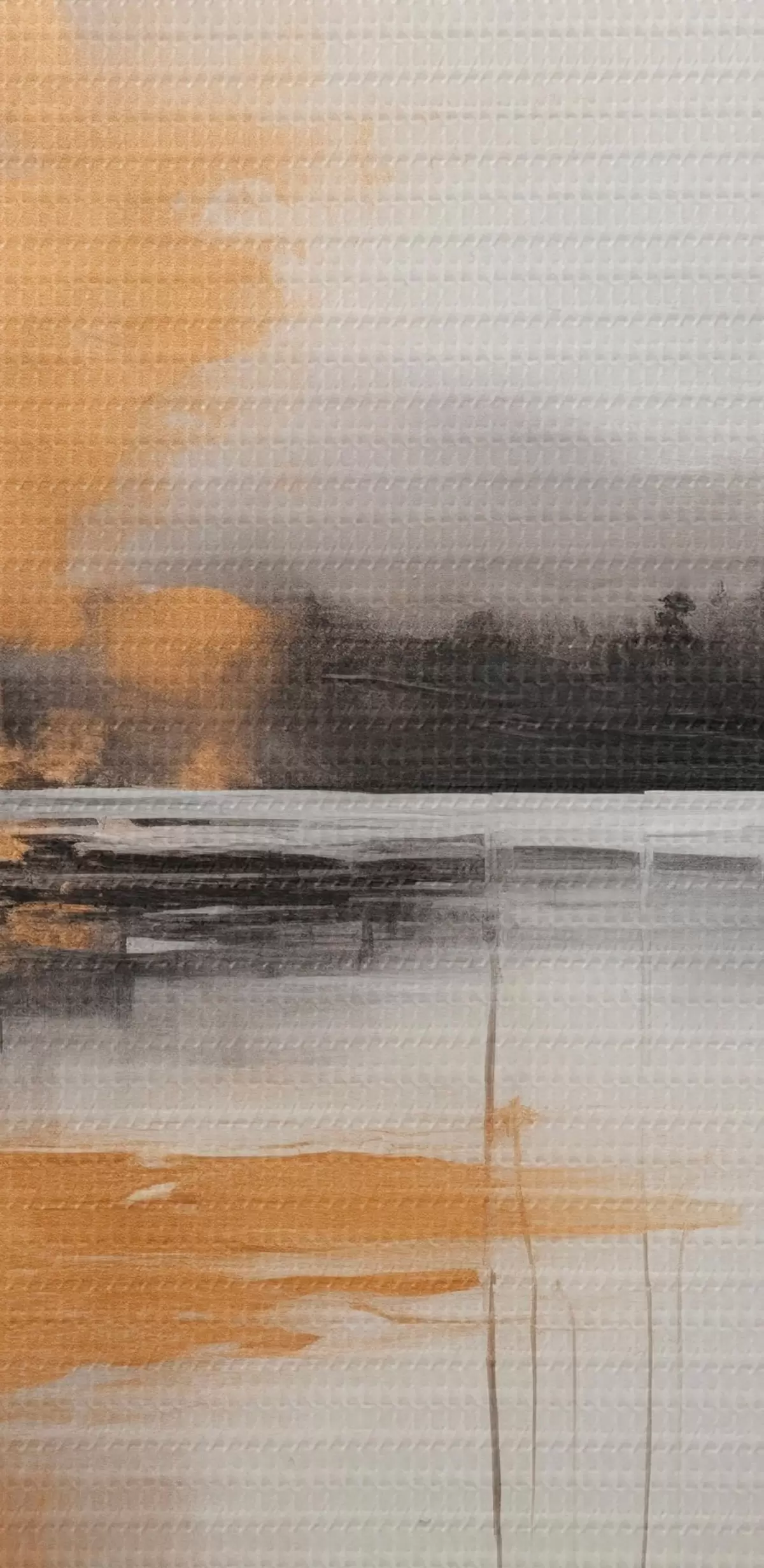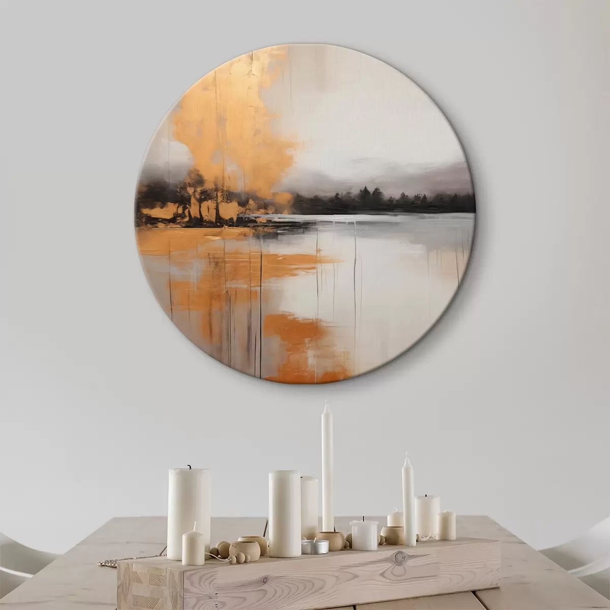 Nuotrauka Abstraktus kraštovaizdis su ežeru, medžiu ir geltonu rūku , vanduo atspindi debesuotą dangų Nr r45575