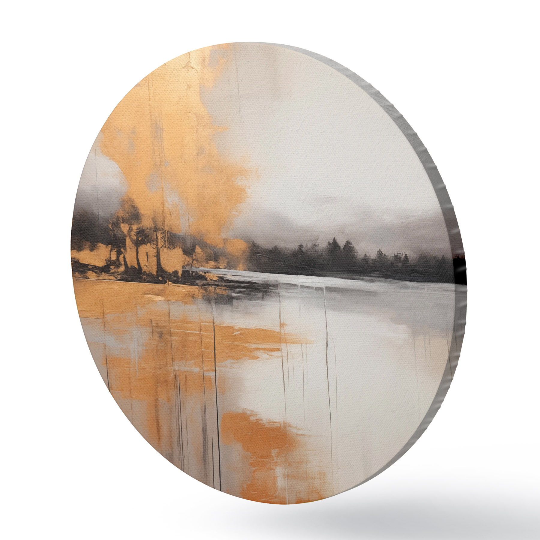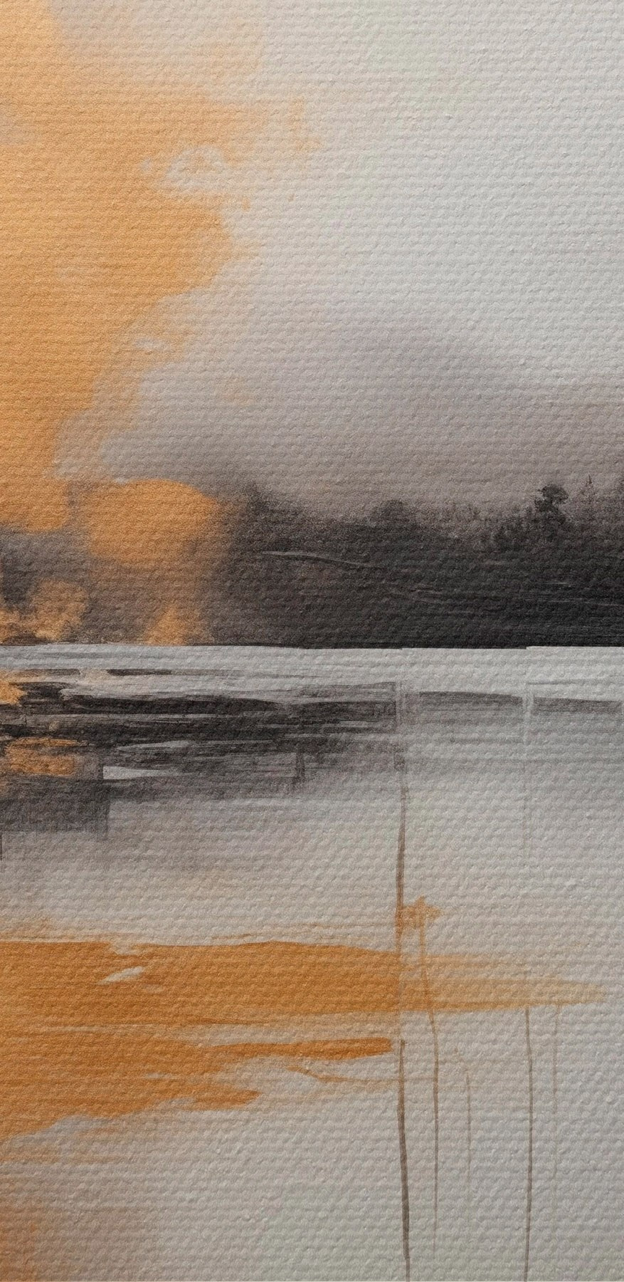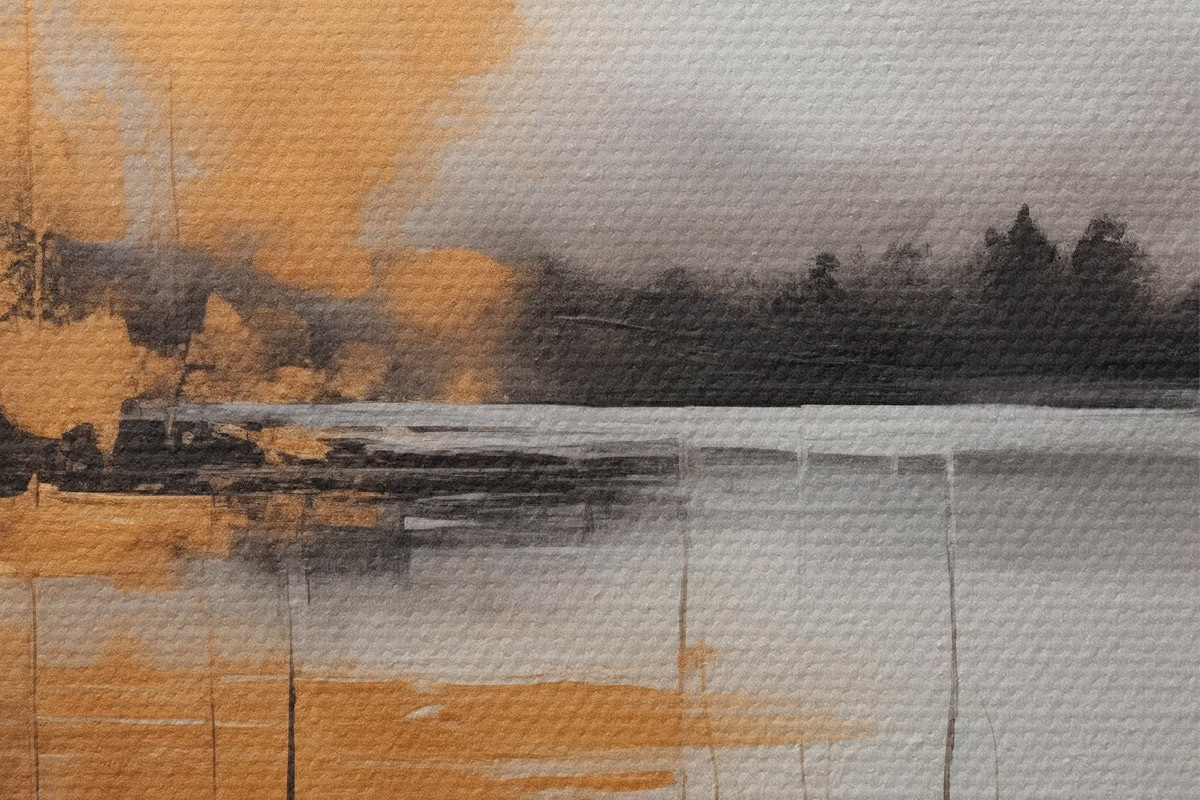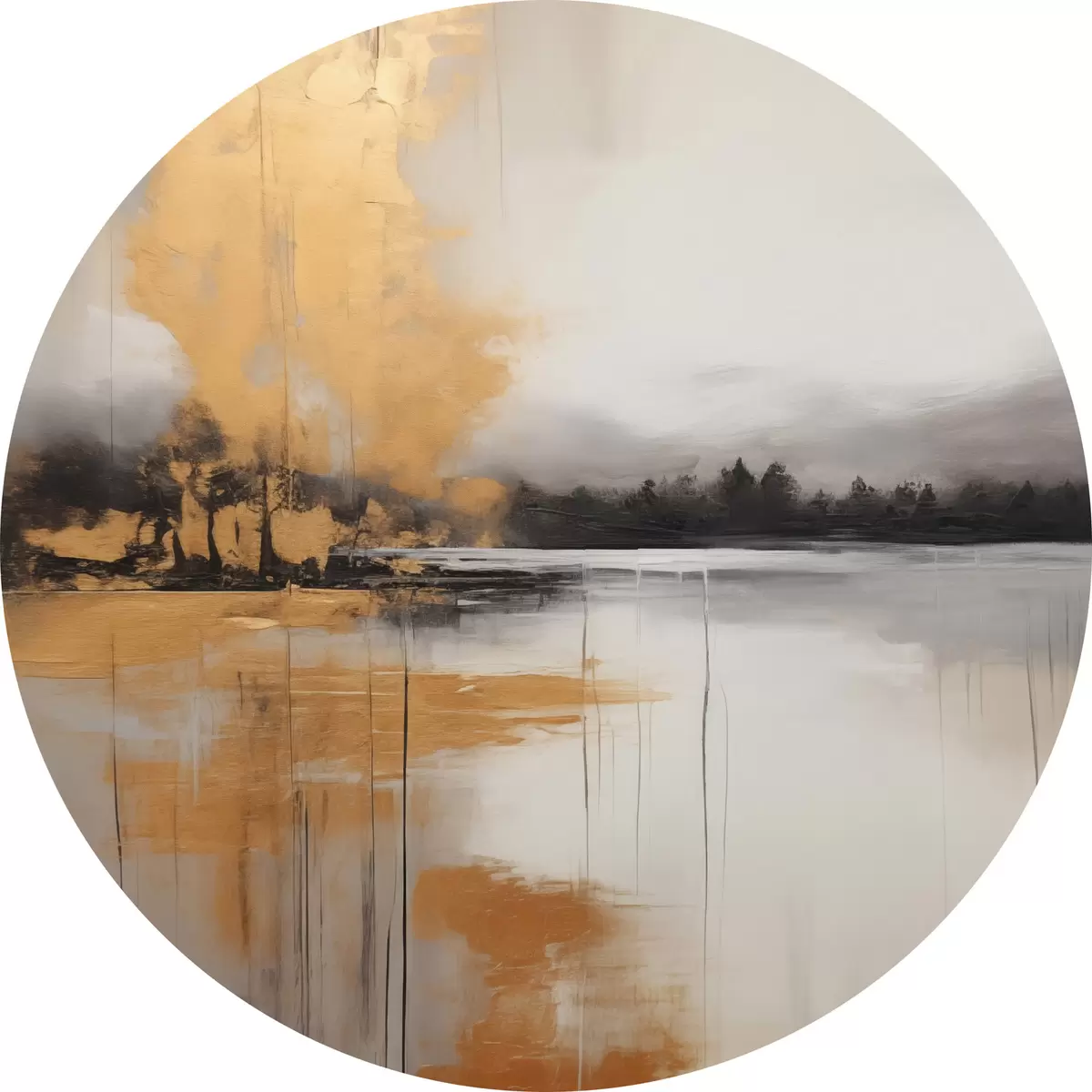 Nuotrauka Abstraktus kraštovaizdis su ežeru, medžiu ir geltonu rūku , vanduo atspindi debesuotą dangų Nr r45575