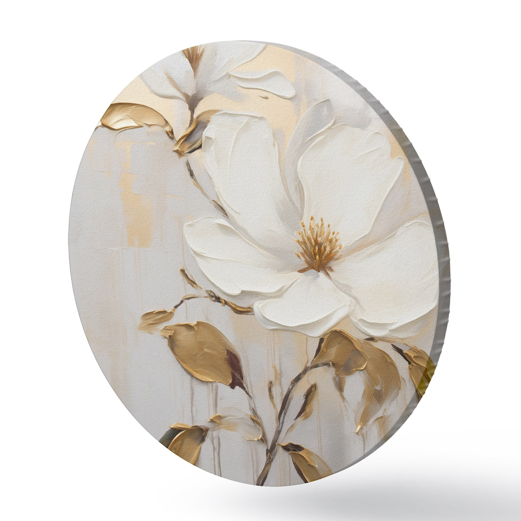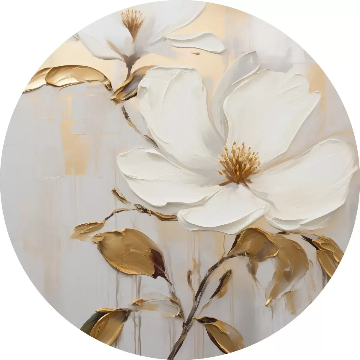 Apvalūs paveikslai Dvi baltos gėlės su geltonai oranžiniais lapais šviesiame fone r45691
